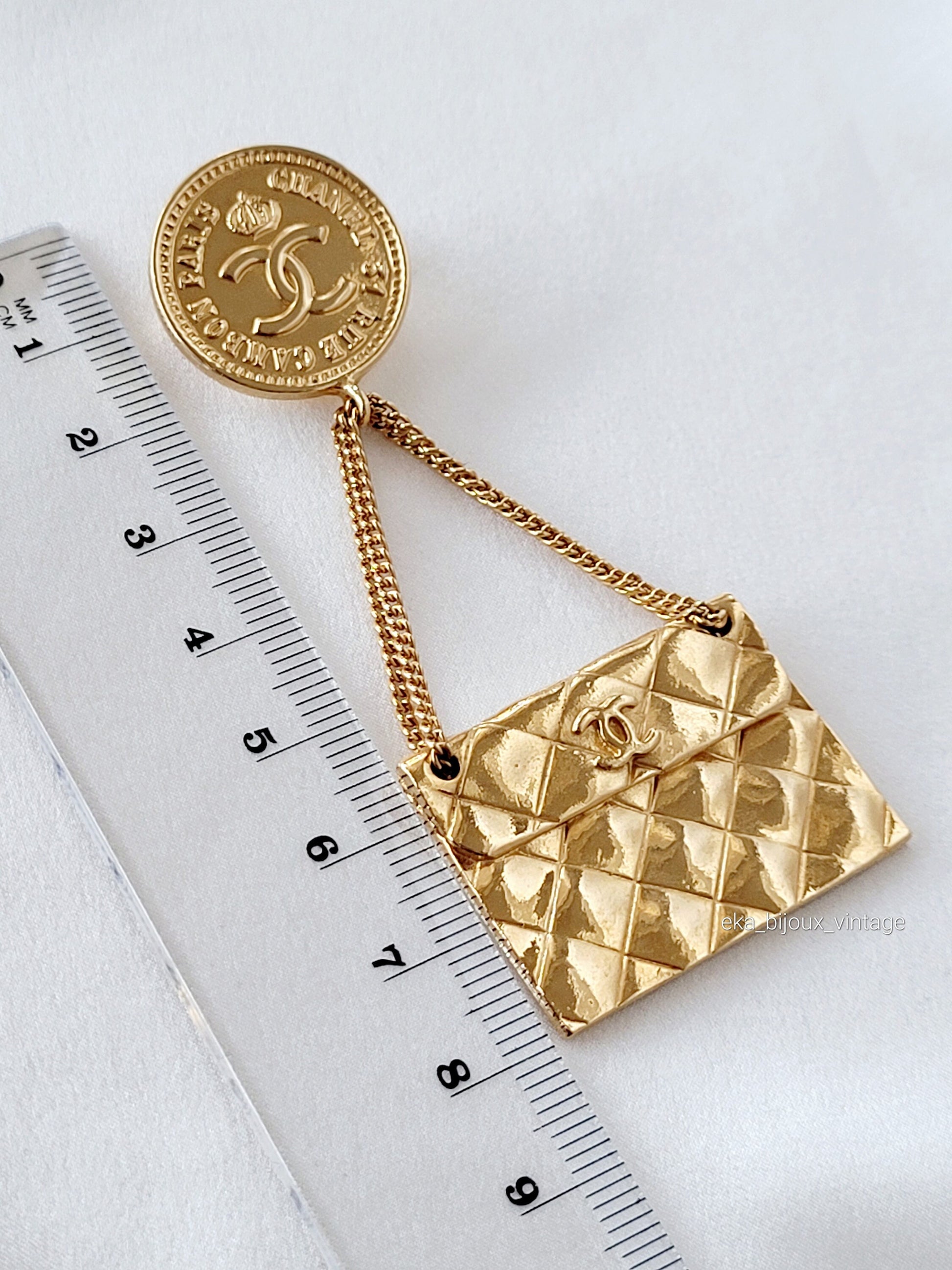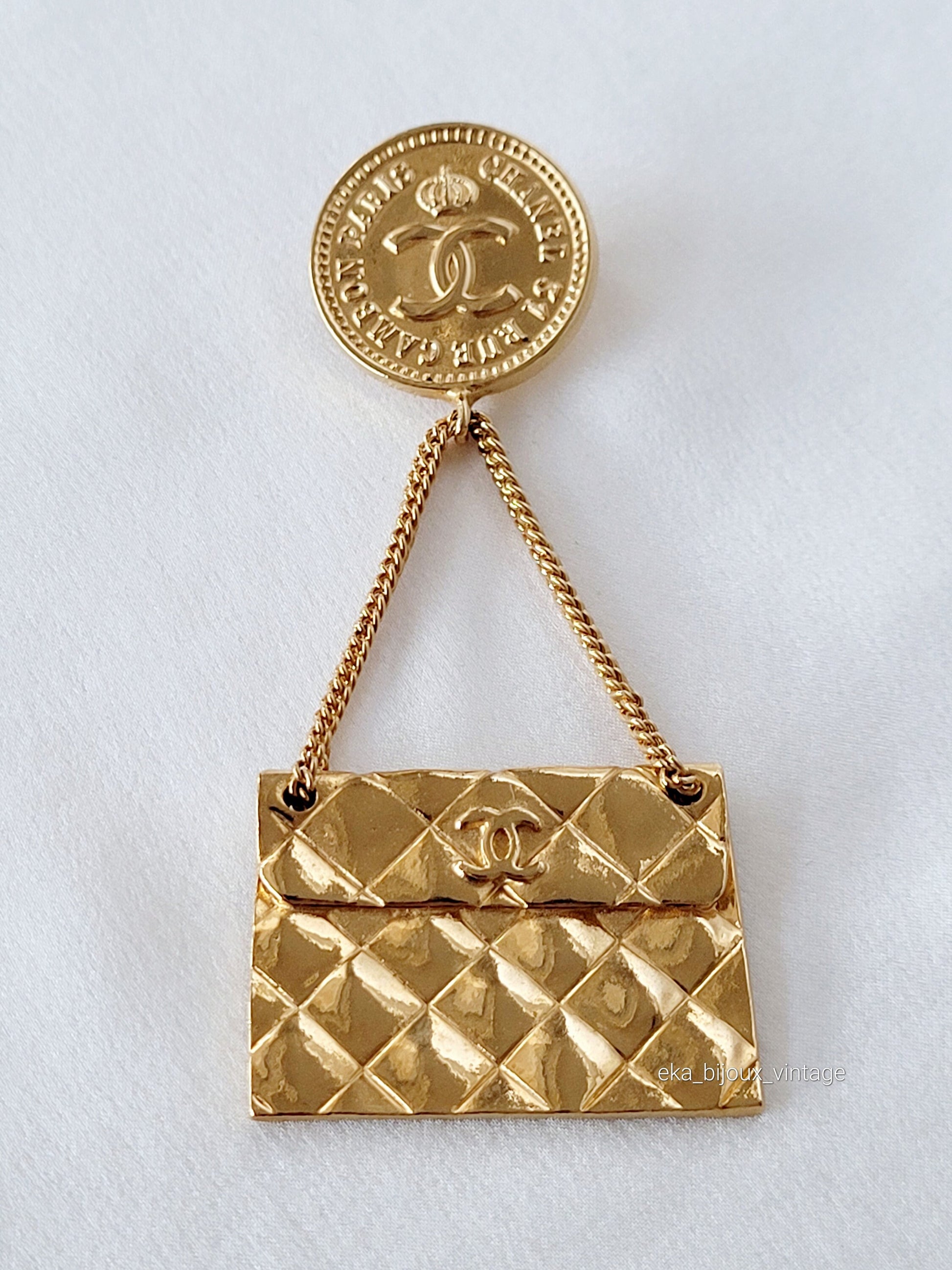 Authentic and magnificent Chanel brooch in gold metal with medallion signed "Chanel 31 rue Cambon Paris" decorated with an important charm representing the "Mademoiselle quilted" bag.