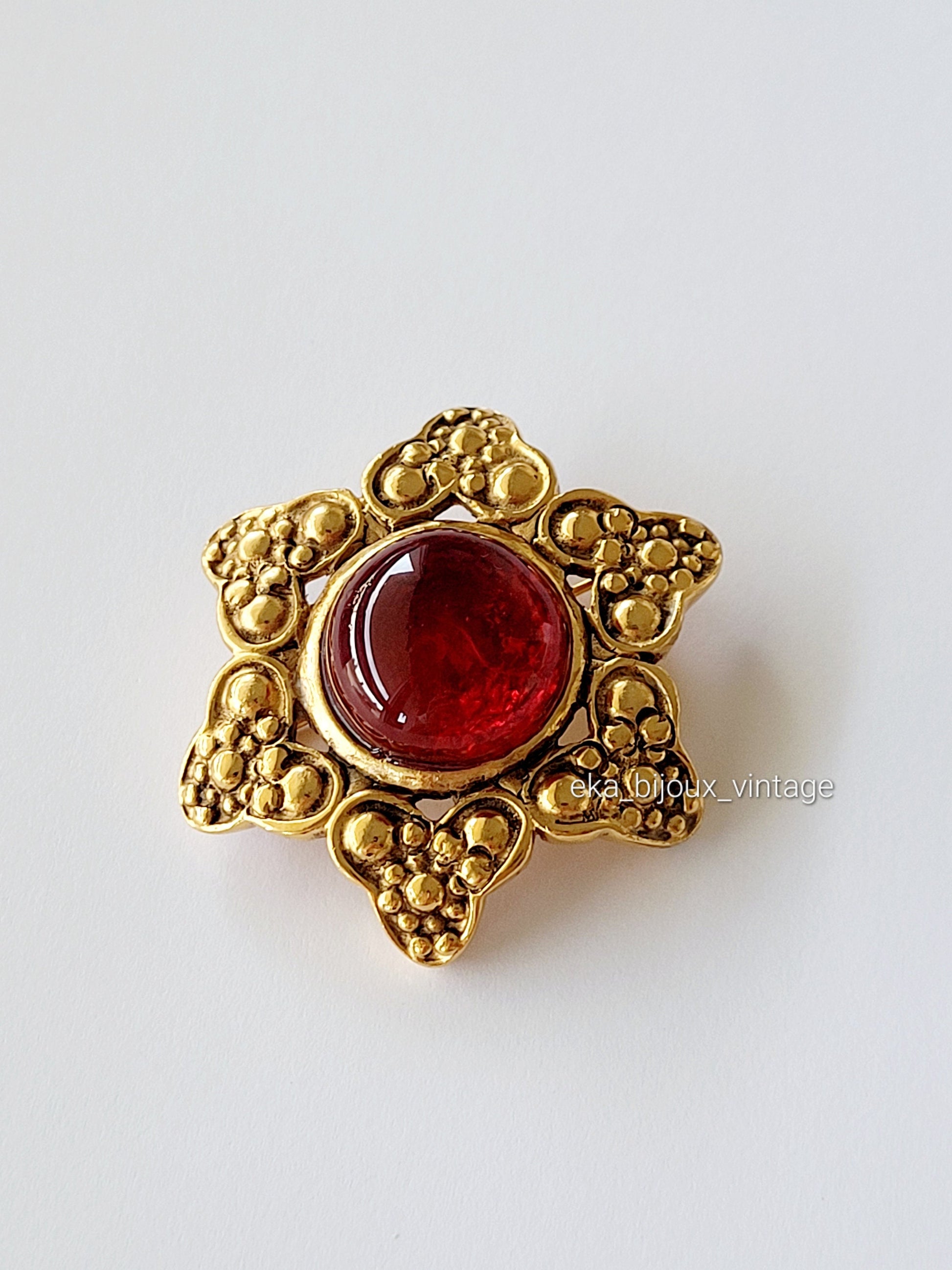 Authentic vintage Chanel Gripoix brooch with a large red glass paste cabochon.