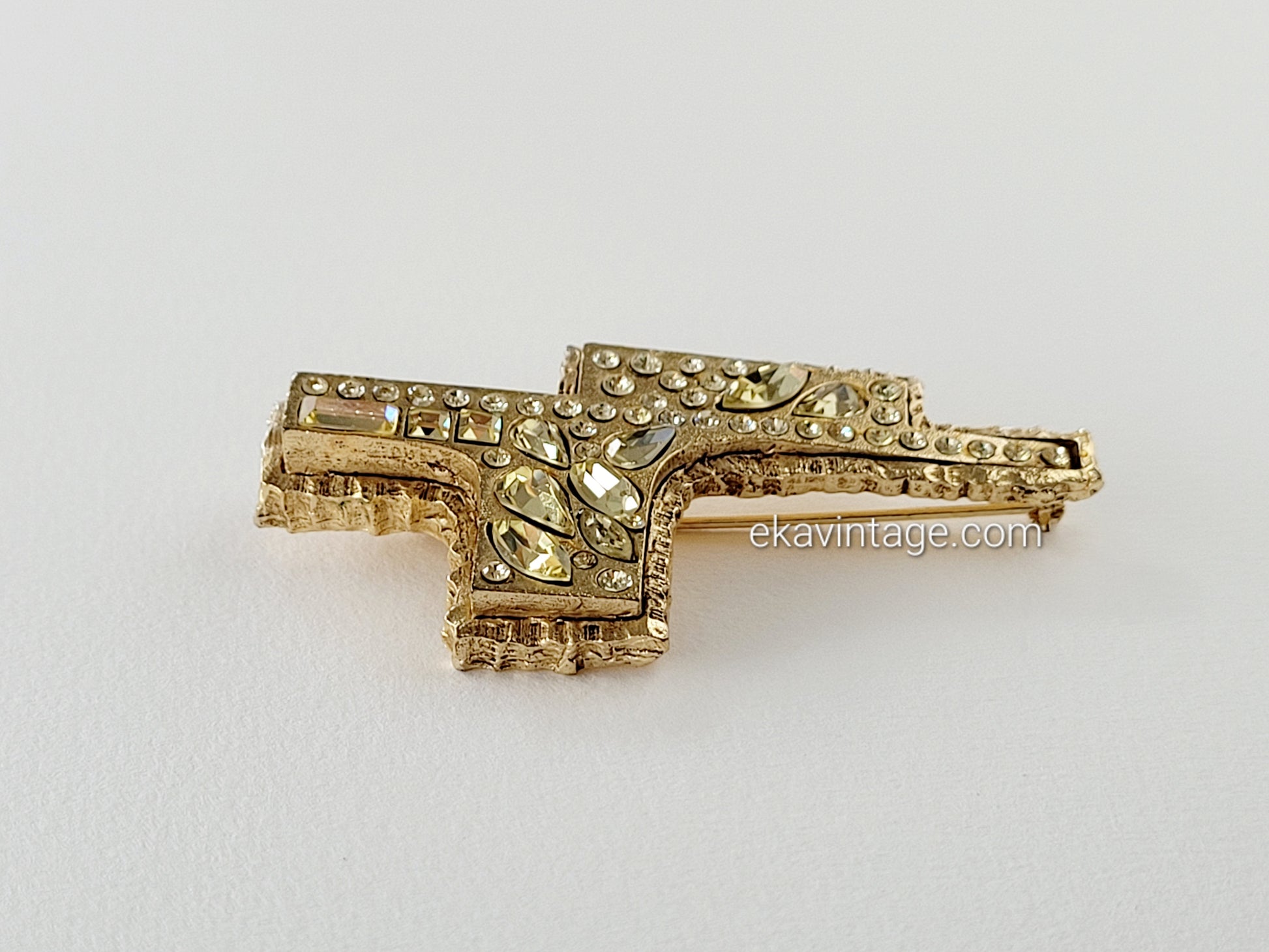 Authentique et magnifique broche vintage Christian Lacroix, en forme de croix en plaqué or et cristaux.