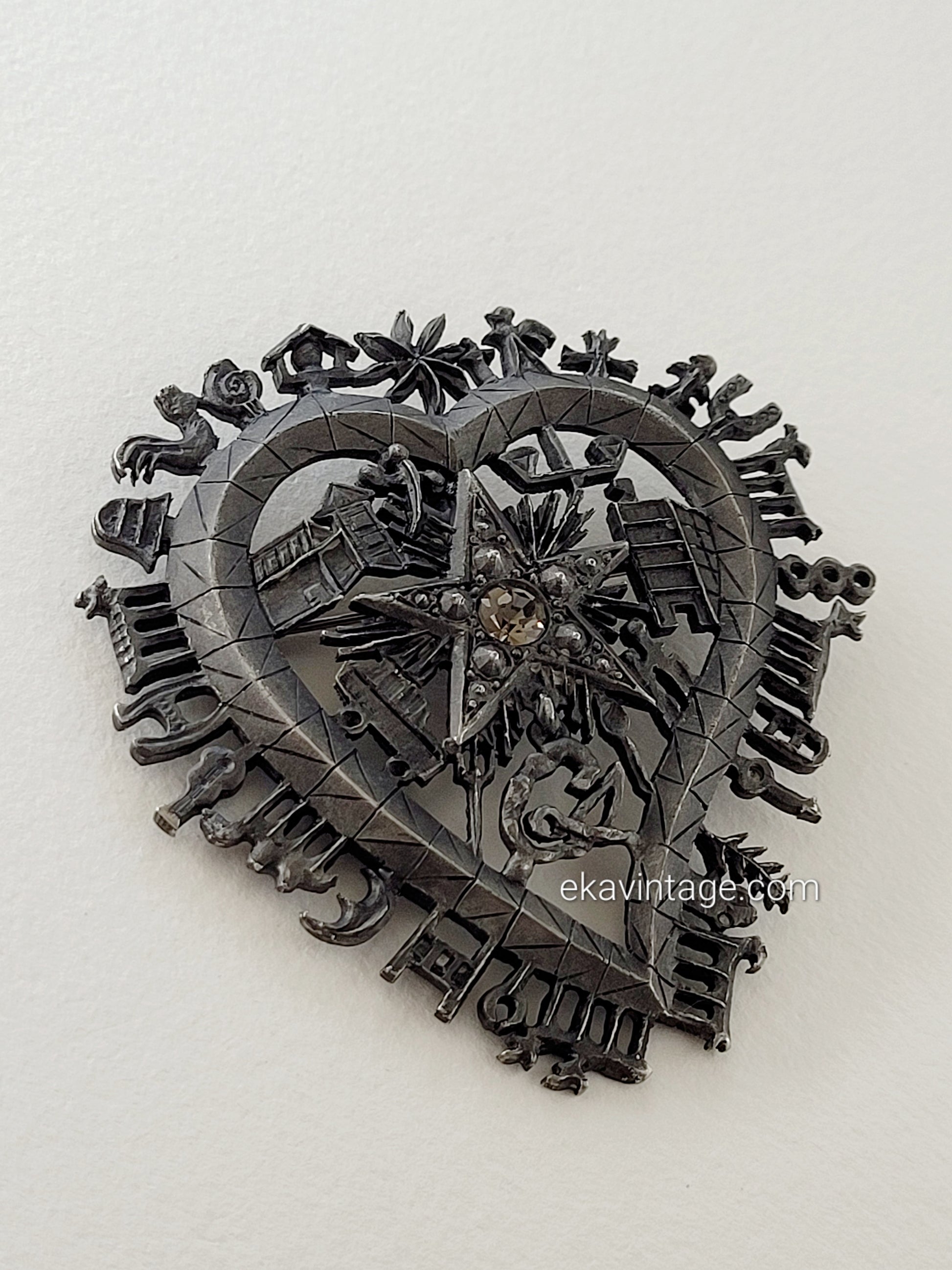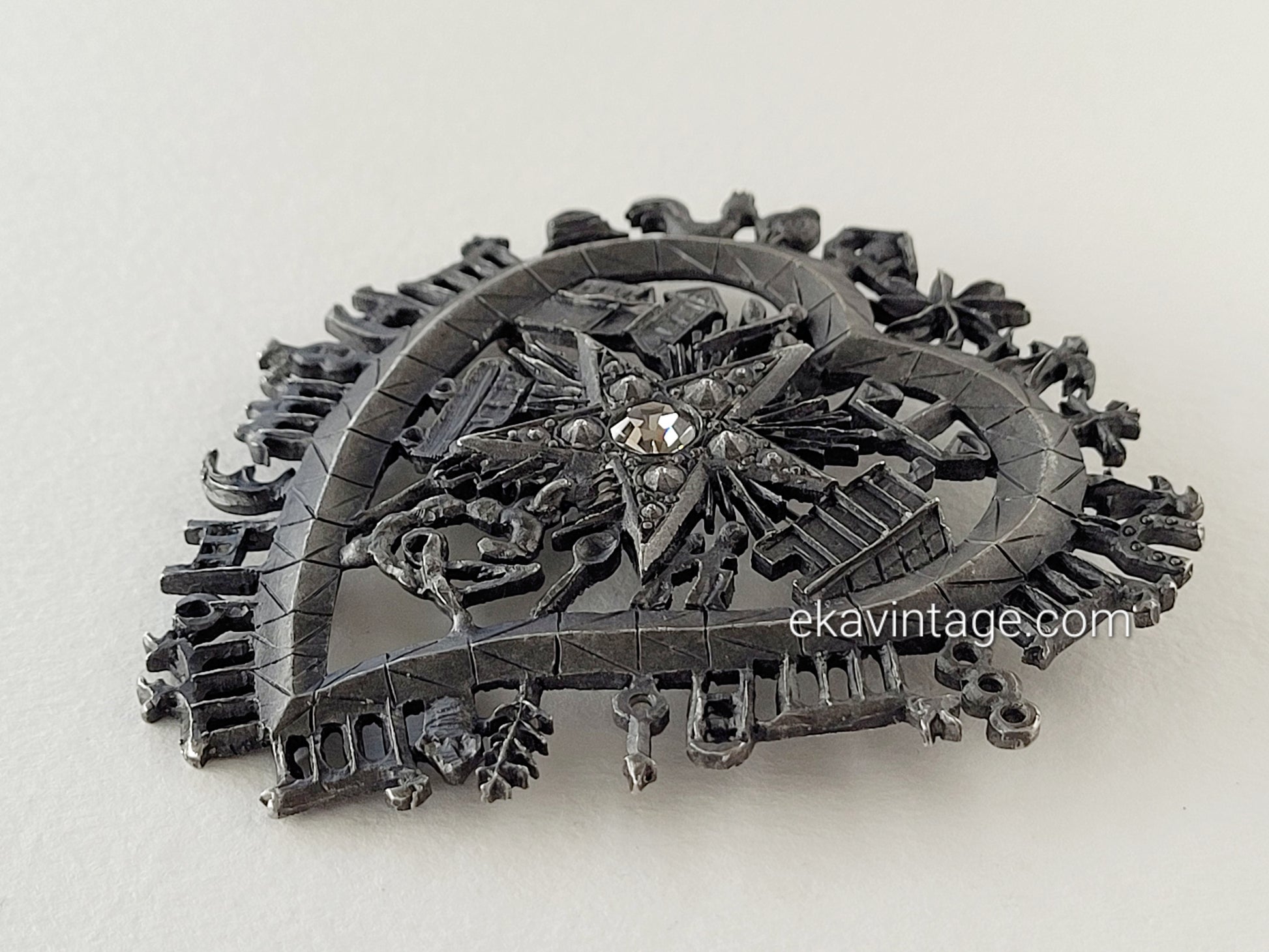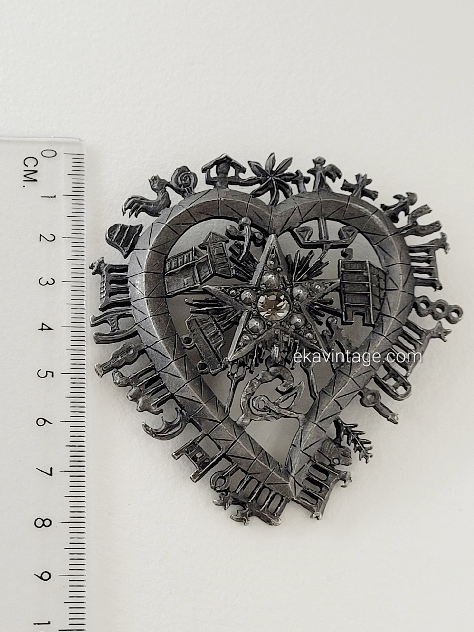 Authentic and magnificent very large Christian Lacroix brooch in gray metal, in the shape of a heart, with "CL" engraving. A rhinestone is located in the center of the jewel.