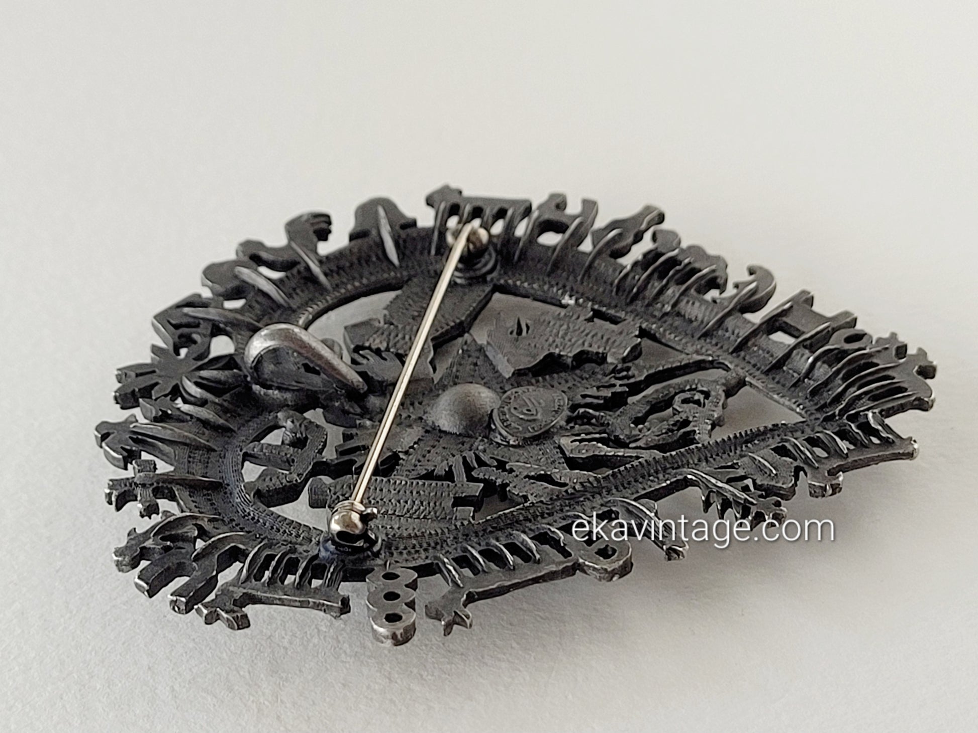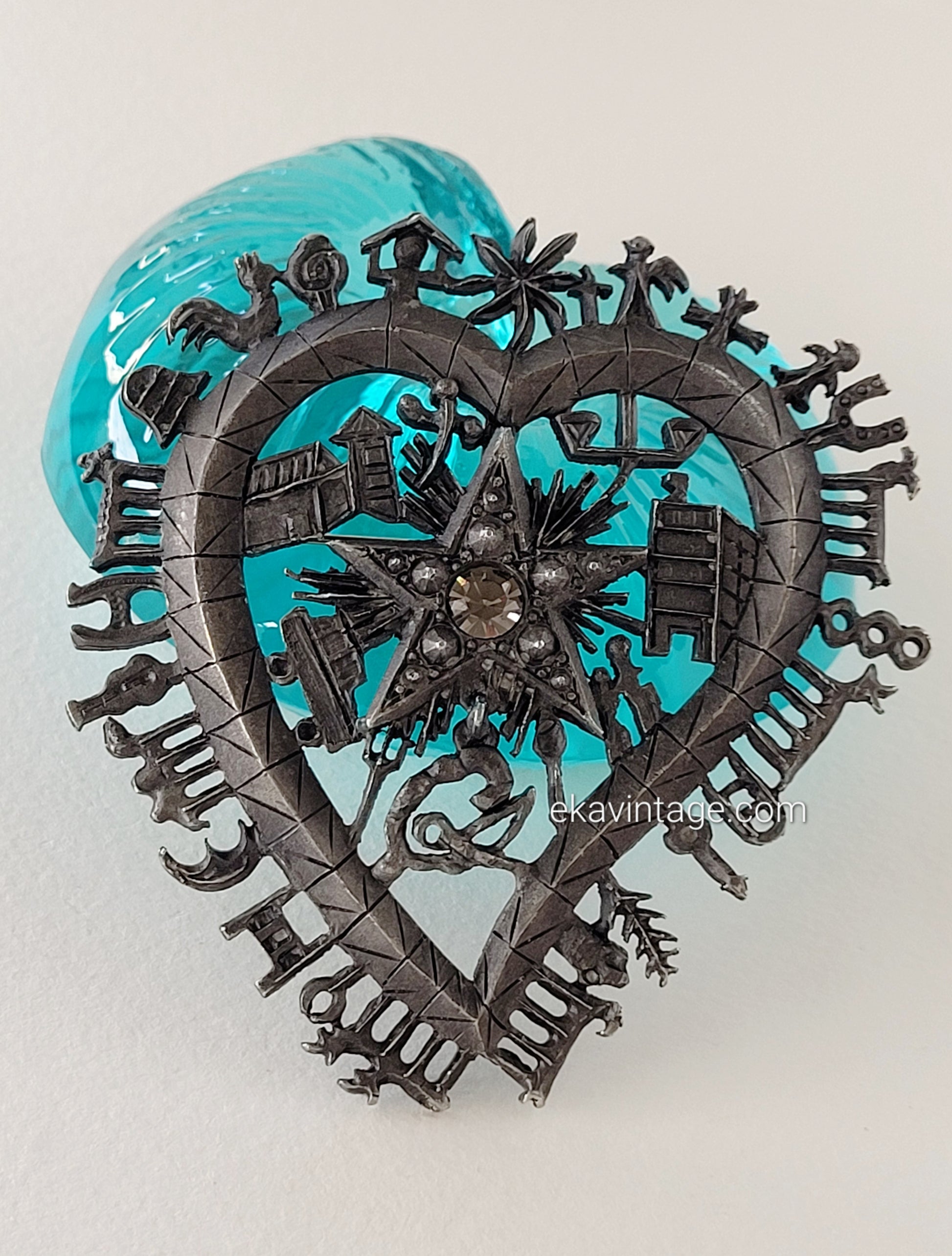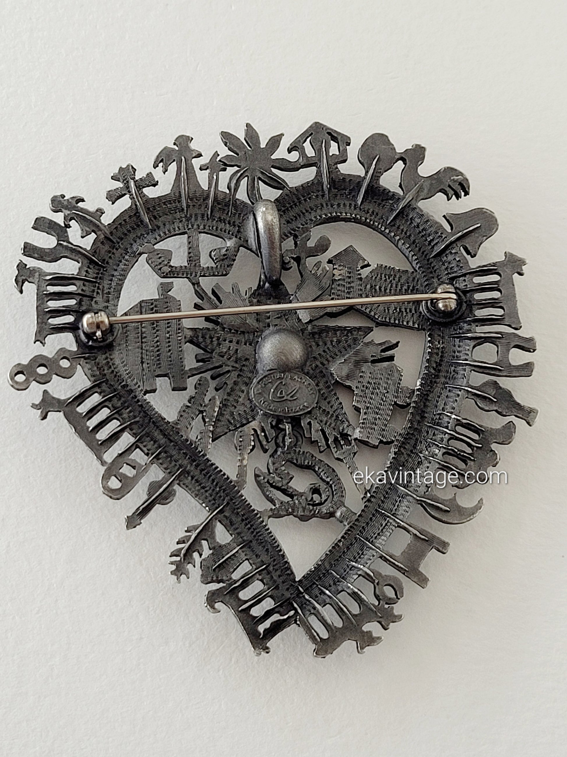 Authentic and magnificent very large Christian Lacroix brooch in gray metal, in the shape of a heart, with "CL" engraving. A rhinestone is located in the center of the jewel.