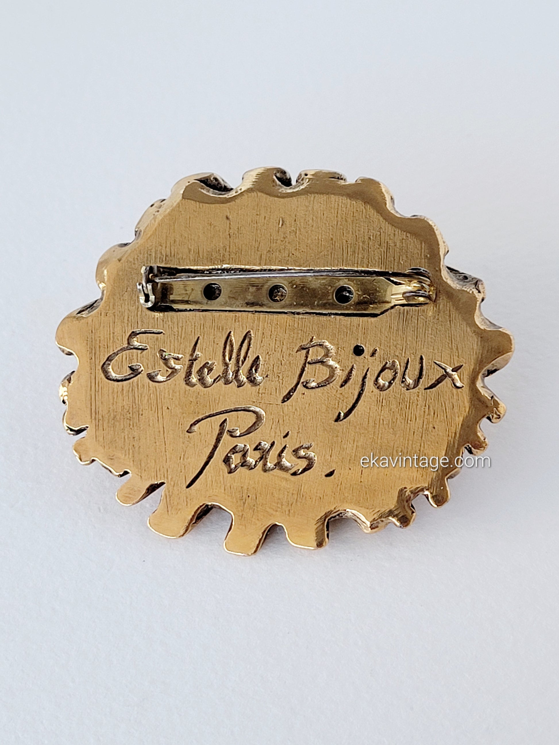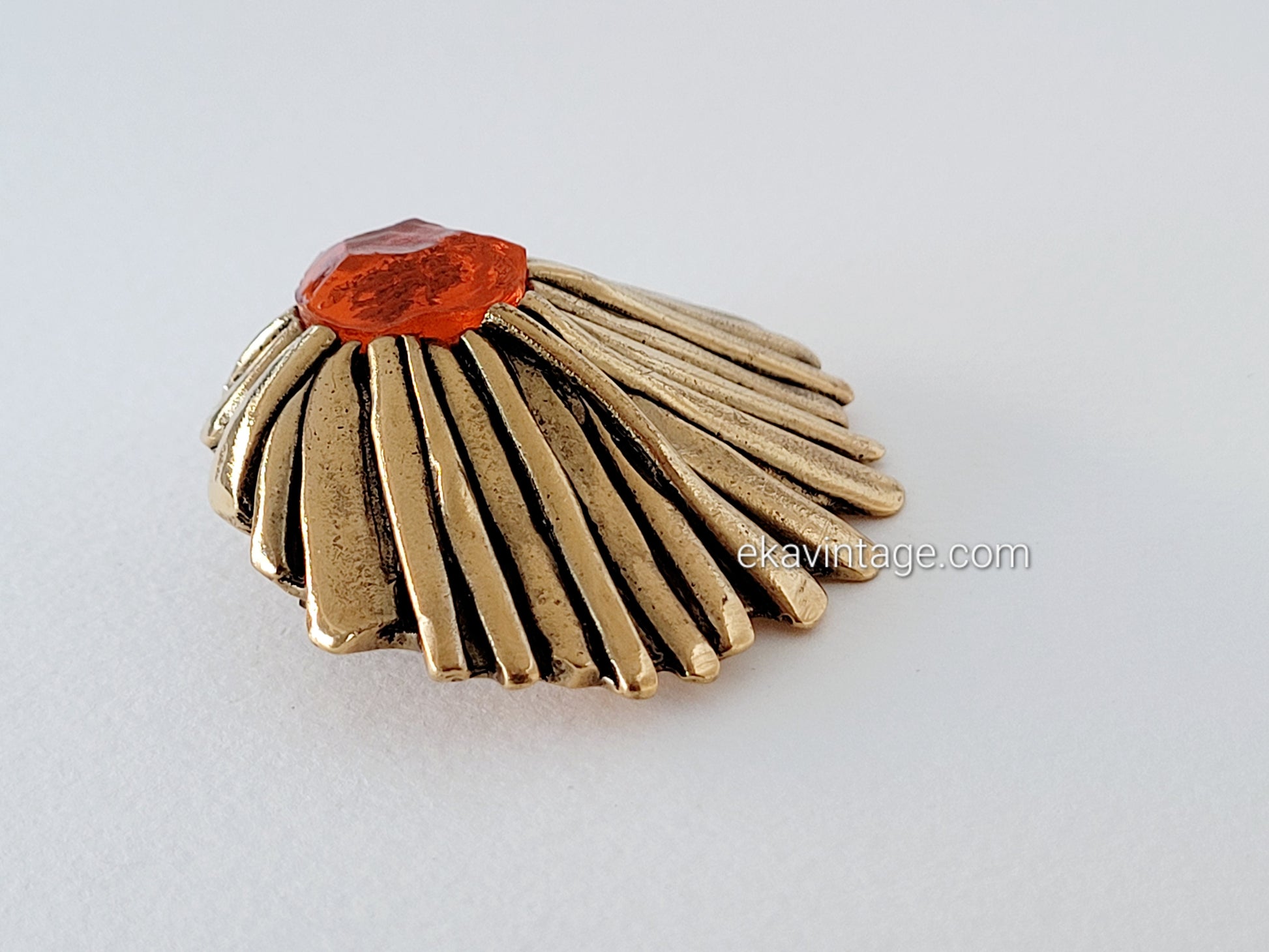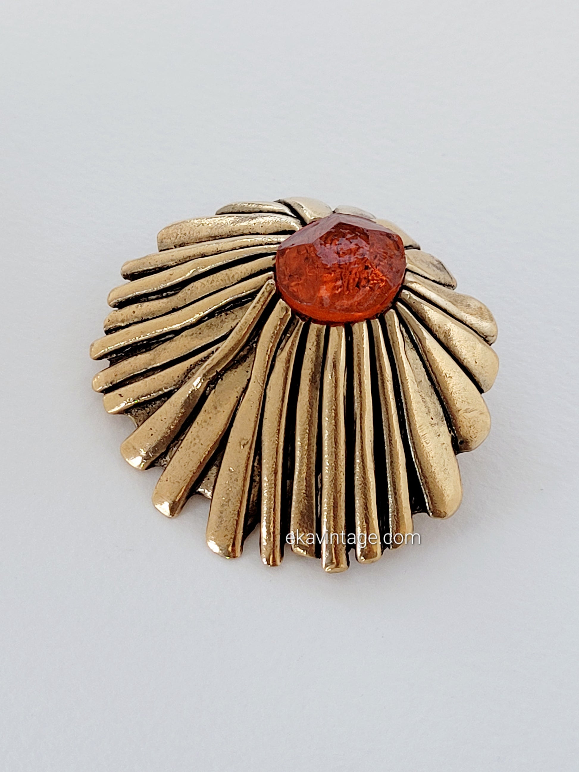 Magnifique broche Estelle Bijoux Paris vintage en résine doré avec un cabochon en résine orange.