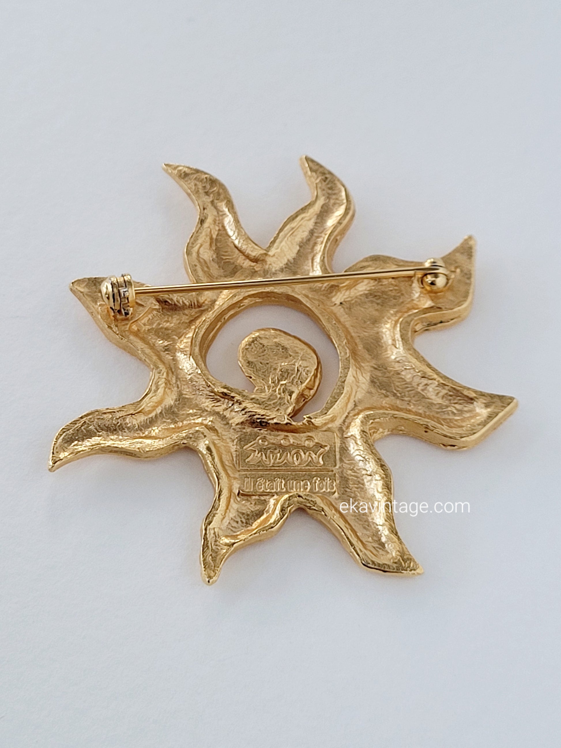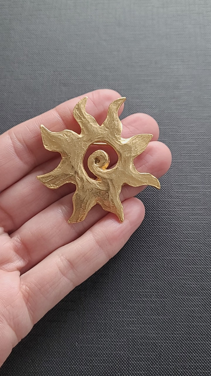 Très belle broche vintage en plaqué or martelé en forme de soleil.