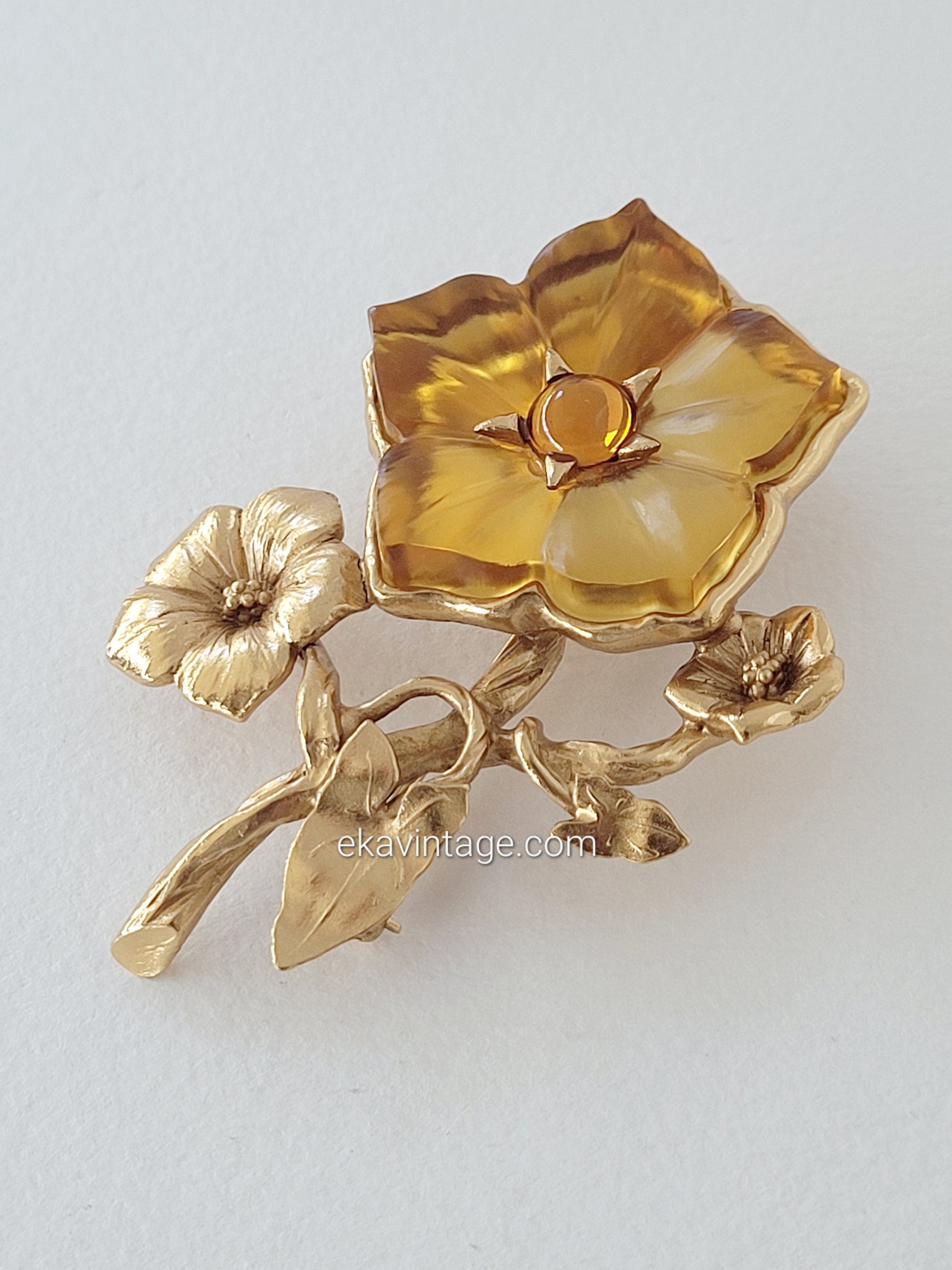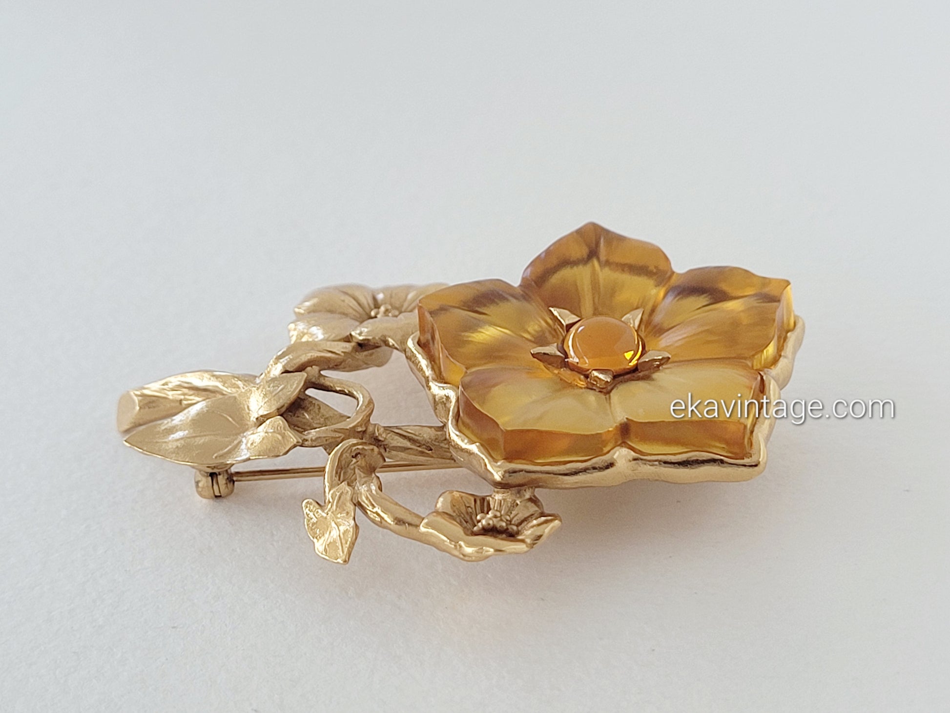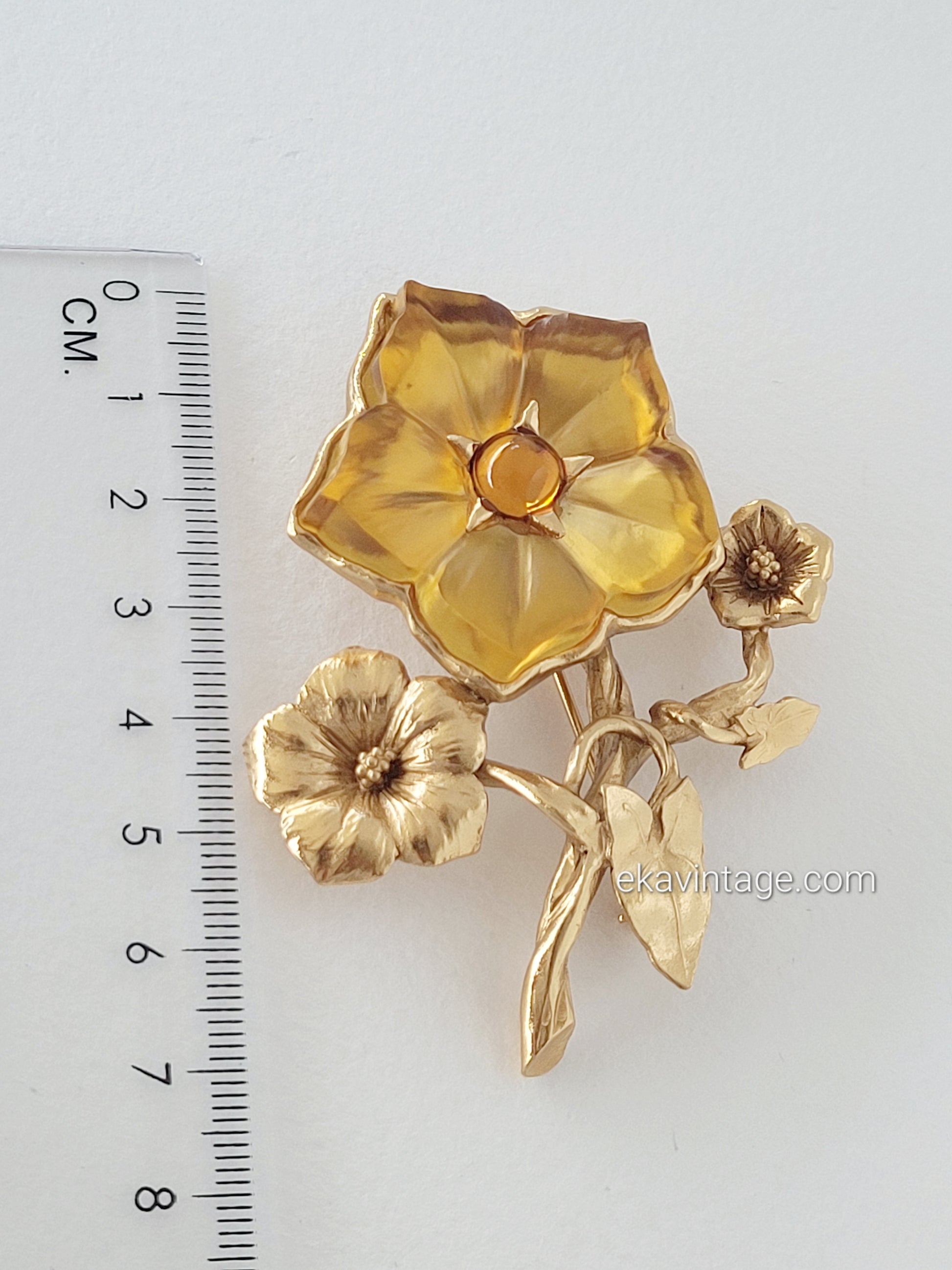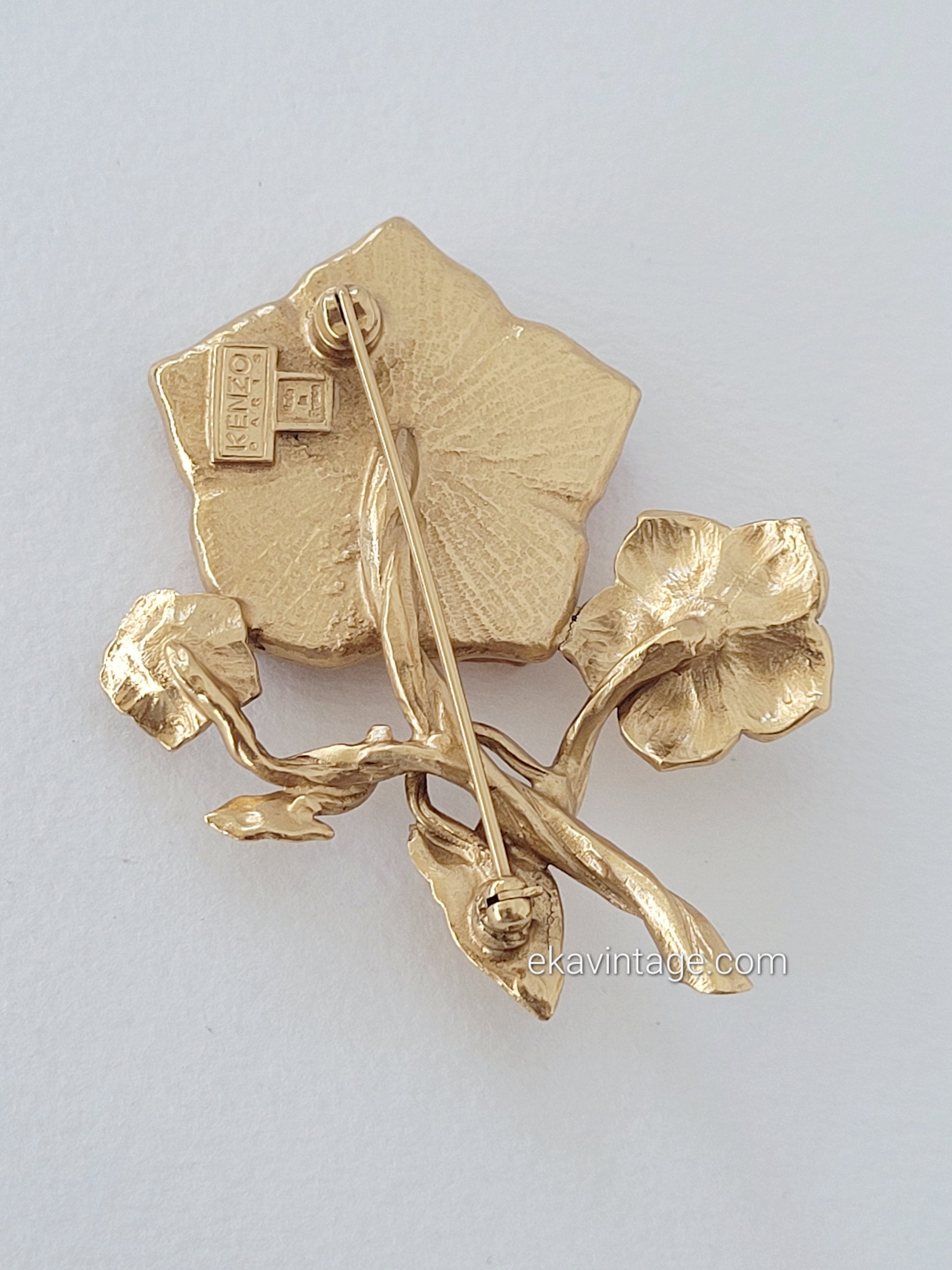 Magnifique et authentique broche vintage Kenzo Paris en plaqué or avec une fleur en lucite.