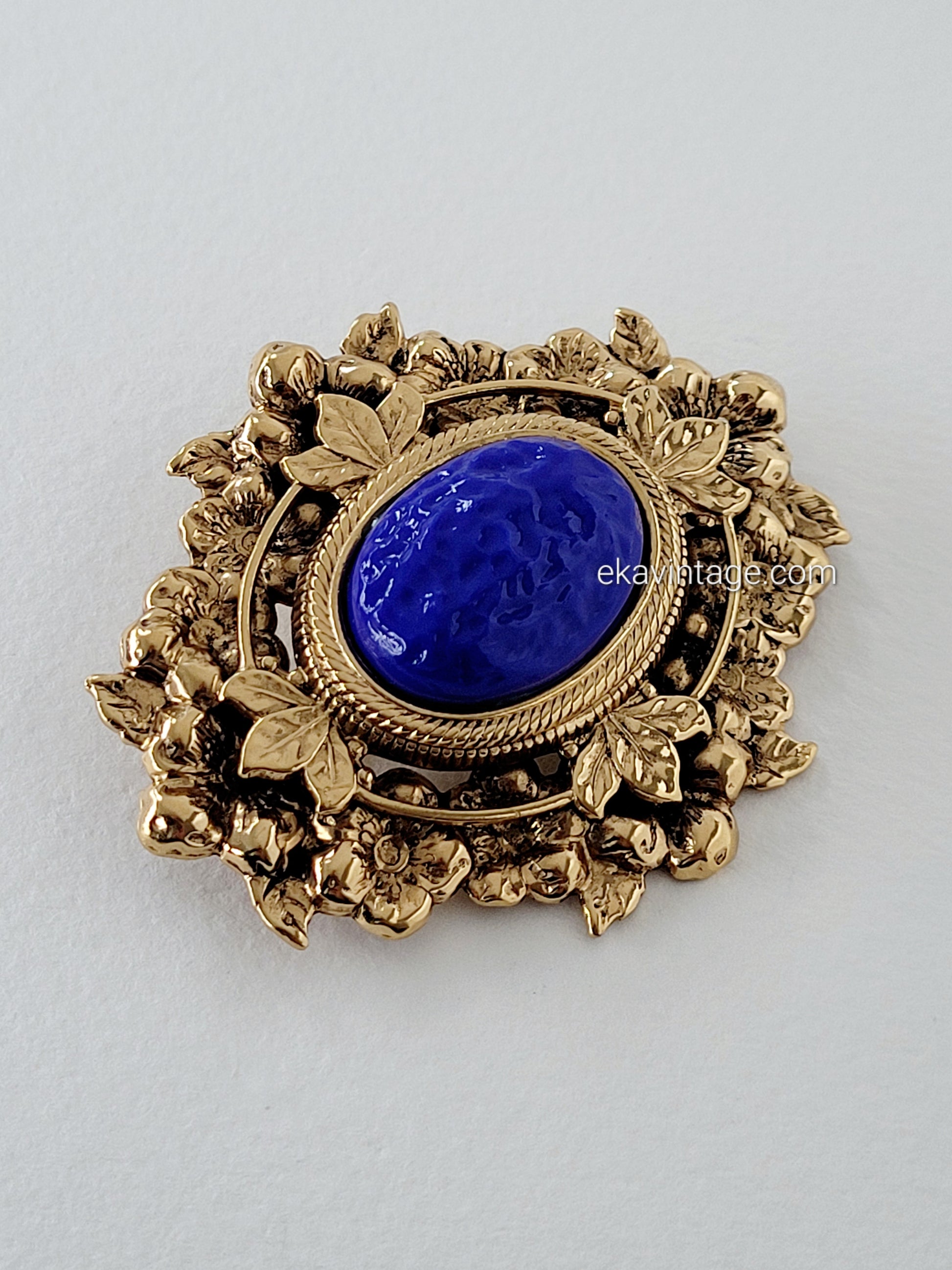 Très belle broche Réminiscence en métal doré avec un cabochon en pâte de verre de couleur bleu.