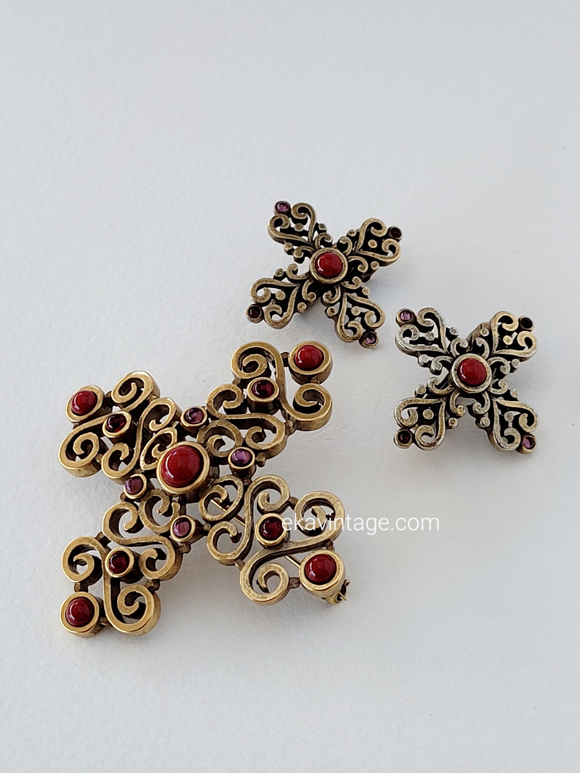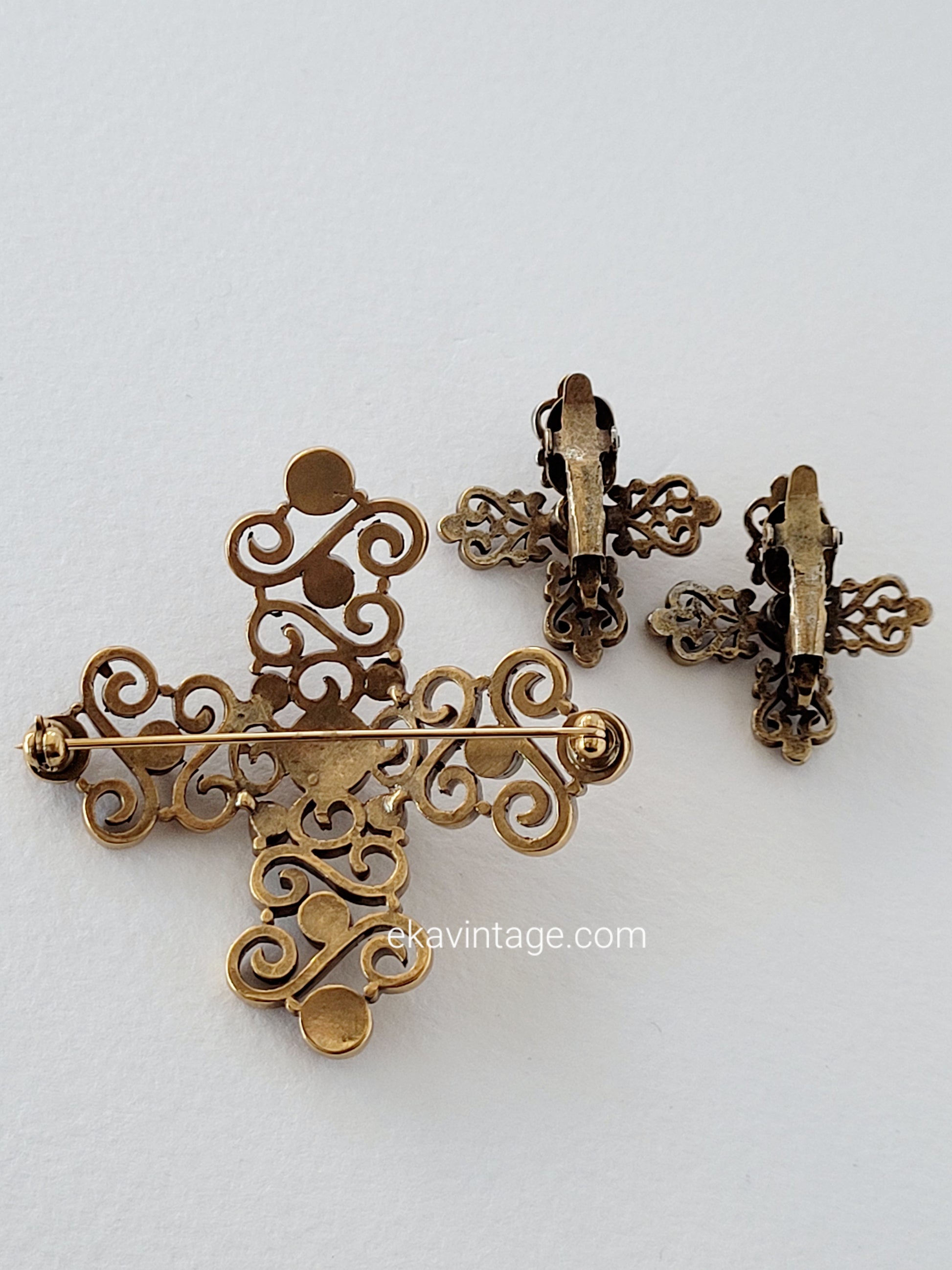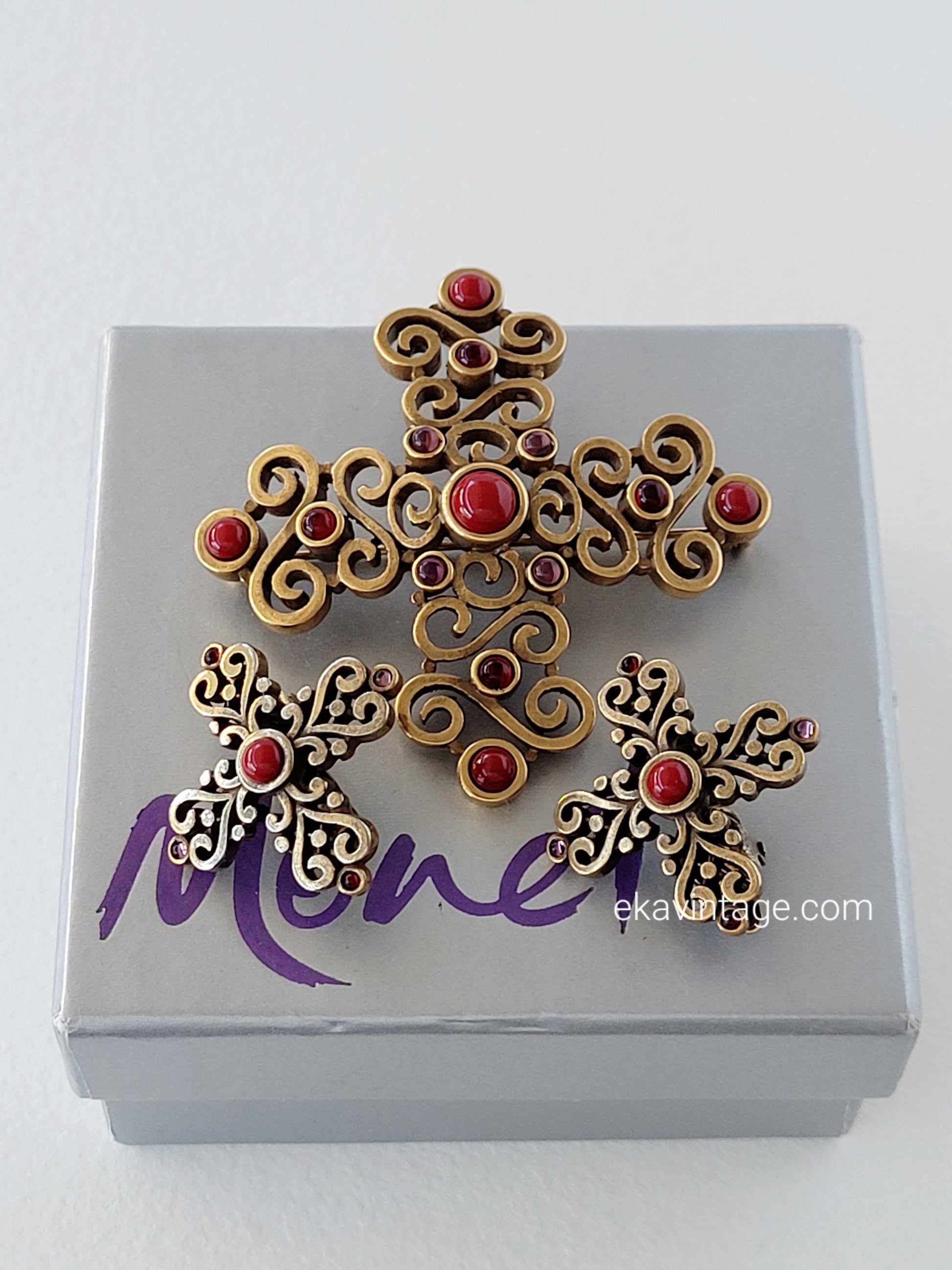 Set vintage Monet - Broche et boucles d'oreilles vintage en forme de croix.