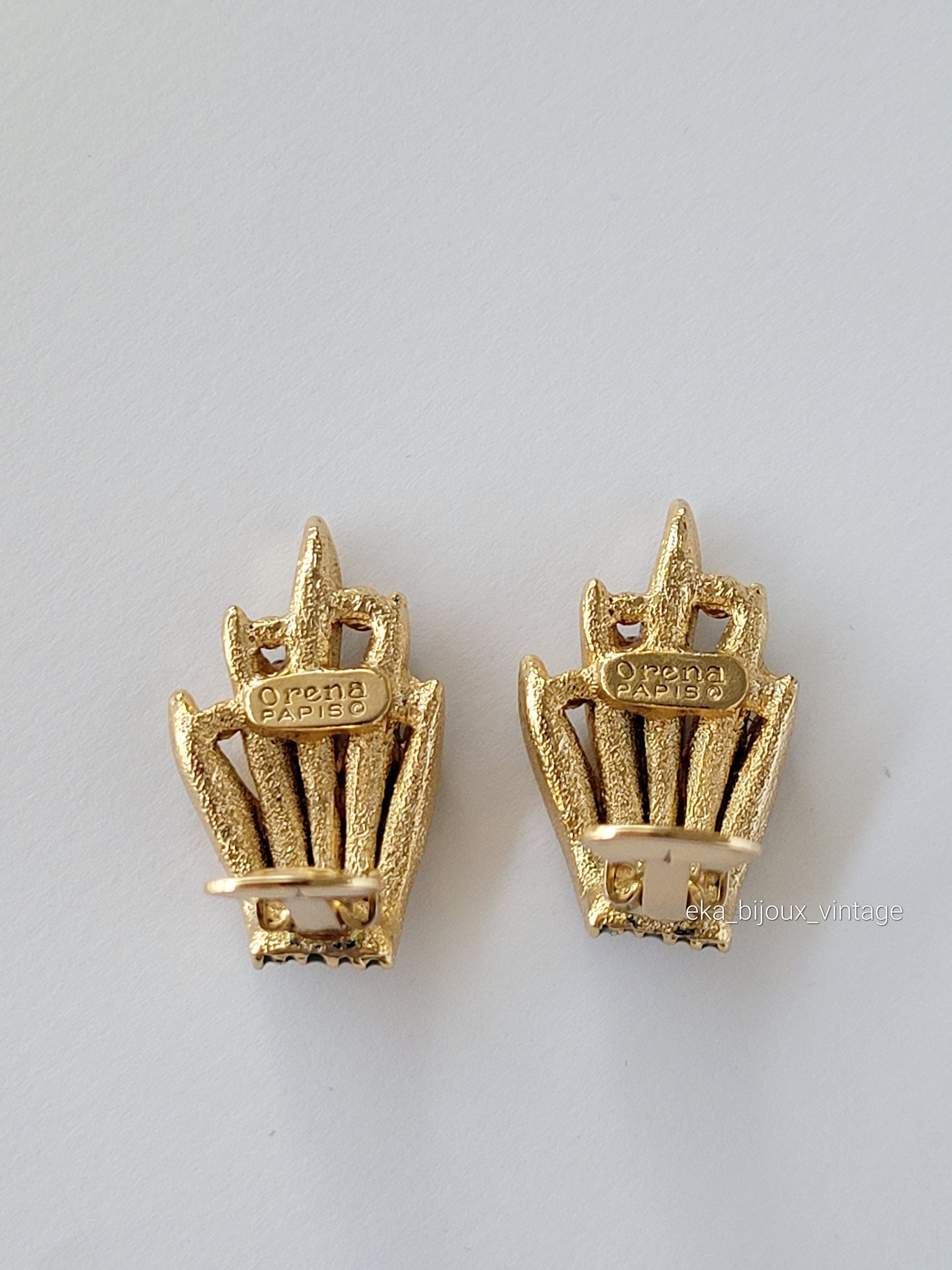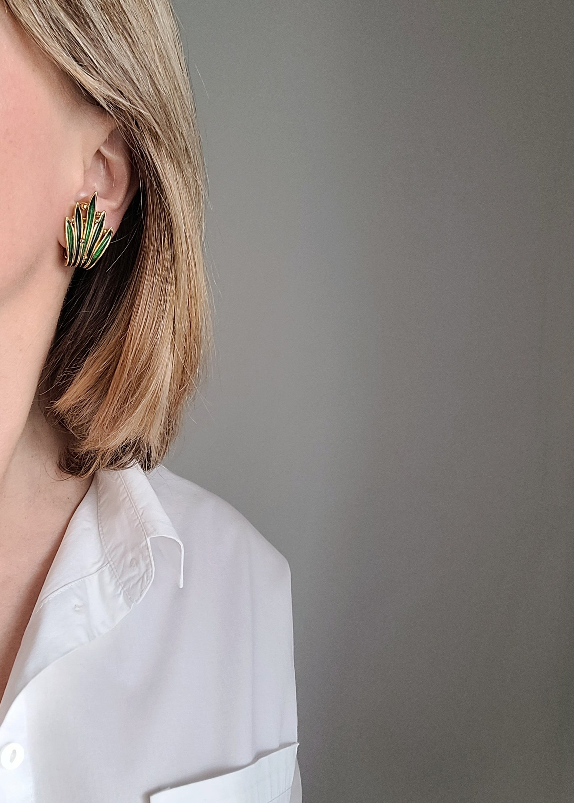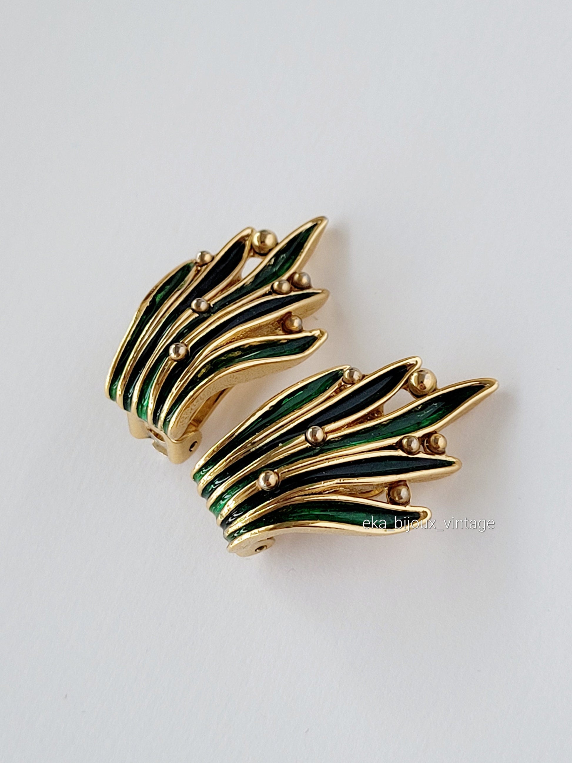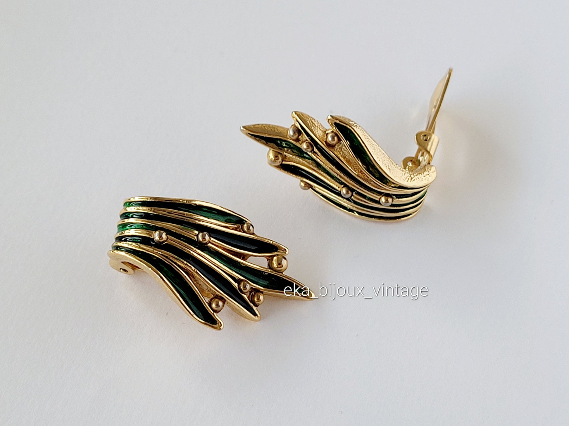 Authentiques boucles d'oreilles Orena Paris en plaqué or et émaux de couleur verte et bleue.