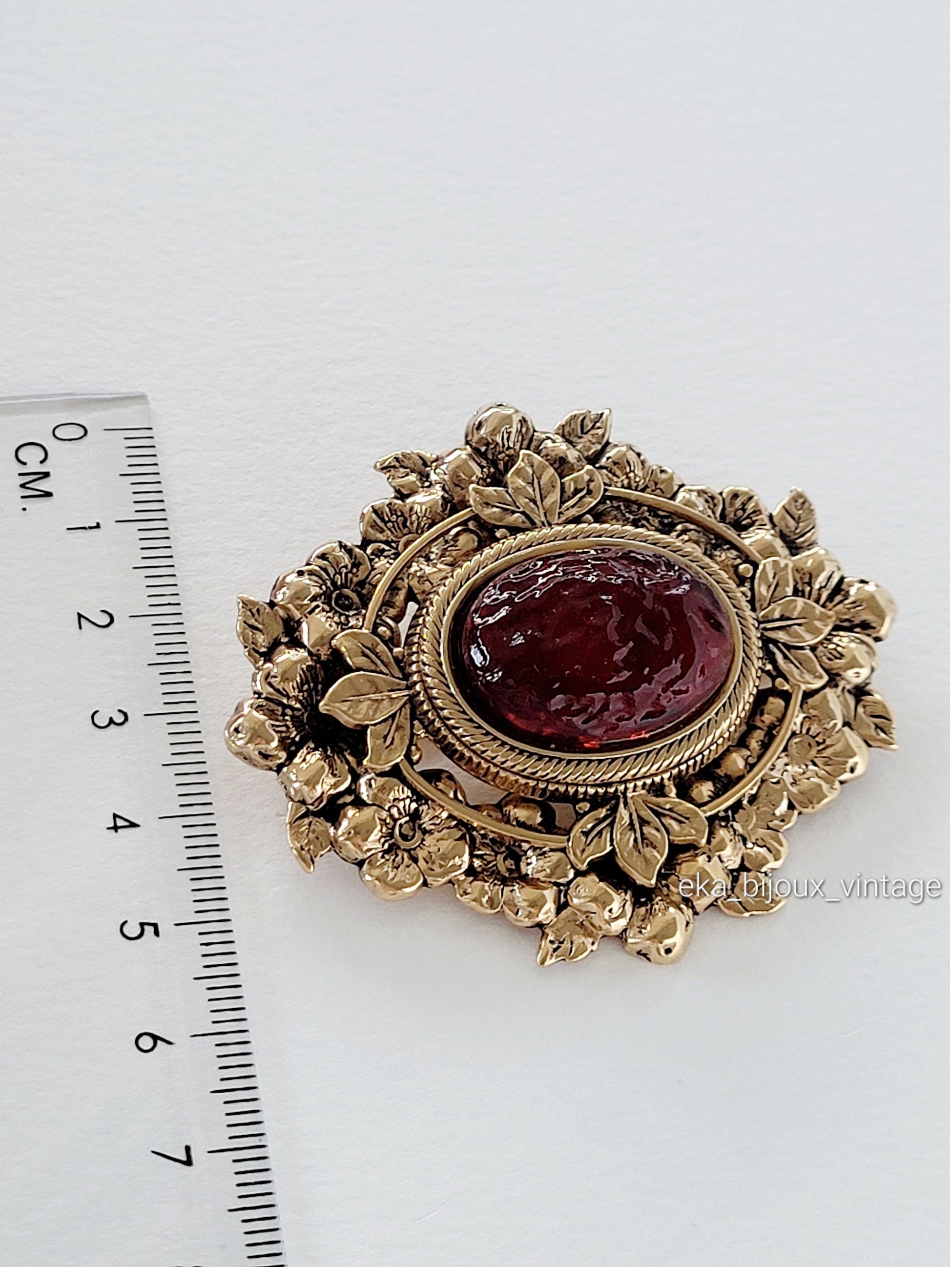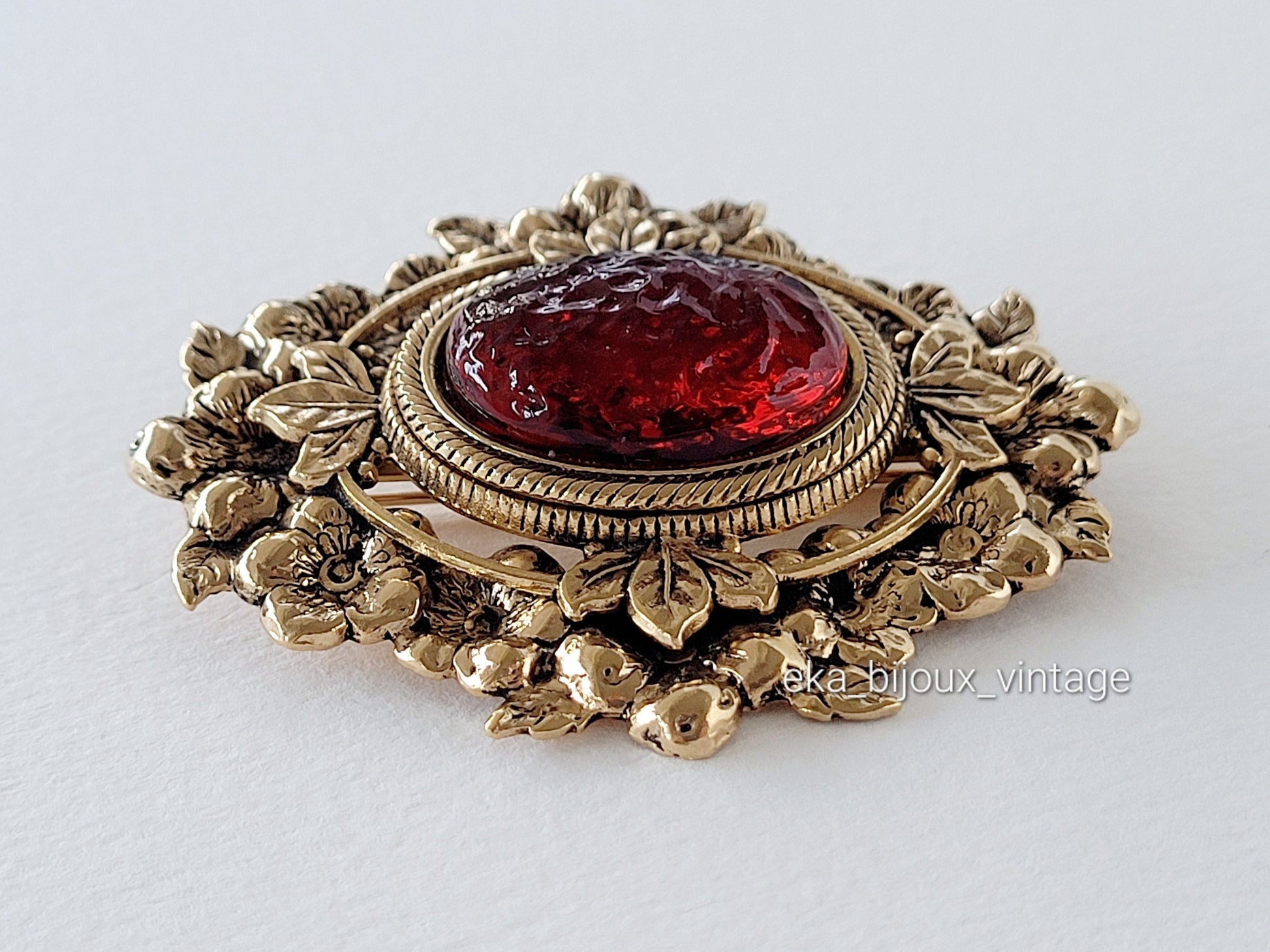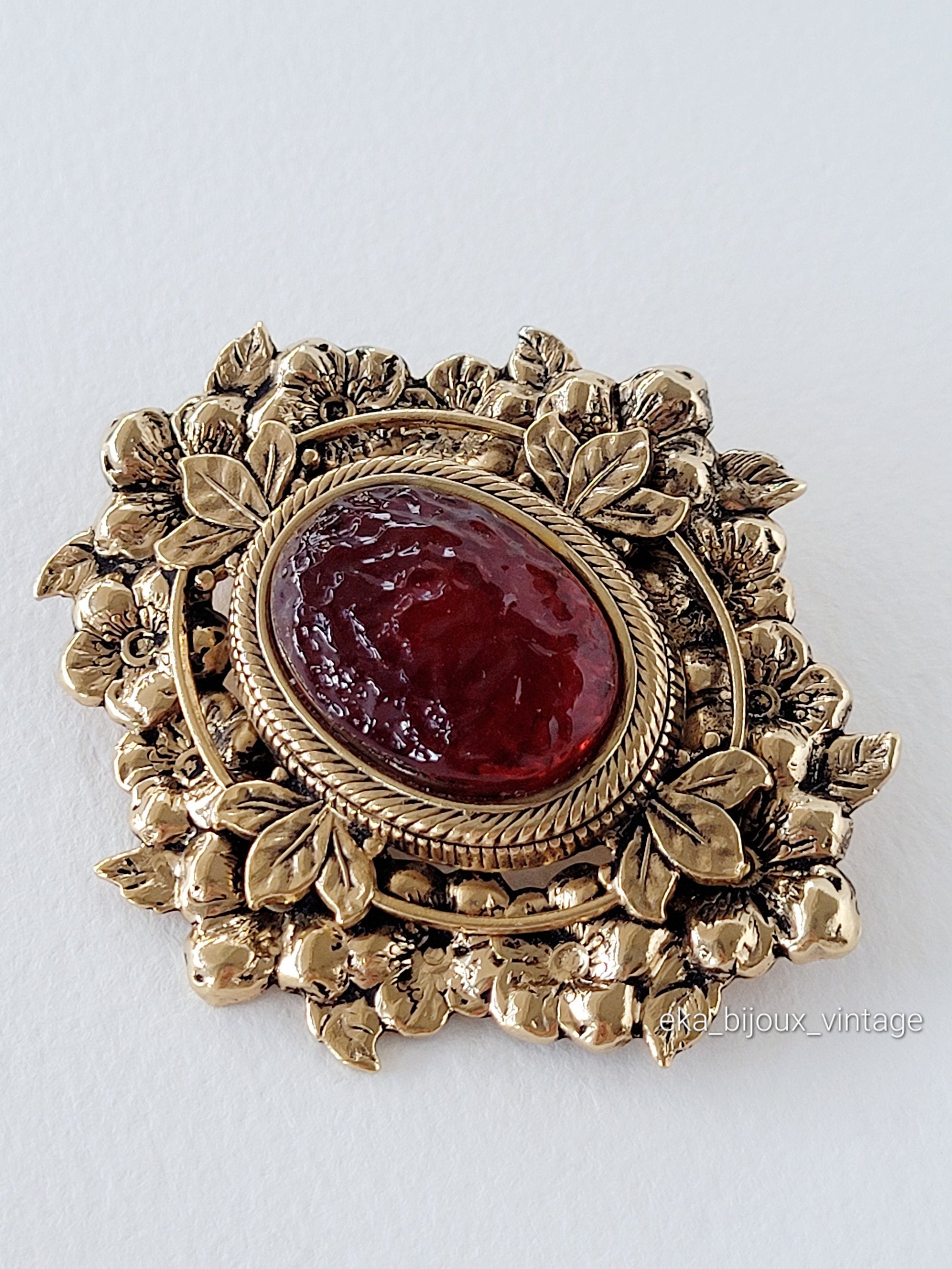 Très belle broche Réminiscence en métal doré avec un cabochon en verre couleur rouge.