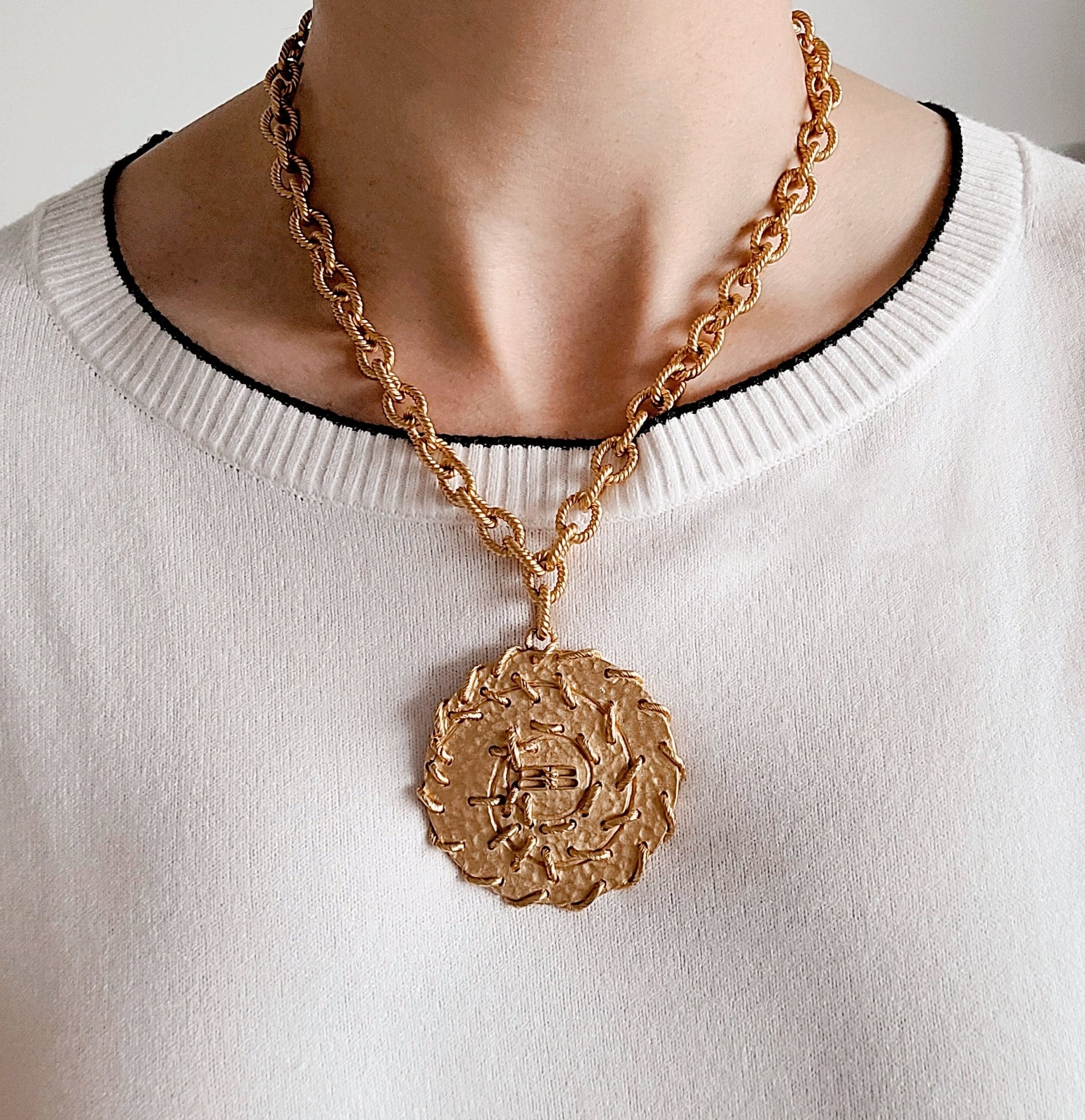 Chaîne finement texturée en métal doré, grand pendentif artisanal rond.