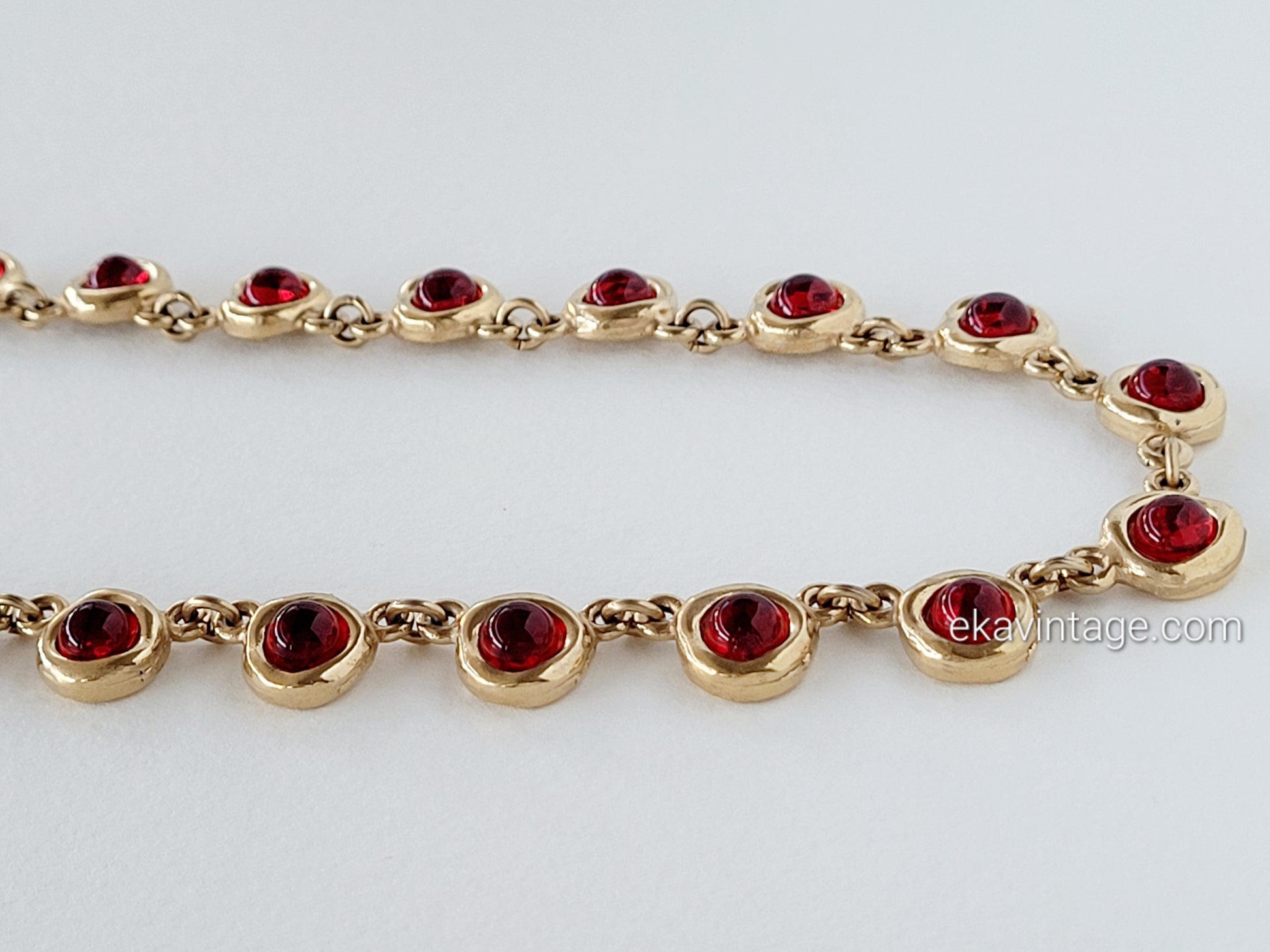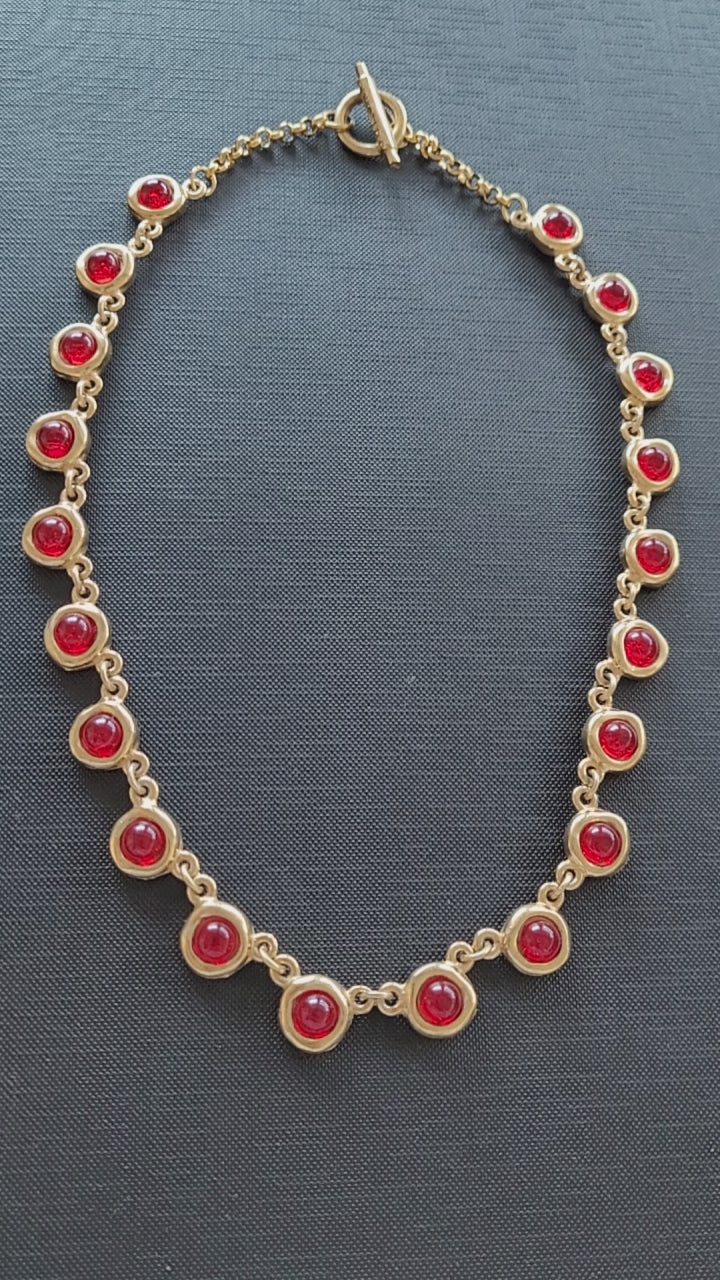 Magnifique collier vintage Biche de Bère en plaqué or avec des cabochons en verre rouge.
