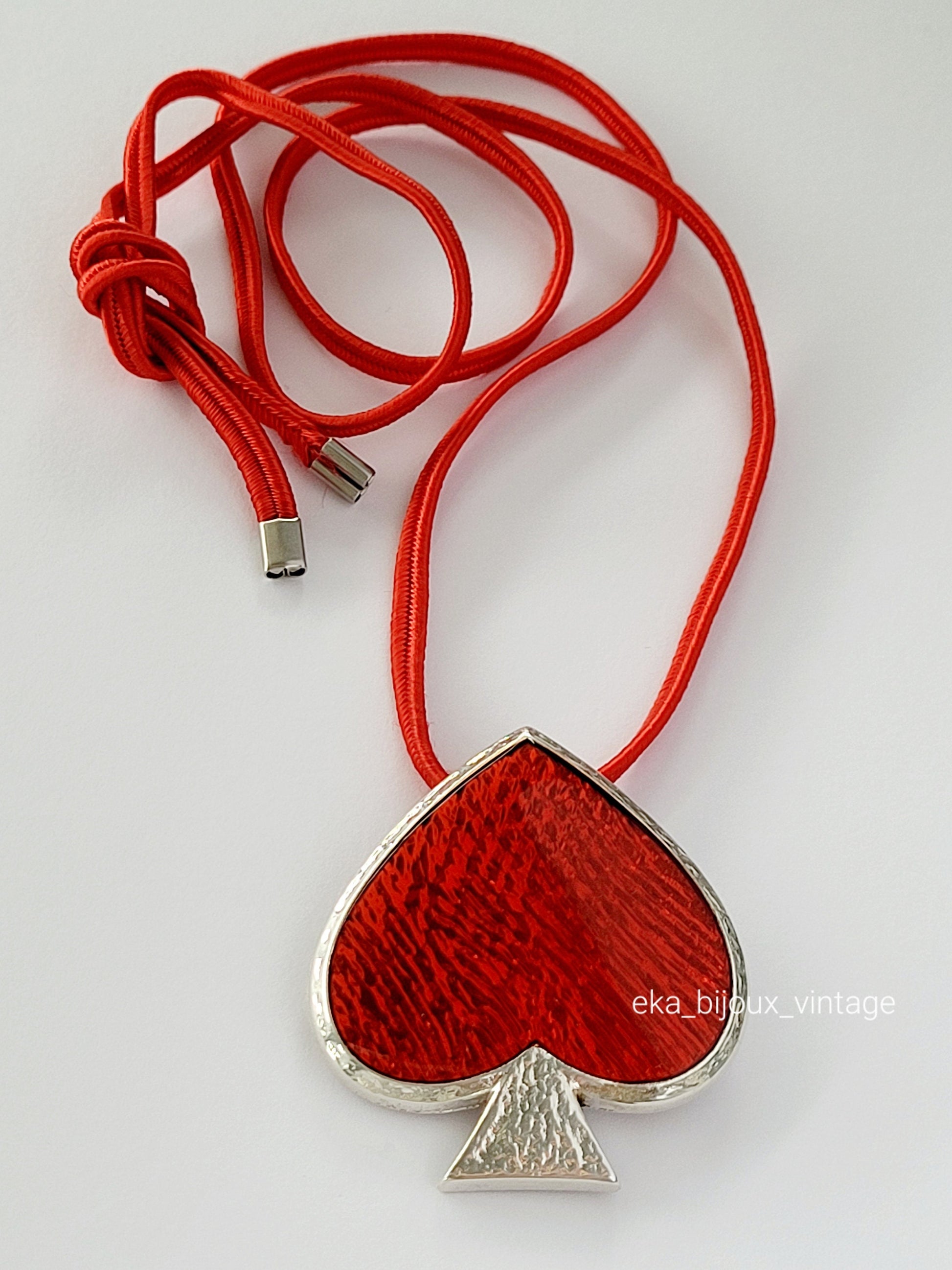 Peut se porter en broche et en pendentif avec son cordon en soie rouge d'origine.