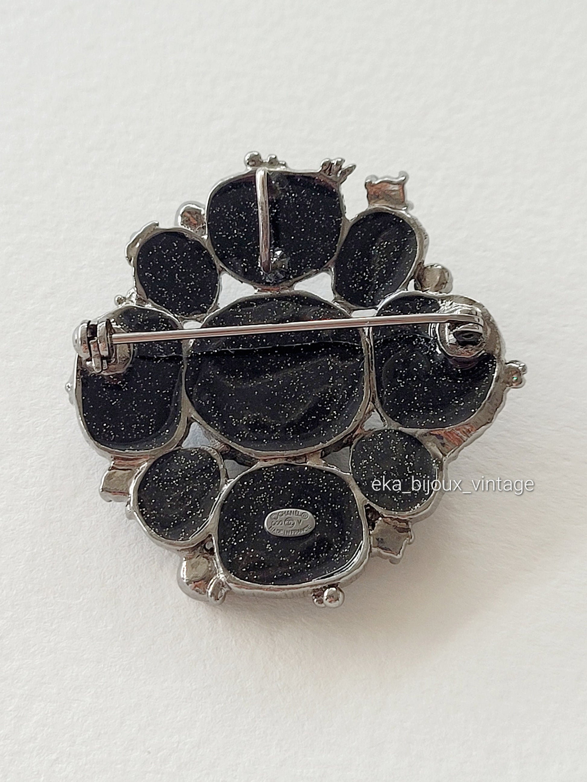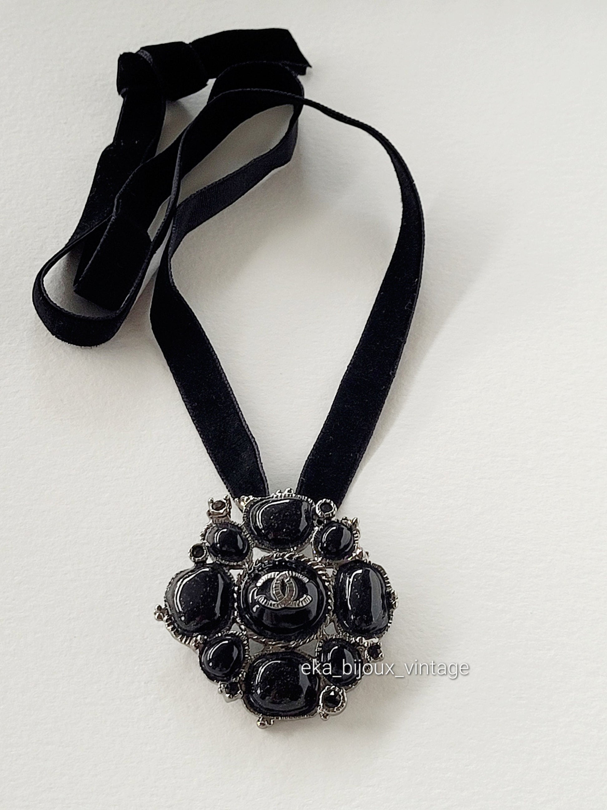 Authentique très élégante broche/pendentif Chanel avec des cabochons noirs en pâte de verre.