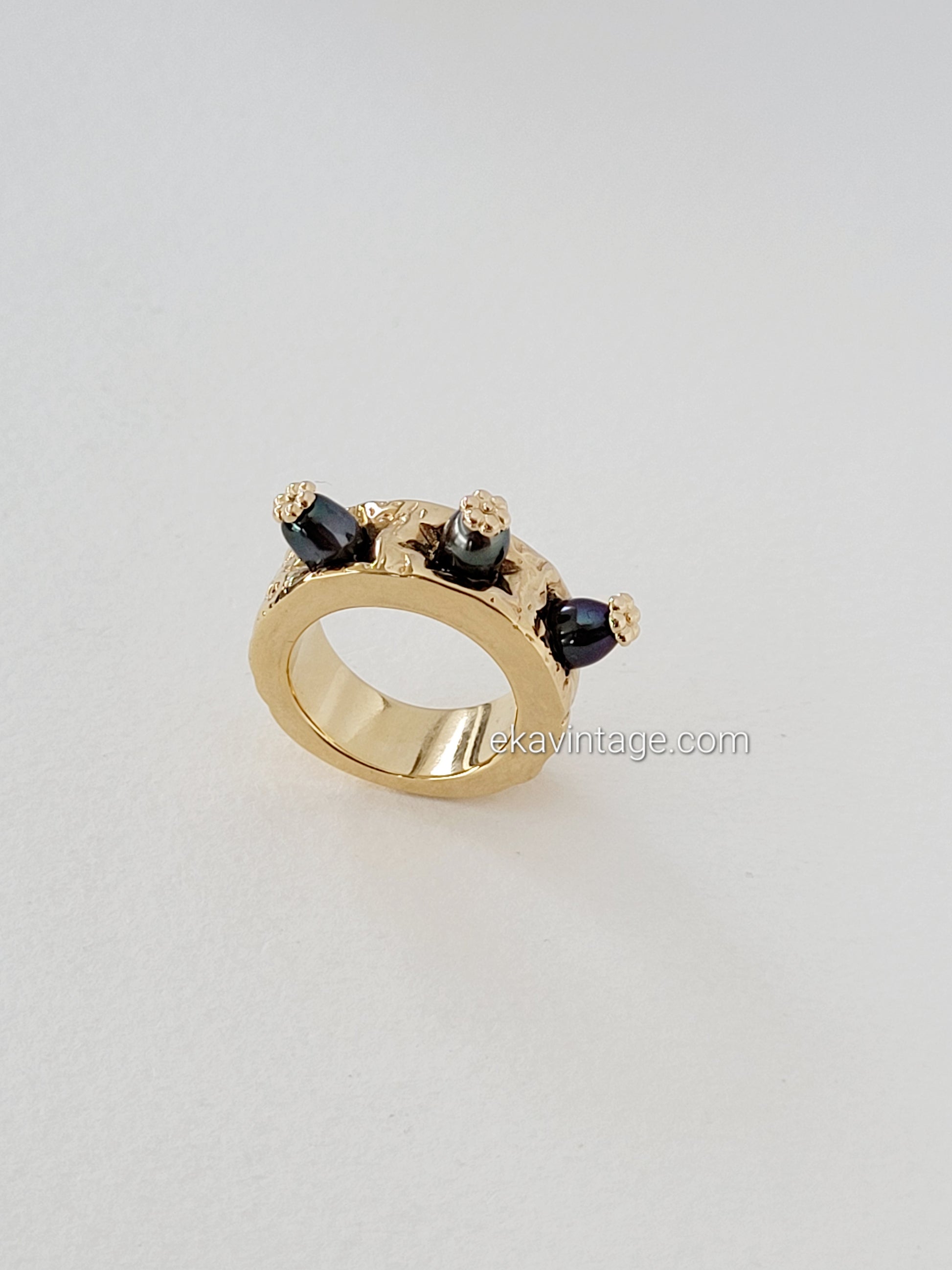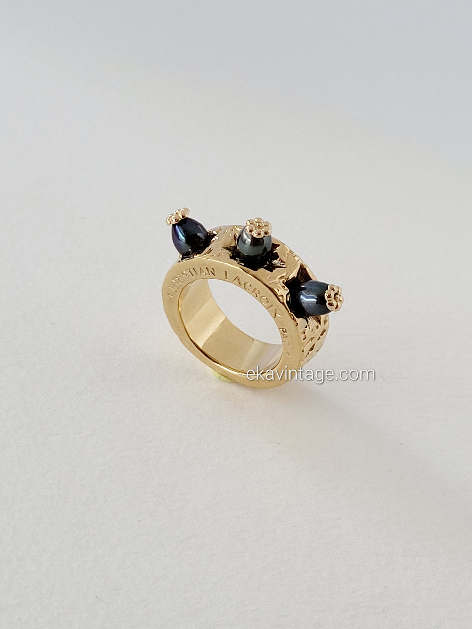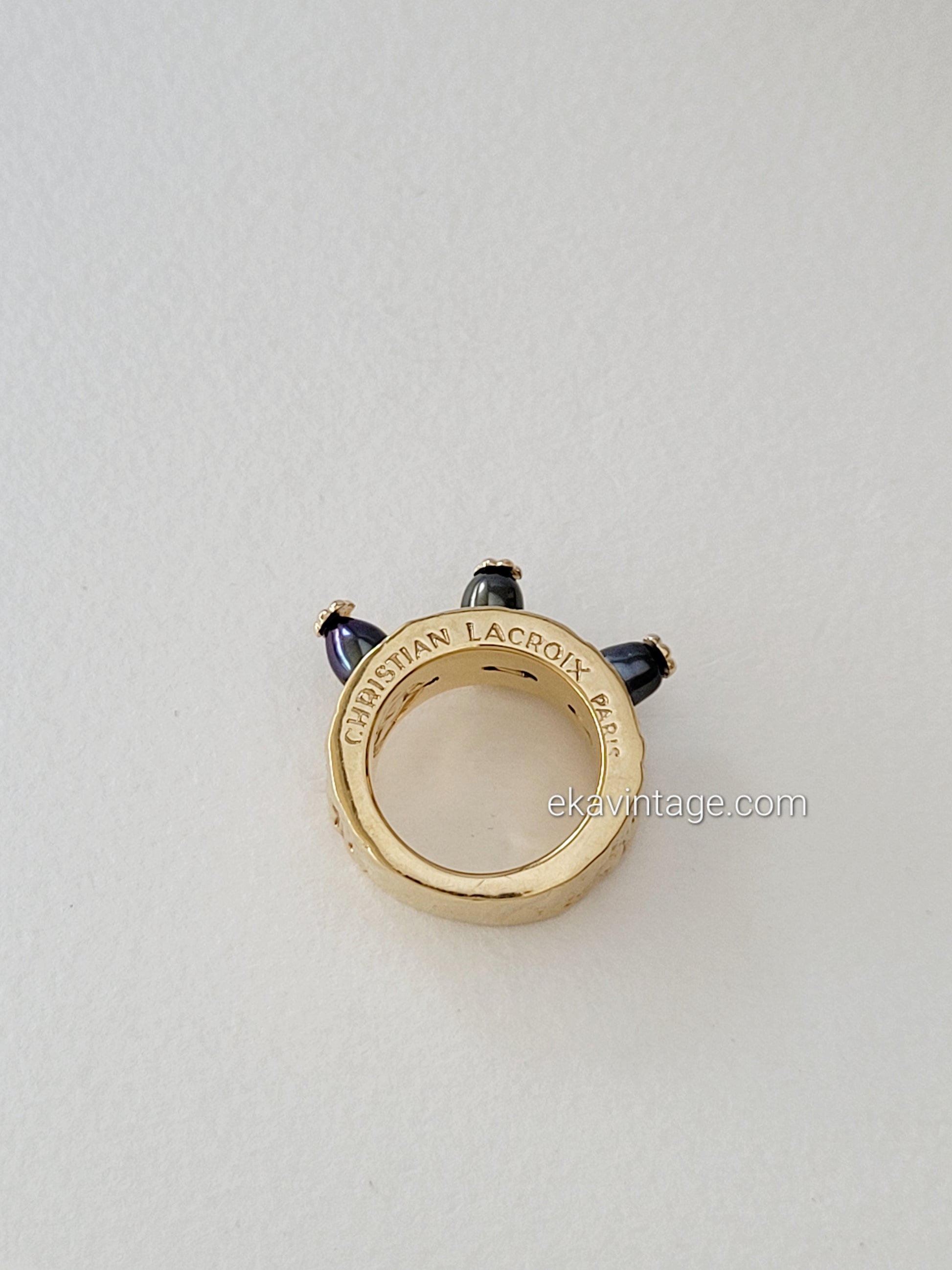 Authentique et magnifique bague Christian Lacroix en plaqué or avec trois perles en forme de fleurs.