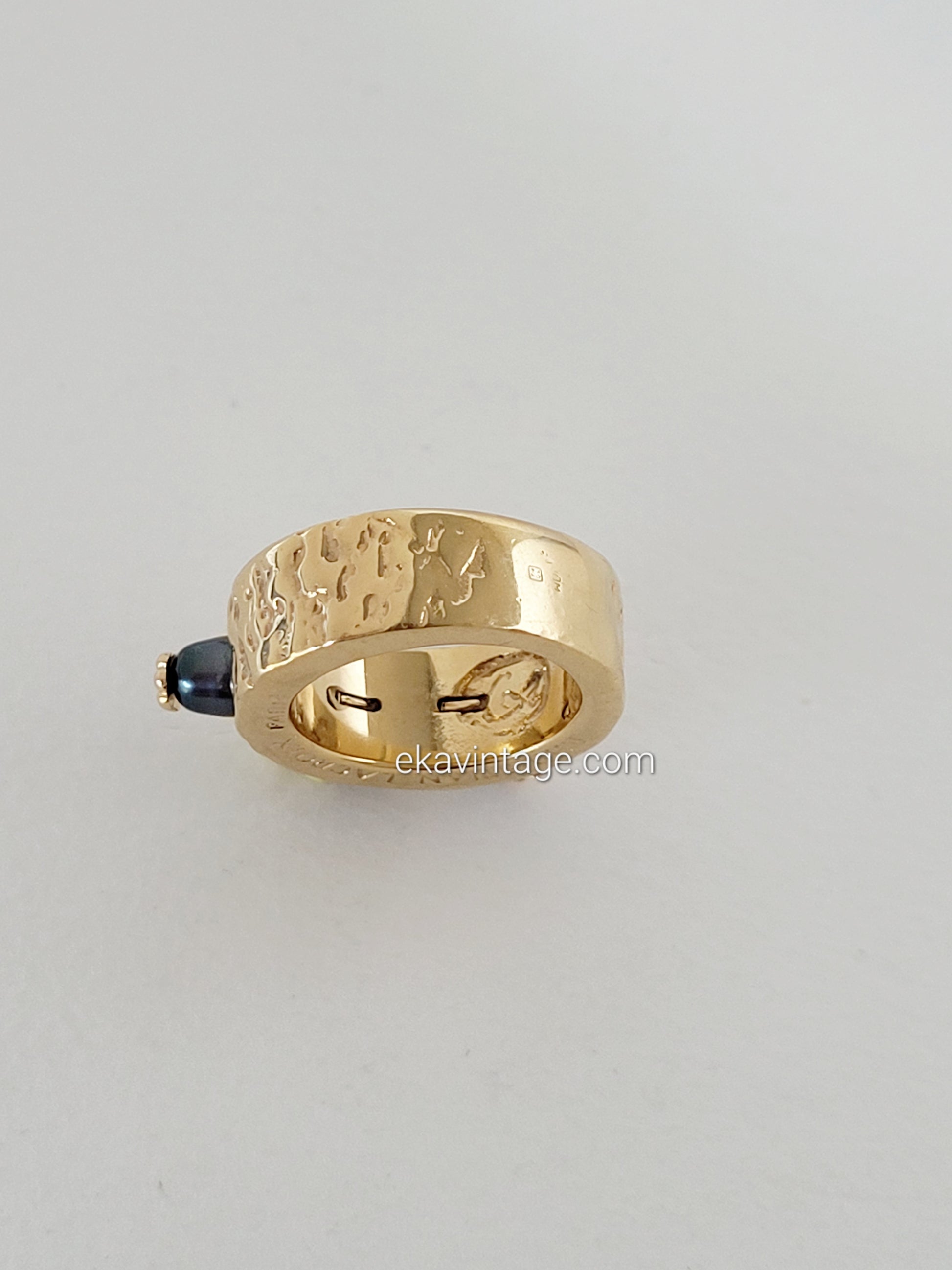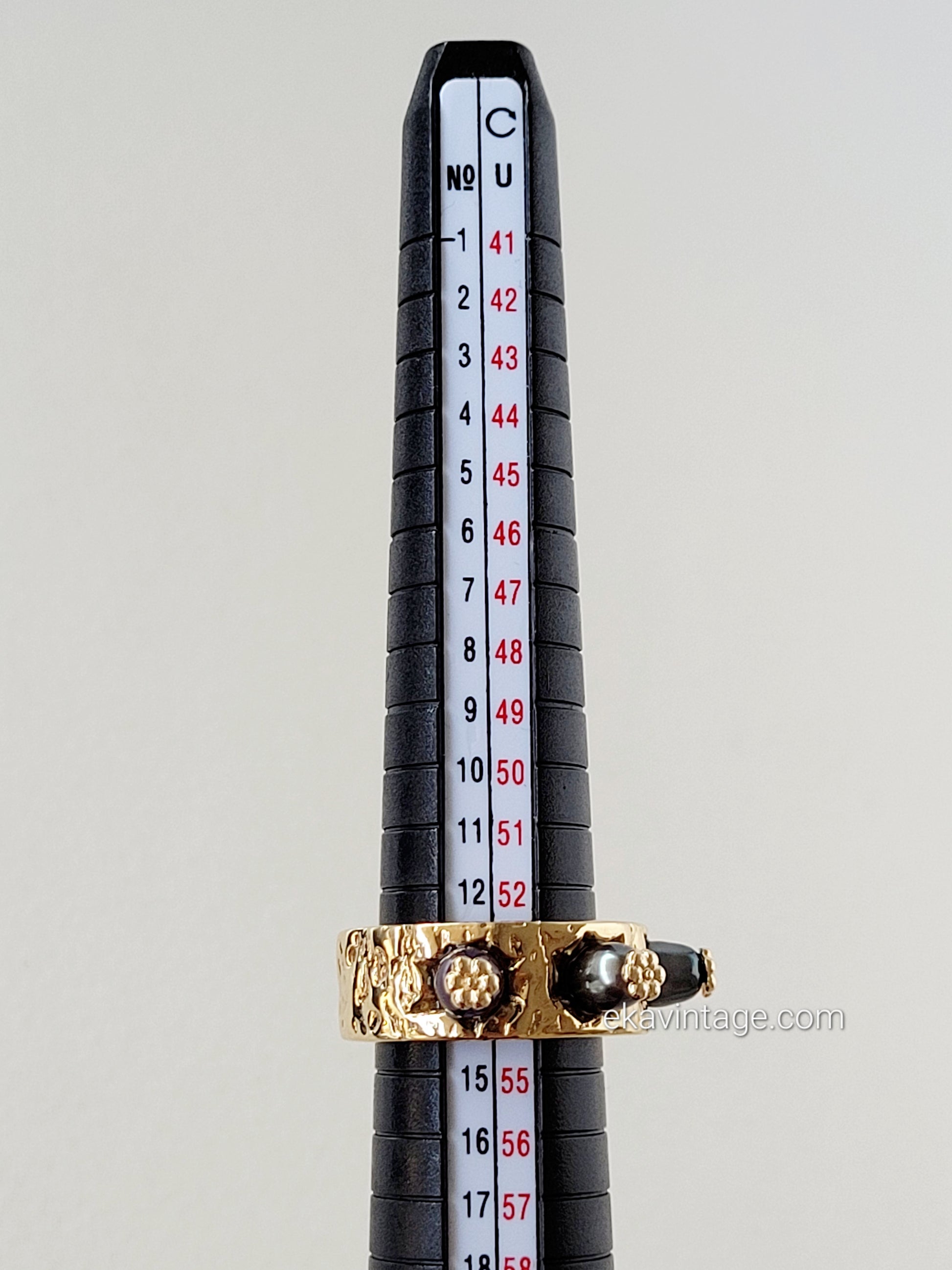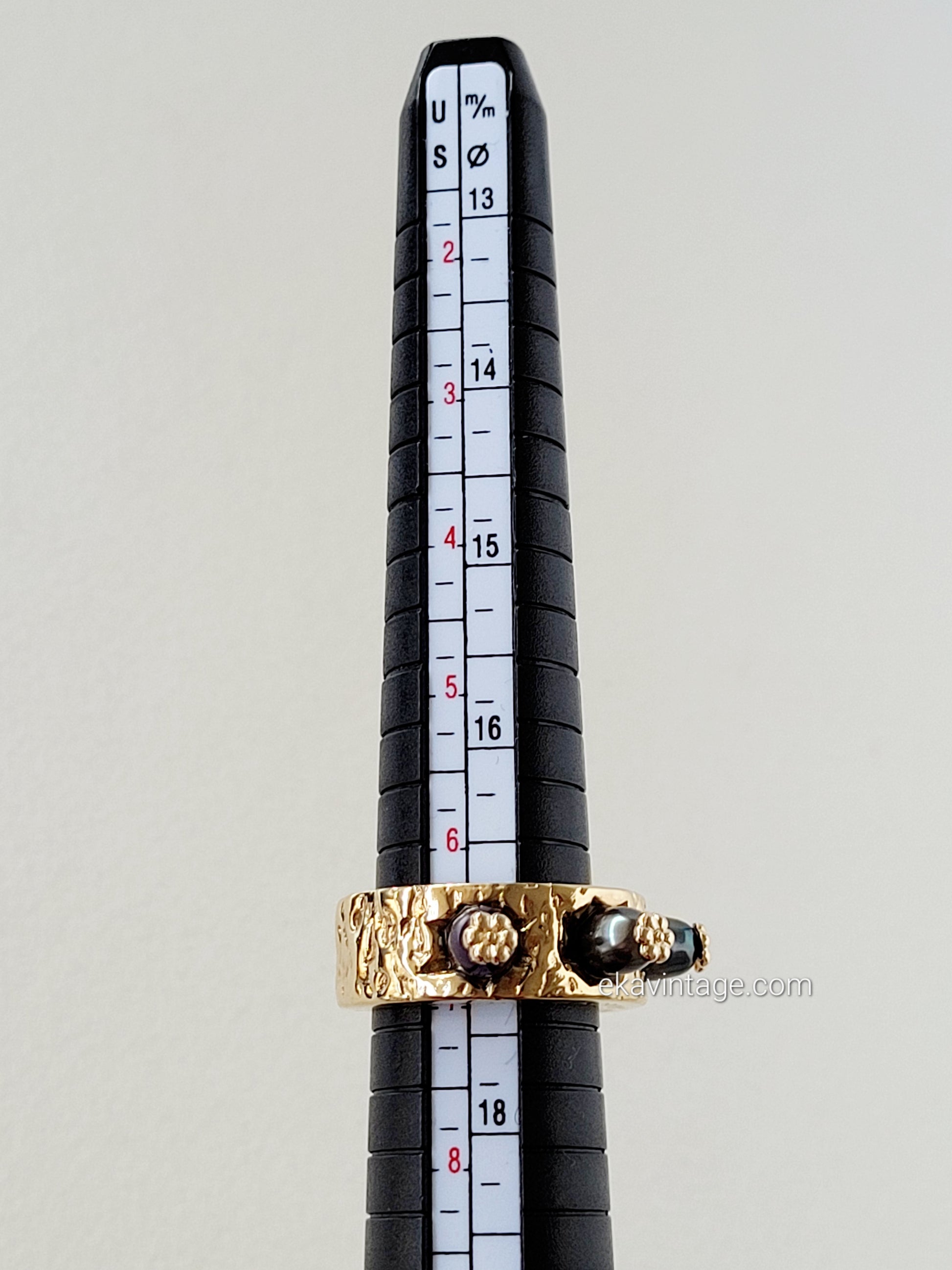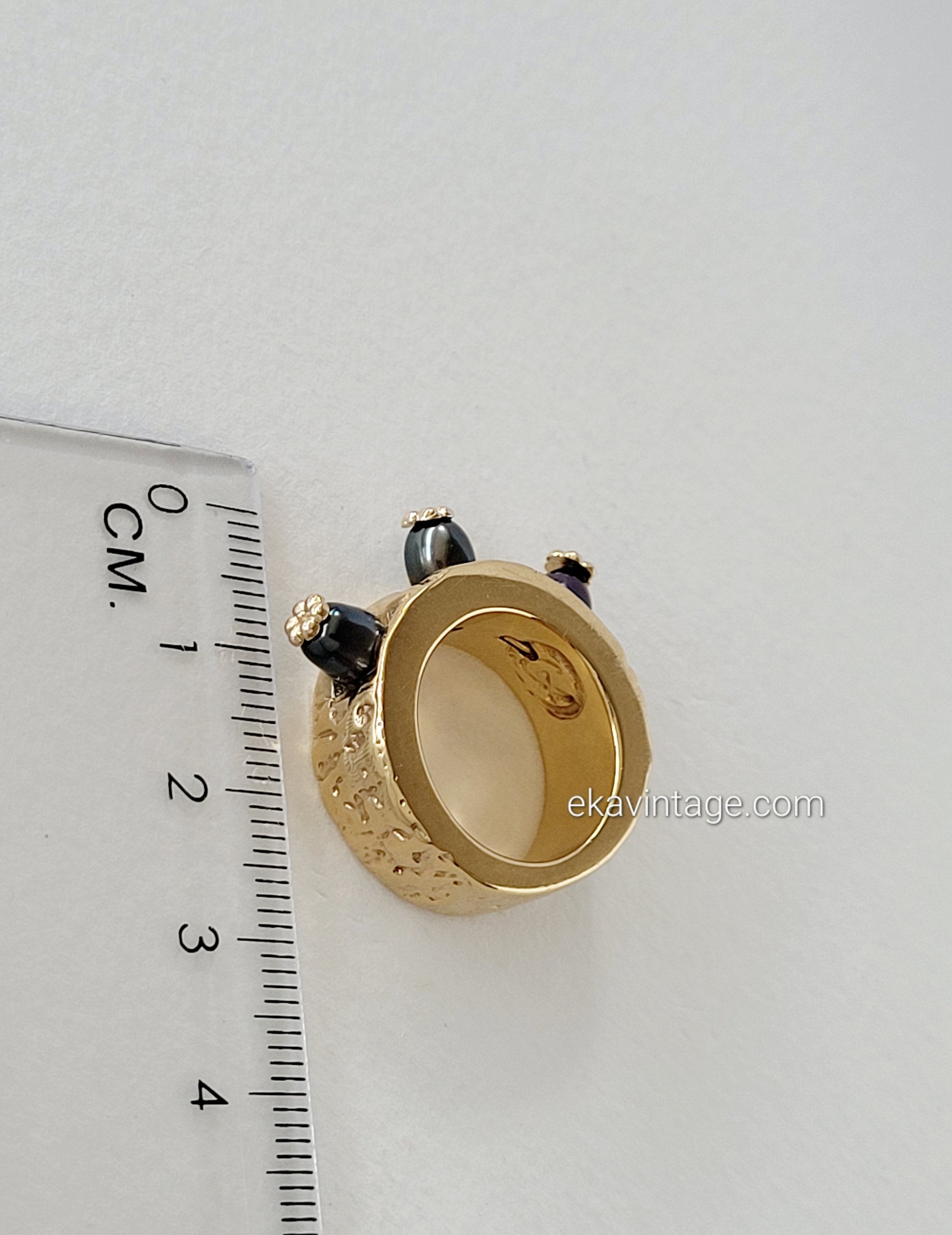 Authentique et magnifique bague Christian Lacroix en plaqué or avec trois perles en forme de fleurs.