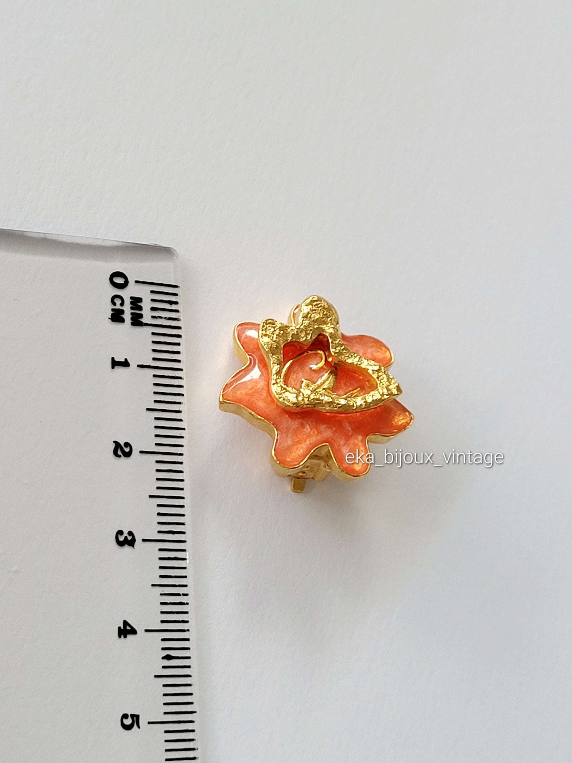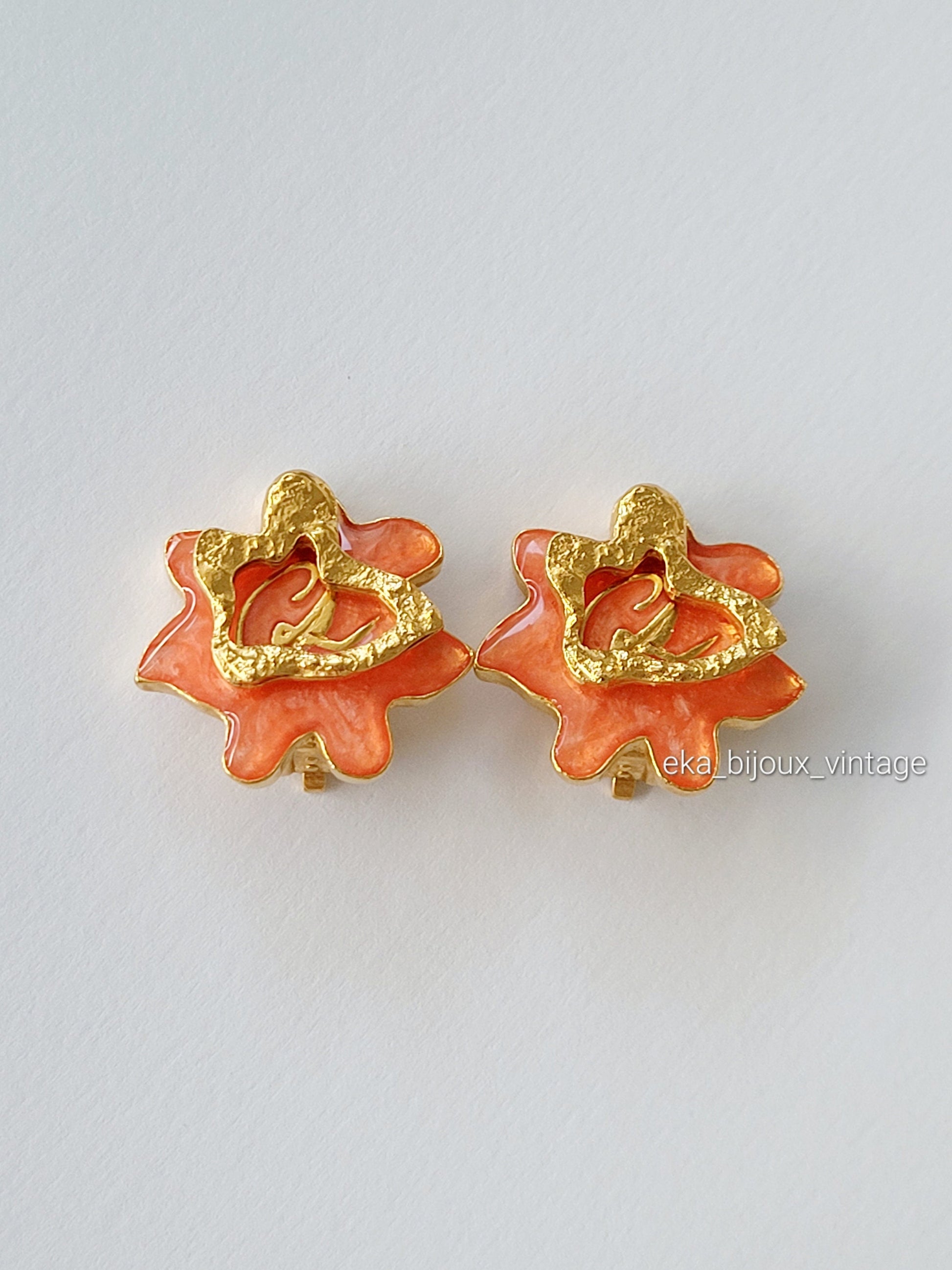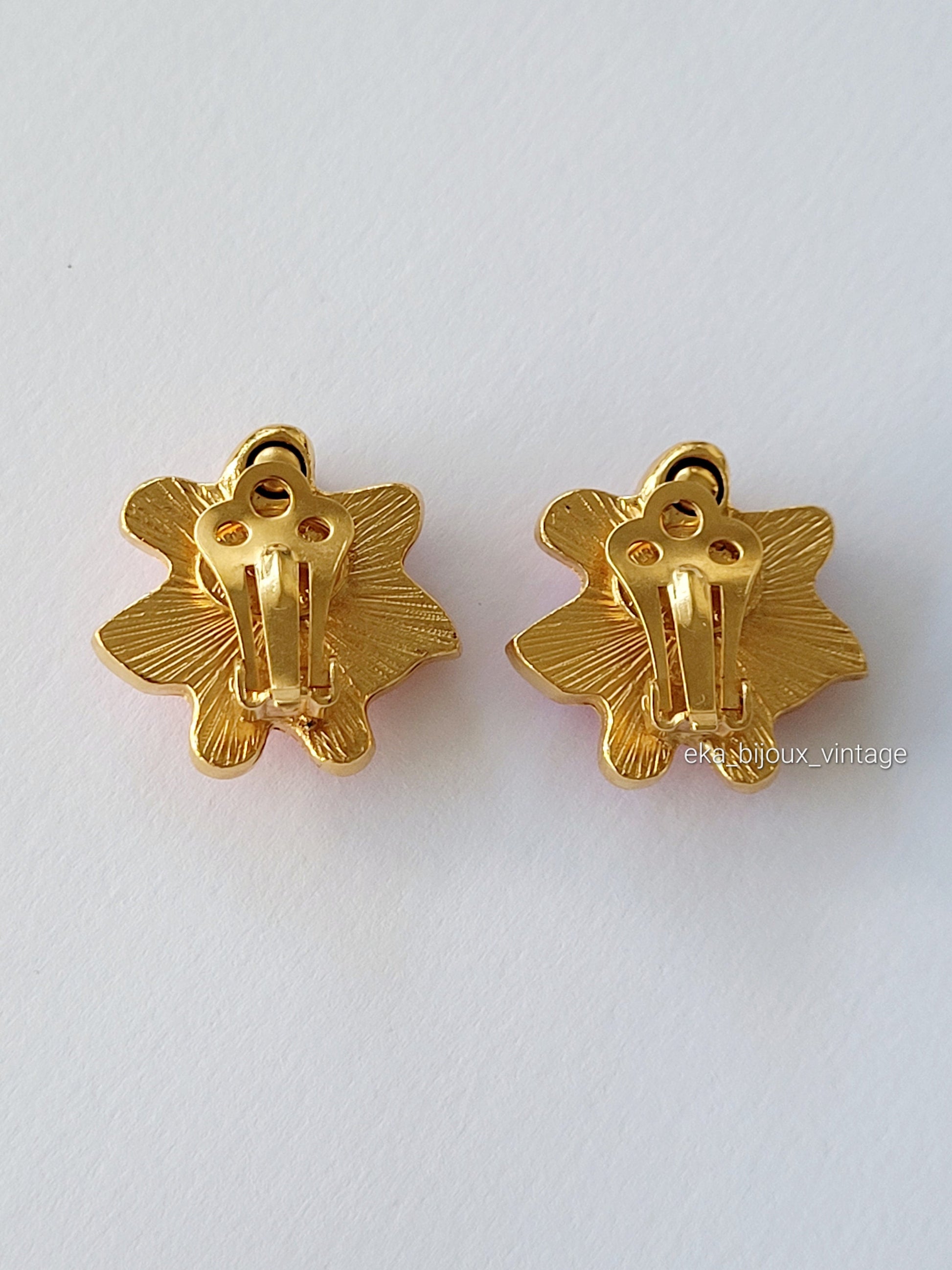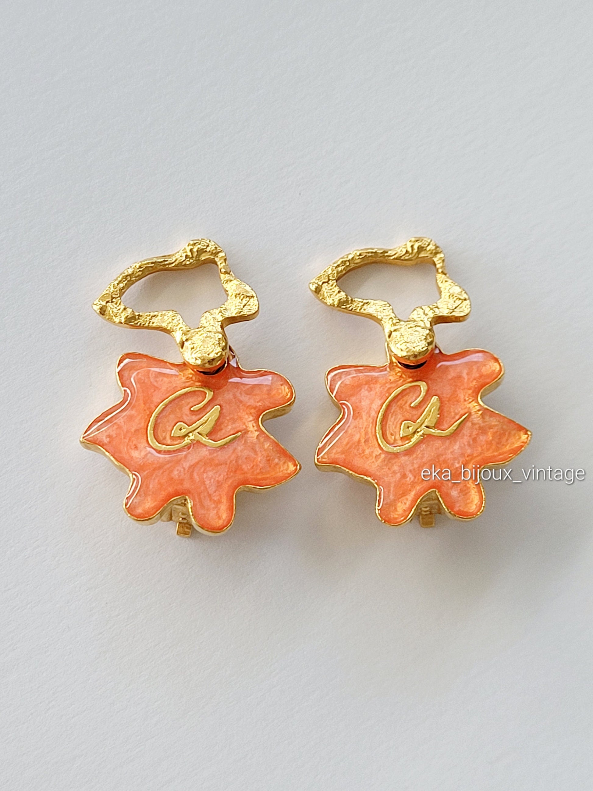 Très belles et authentiques boucles d'oreilles vintage Christian Lacroix, en plaqué or et émaux. La partie dorée qui surmonte le bijou est mobile sur son axe.