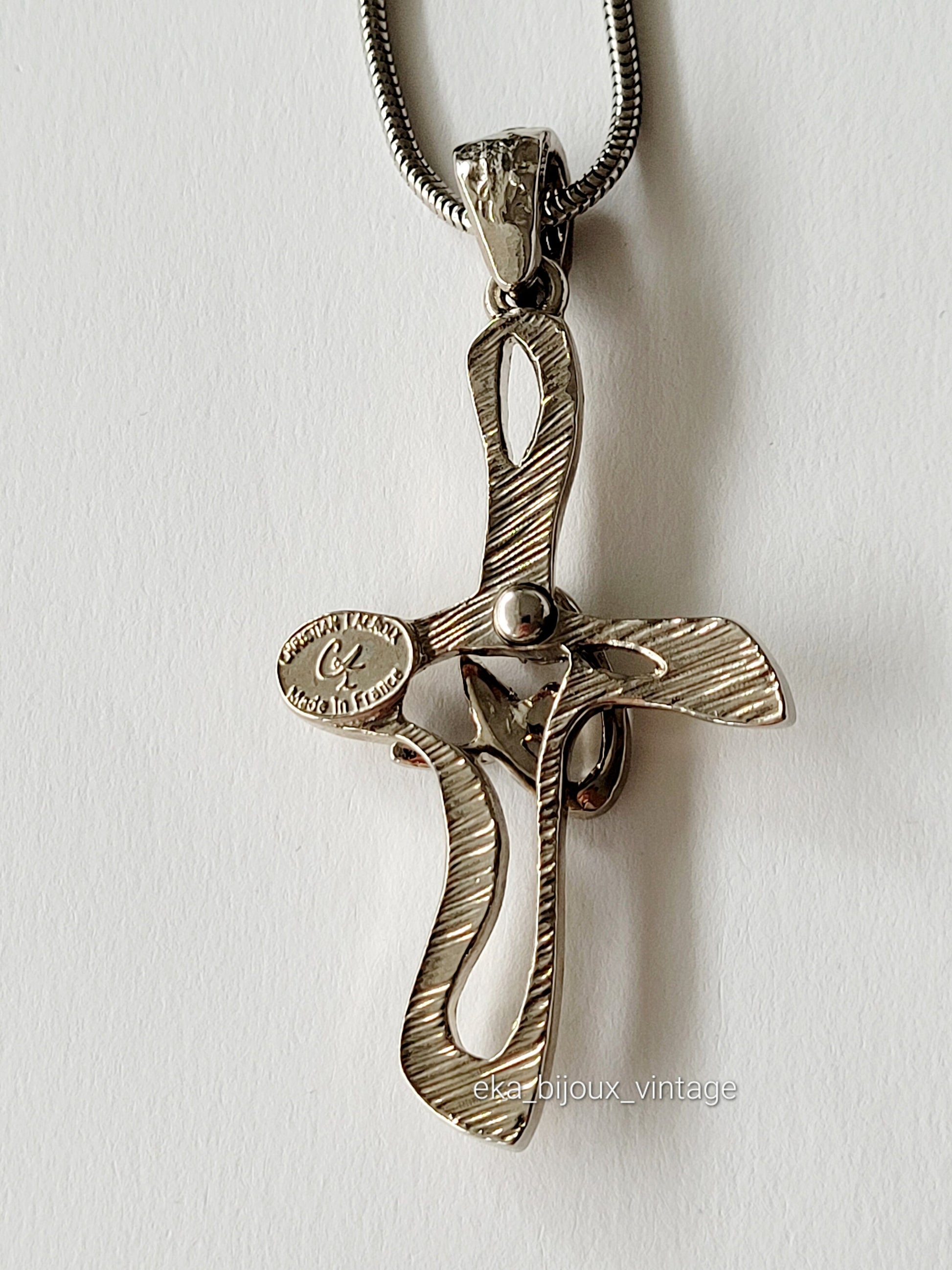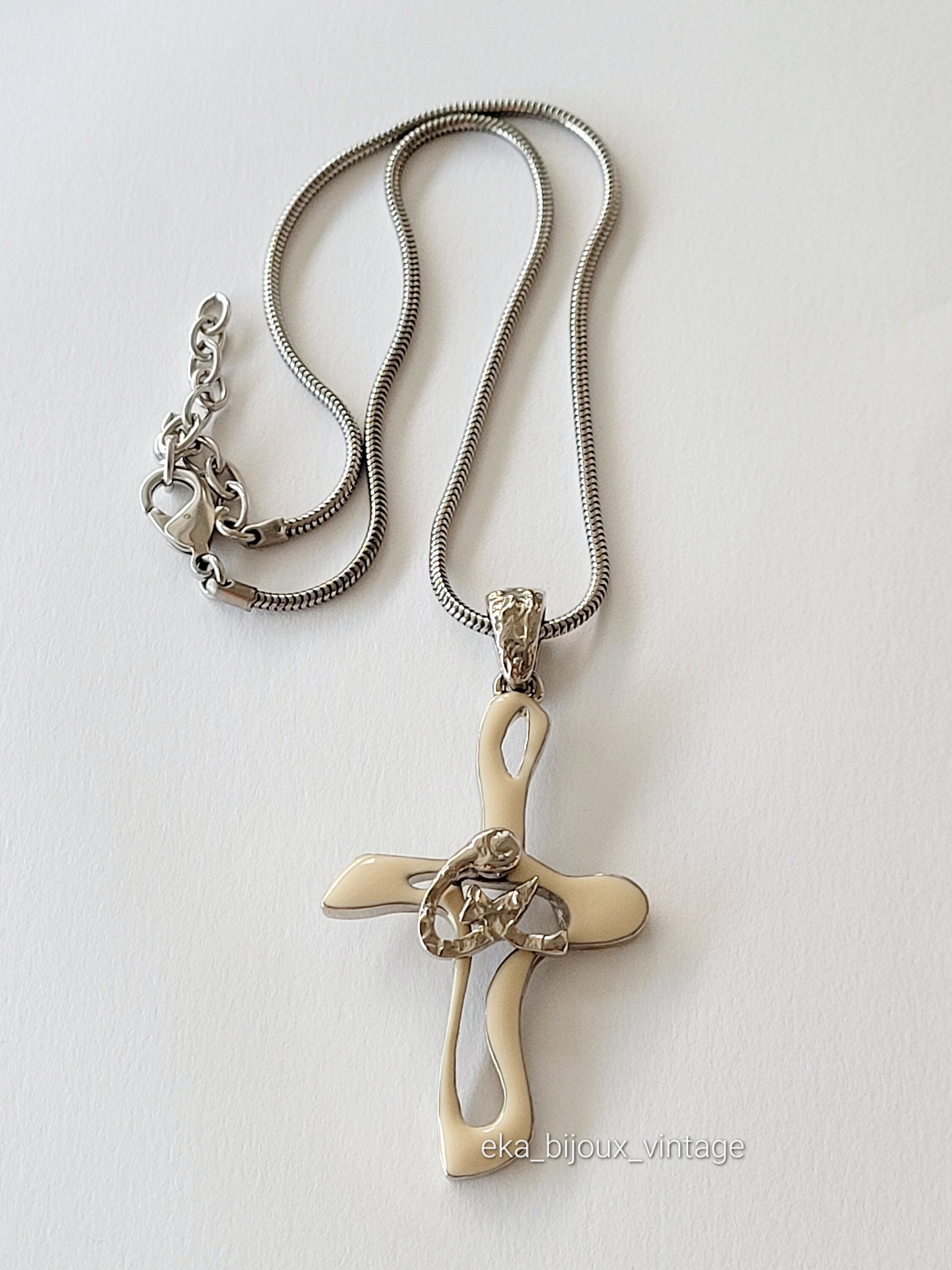 Authentique collier vintage Christian Lacroix, en plaqué argent et émail de couleur beige.