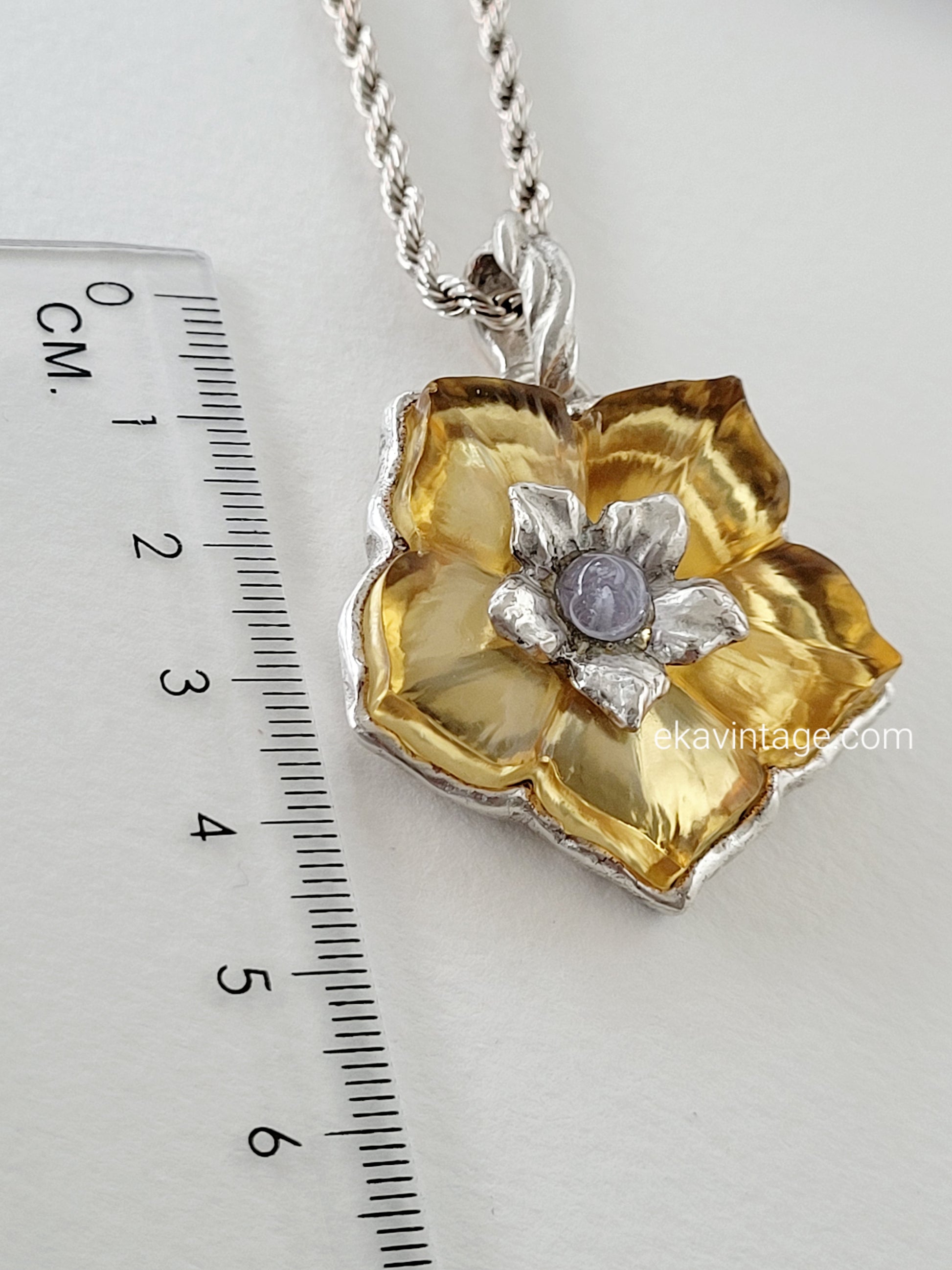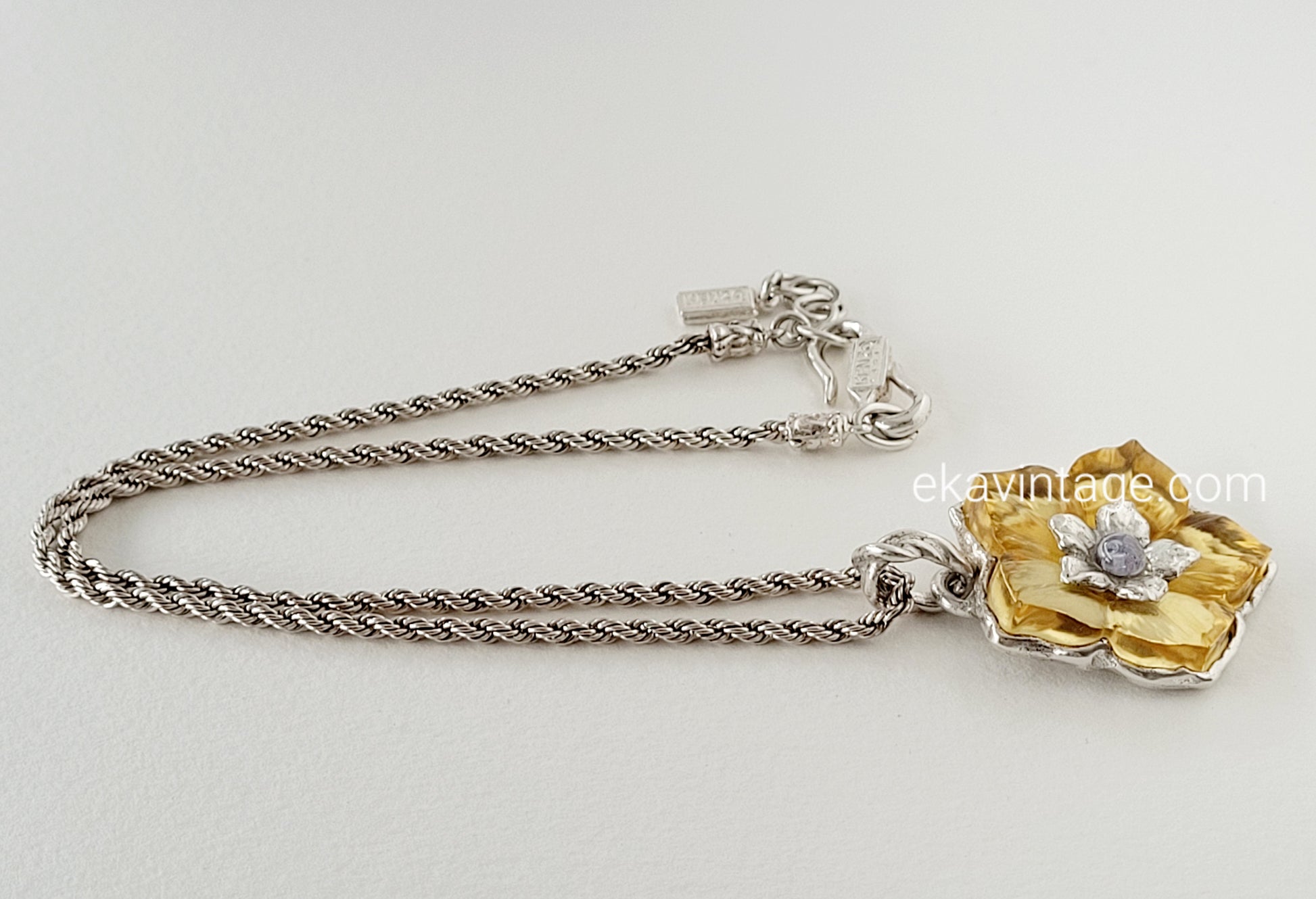 Authentique collier Kenzo Paris des années 1980, avec chaîne en métal argenté et pendentif en lucite en forme de fleur.