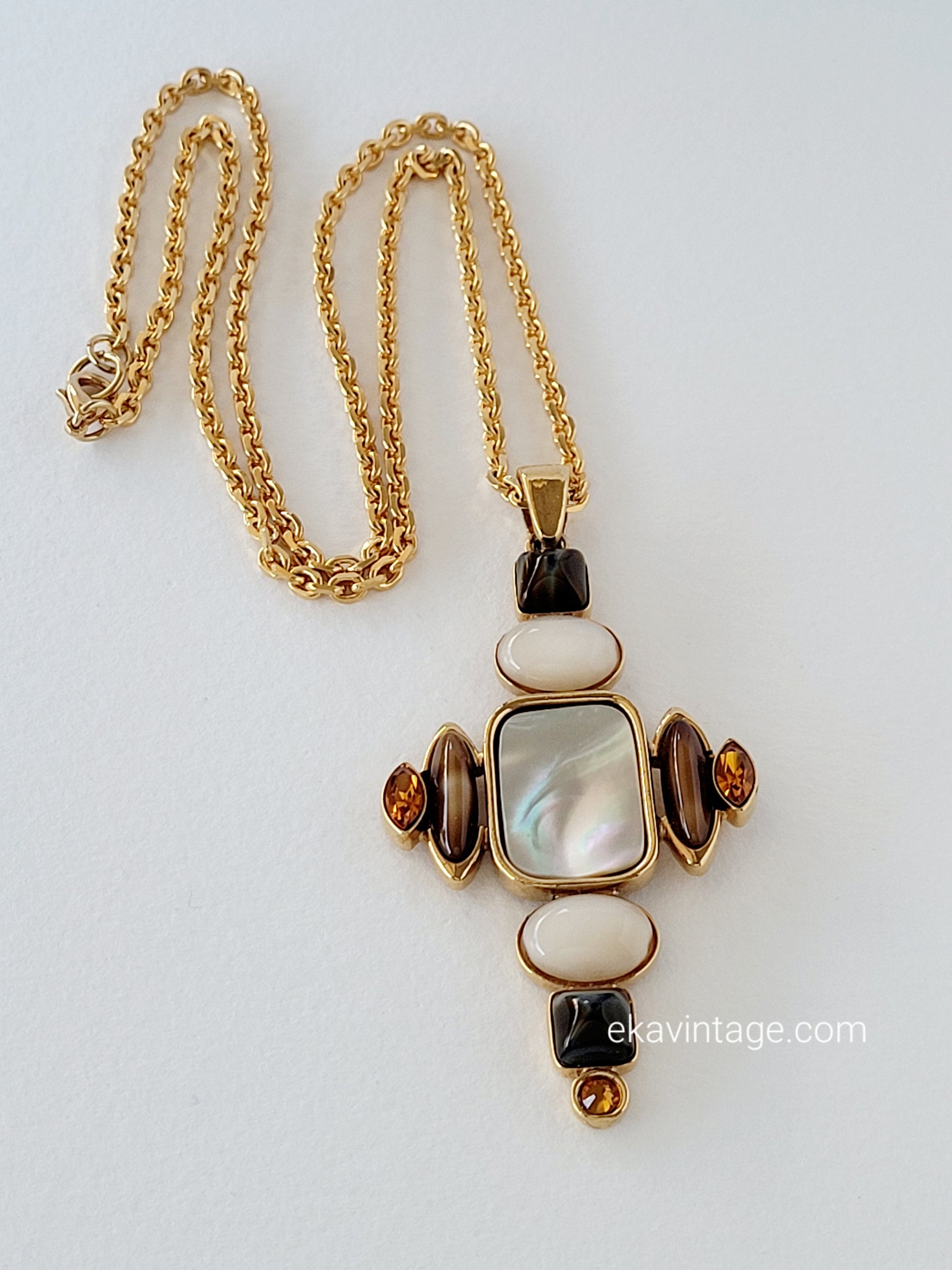 Chaîne en métal doré, grand pendentif avec différents cabochons.