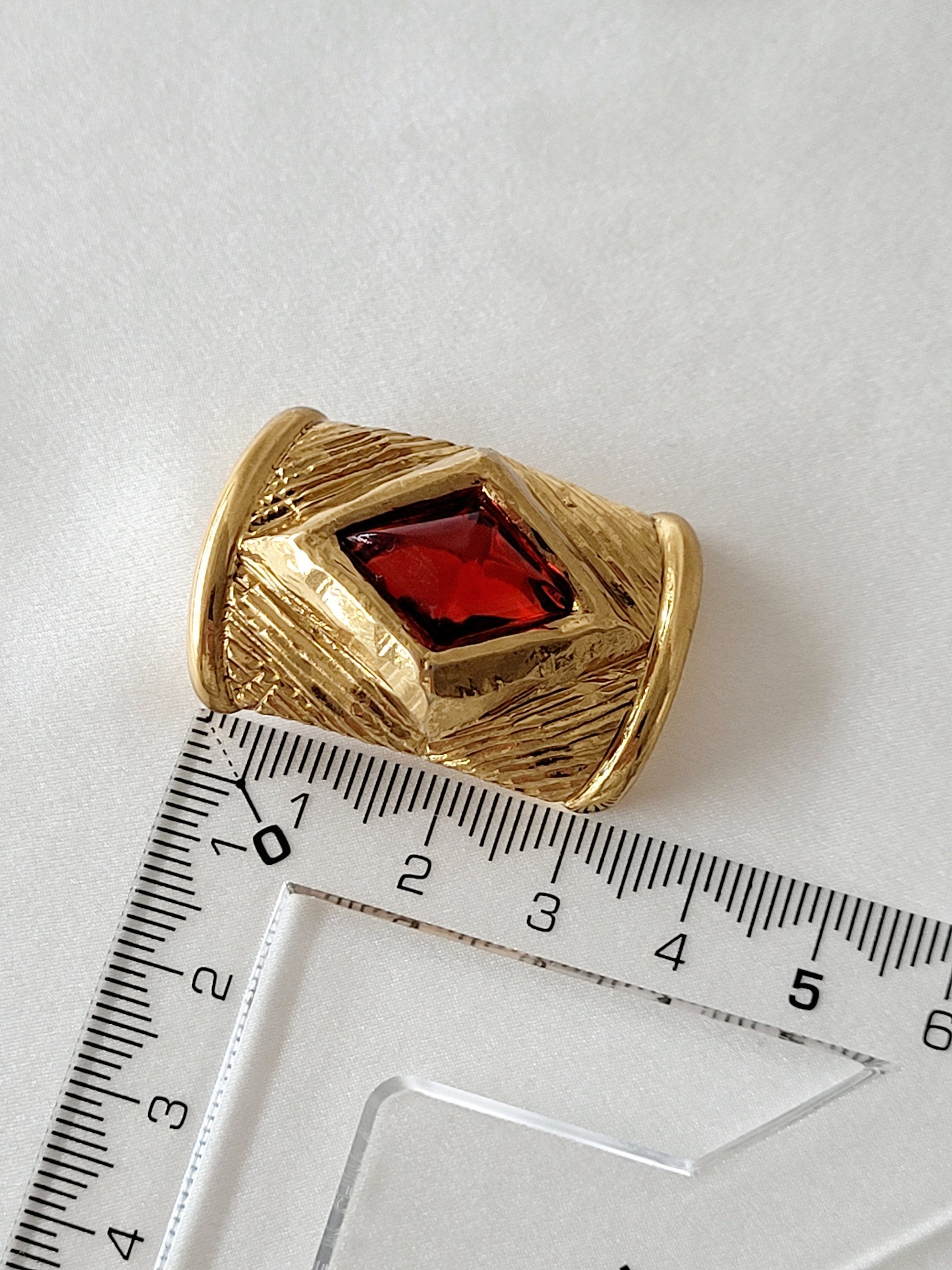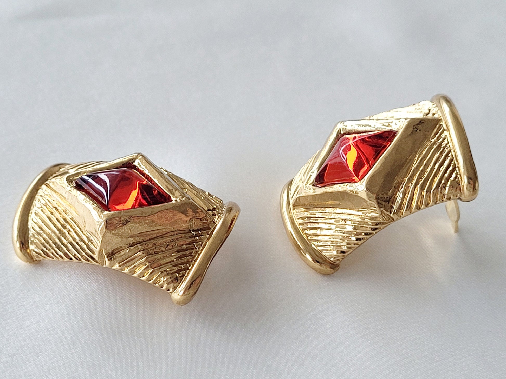 Très belles et authentiques grandes boucles d'oreilles vintage Scherrer Paris, en plaqué or martelé avec des cabochons rouges.