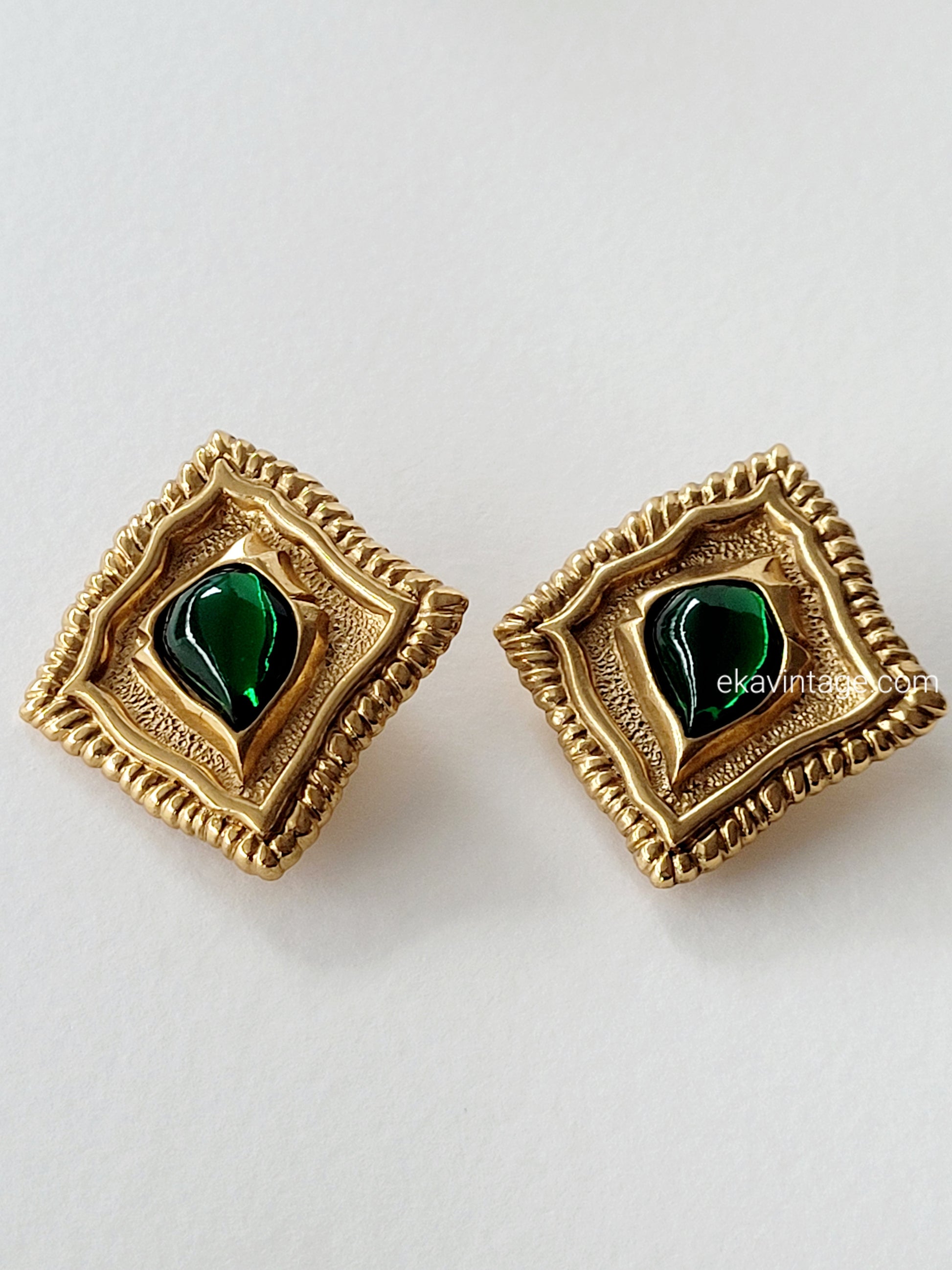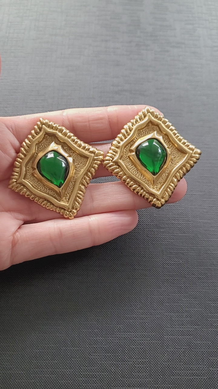 Très belles et authentiques grandes boucles d'oreilles vintage Scherrer Paris, en plaqué or avec des cabochons en lucite de couleur verte.