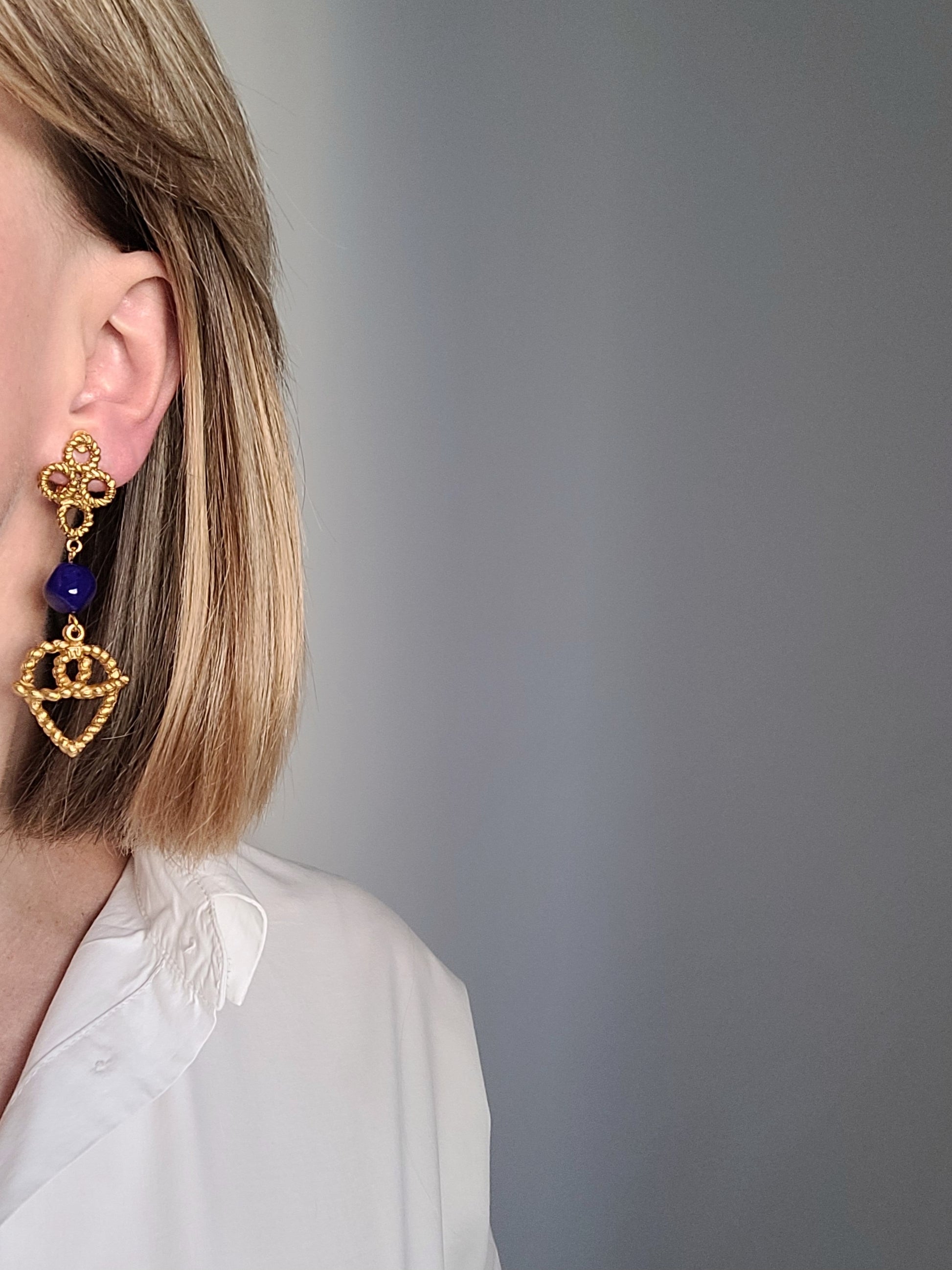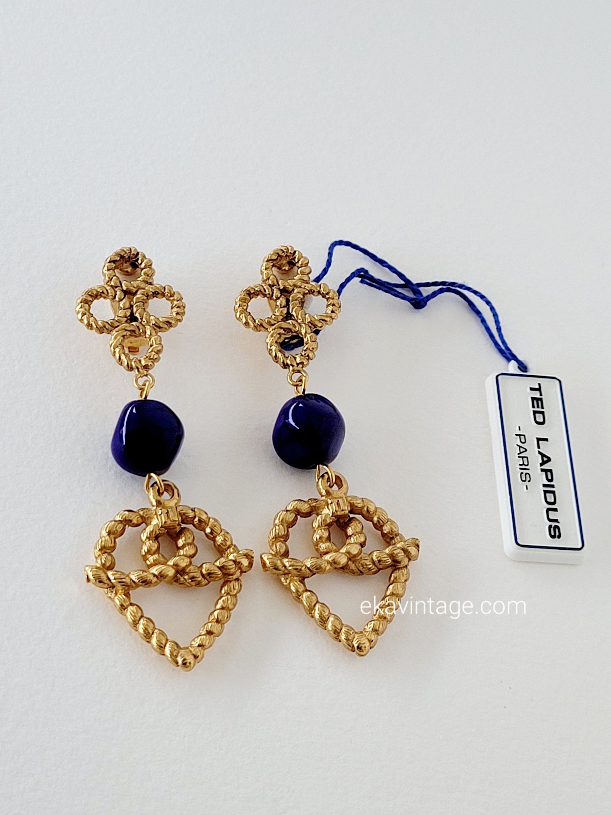 Très belles et authentiques boucles d'oreilles pendantes Ted Lapidus, en plaqué or et pierres naturelles.