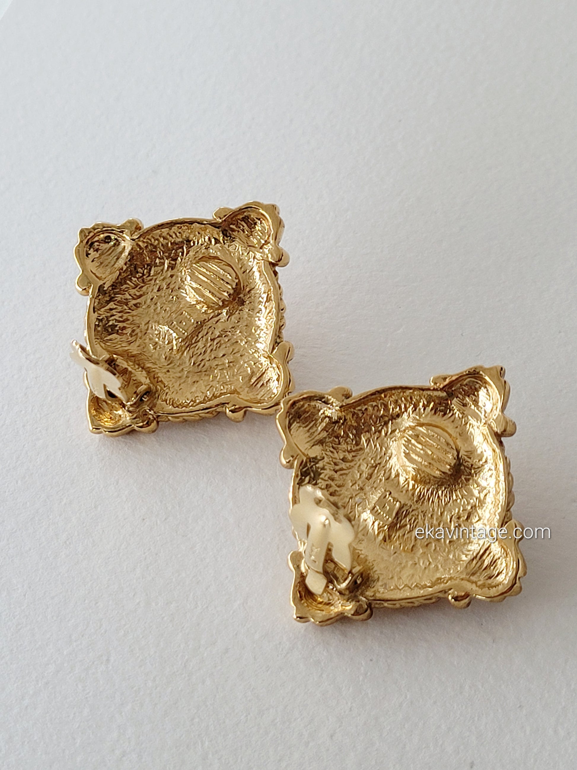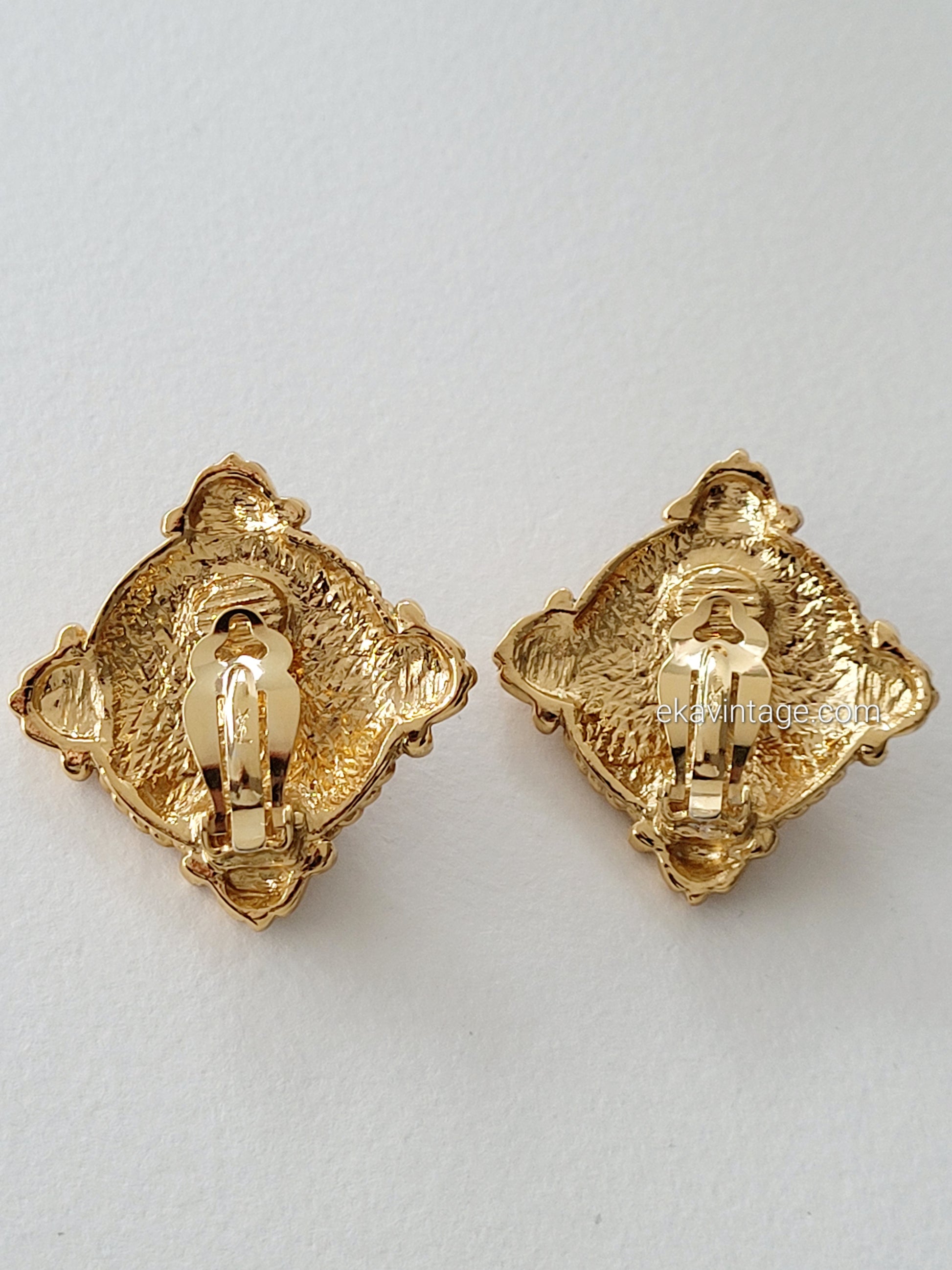 Très belles et authentiques boucles d'oreilles vintage Yves Saint Laurent, en plaqué or avec des cabochons en verre.