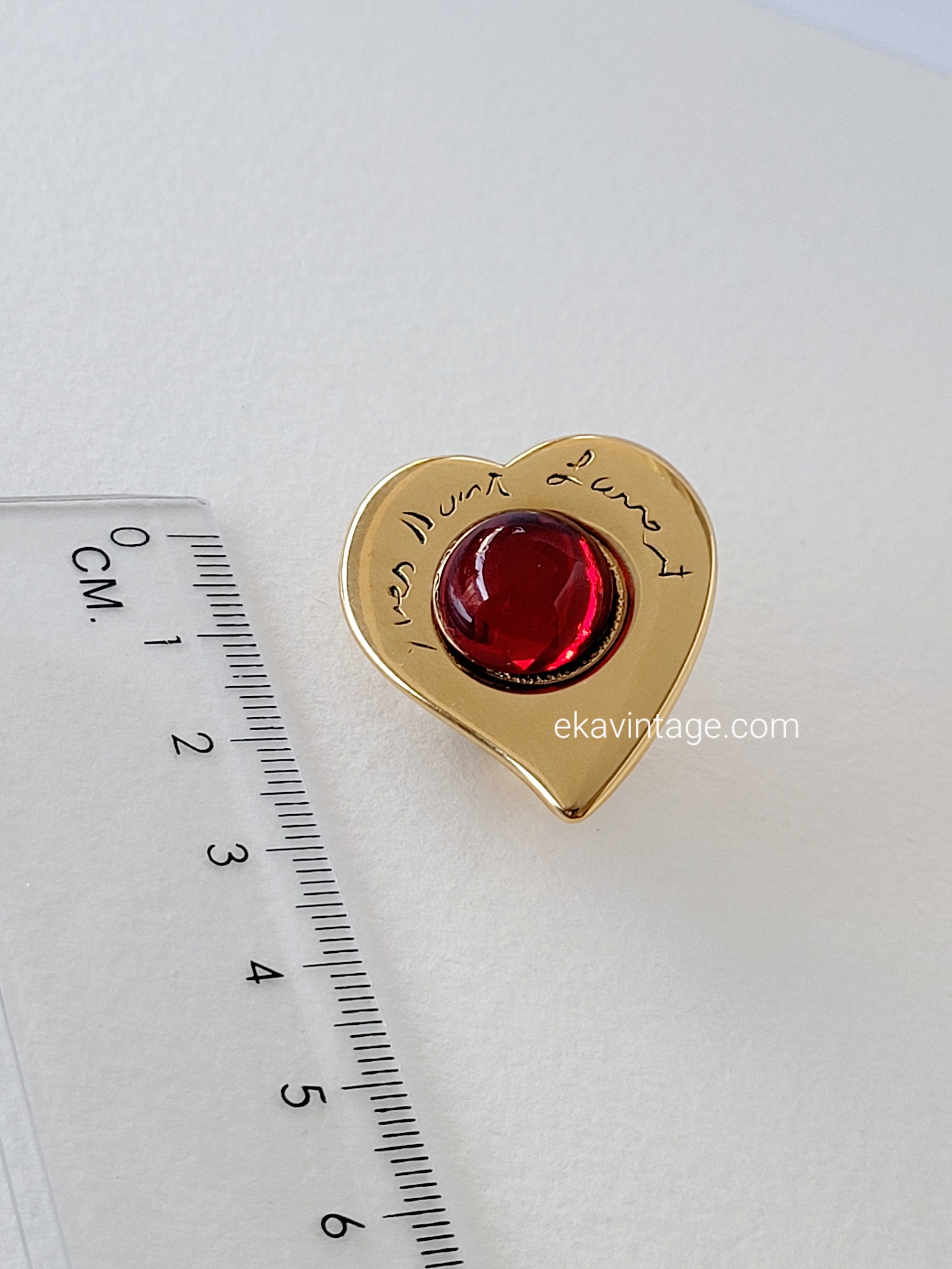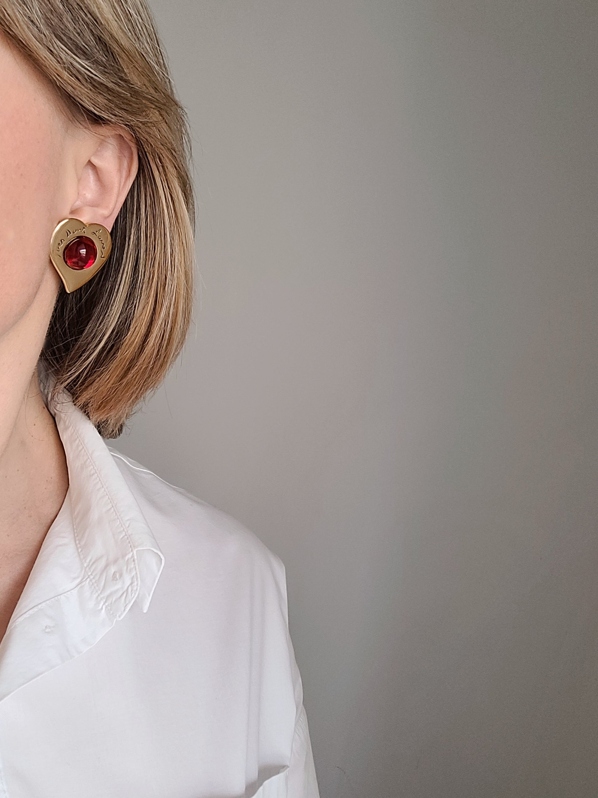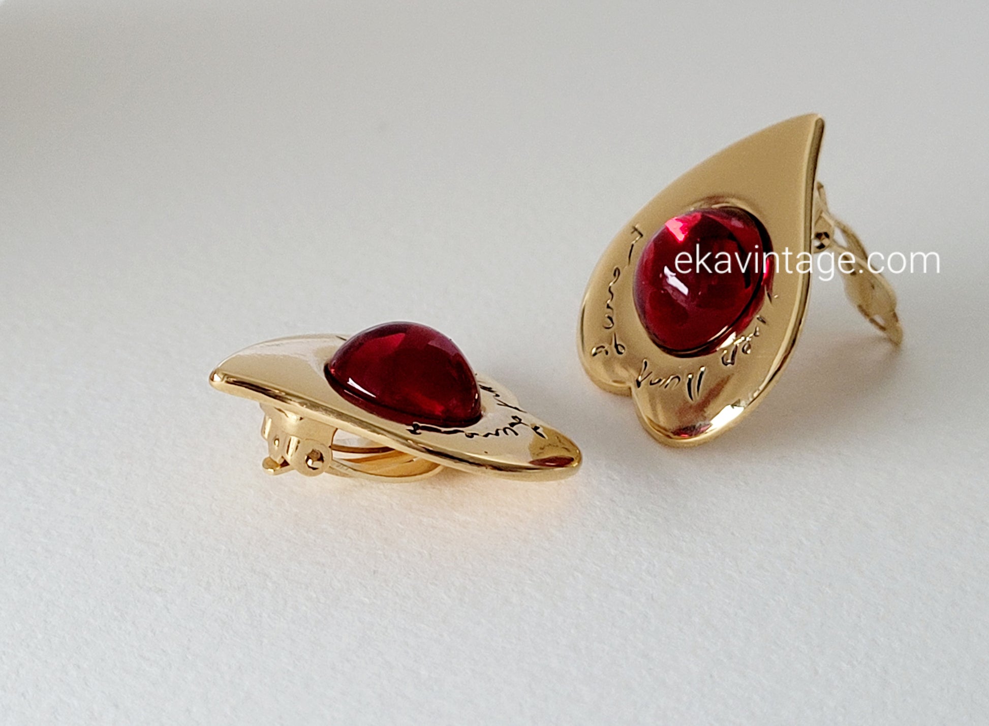Très belles et authentiques boucles d'oreilles vintage Yves Saint Laurent, en plaqué or, en forme de cœur avec une demi-sphère en couleur rouge et avec gravure "Yves Saint Laurent".