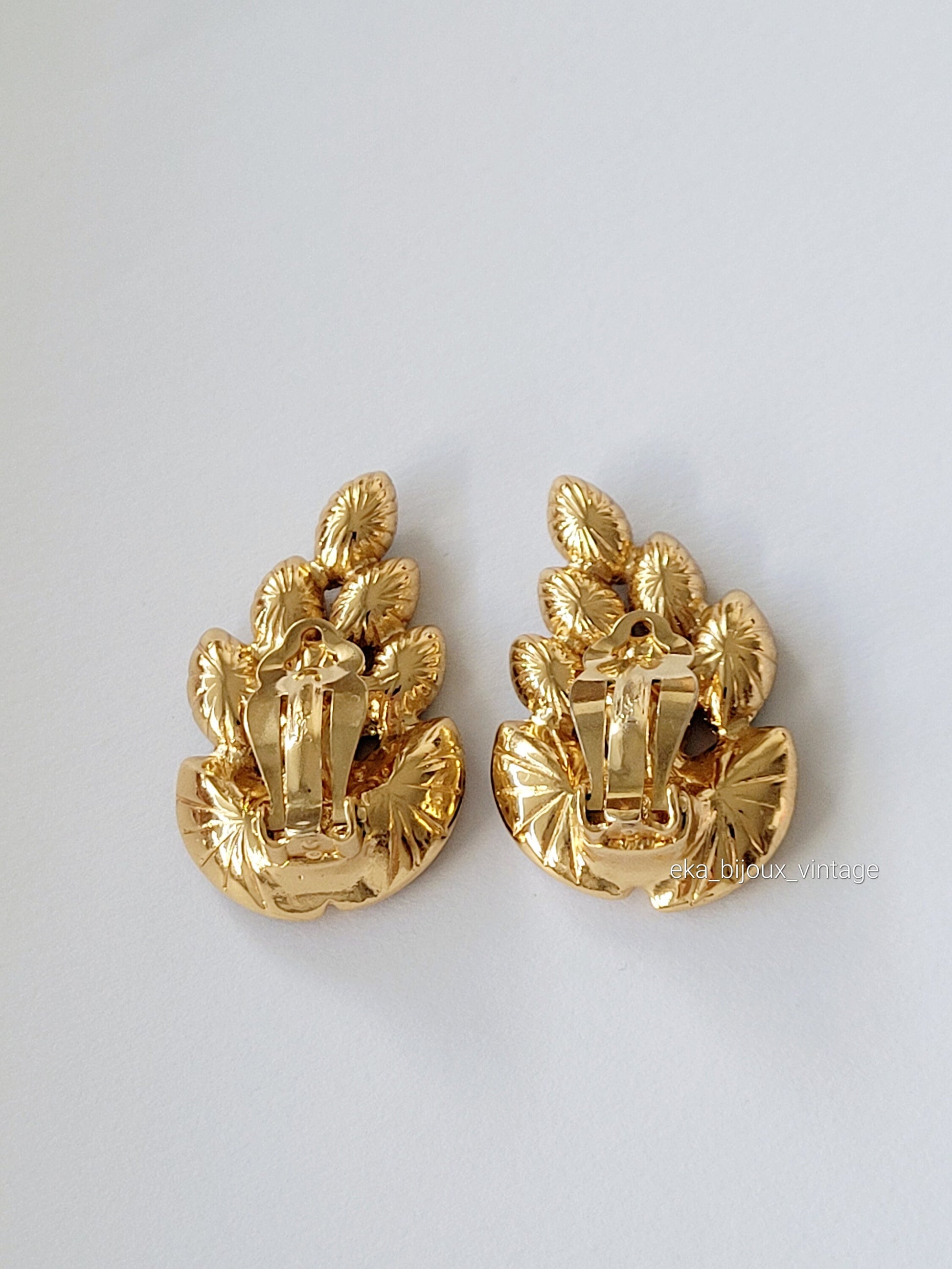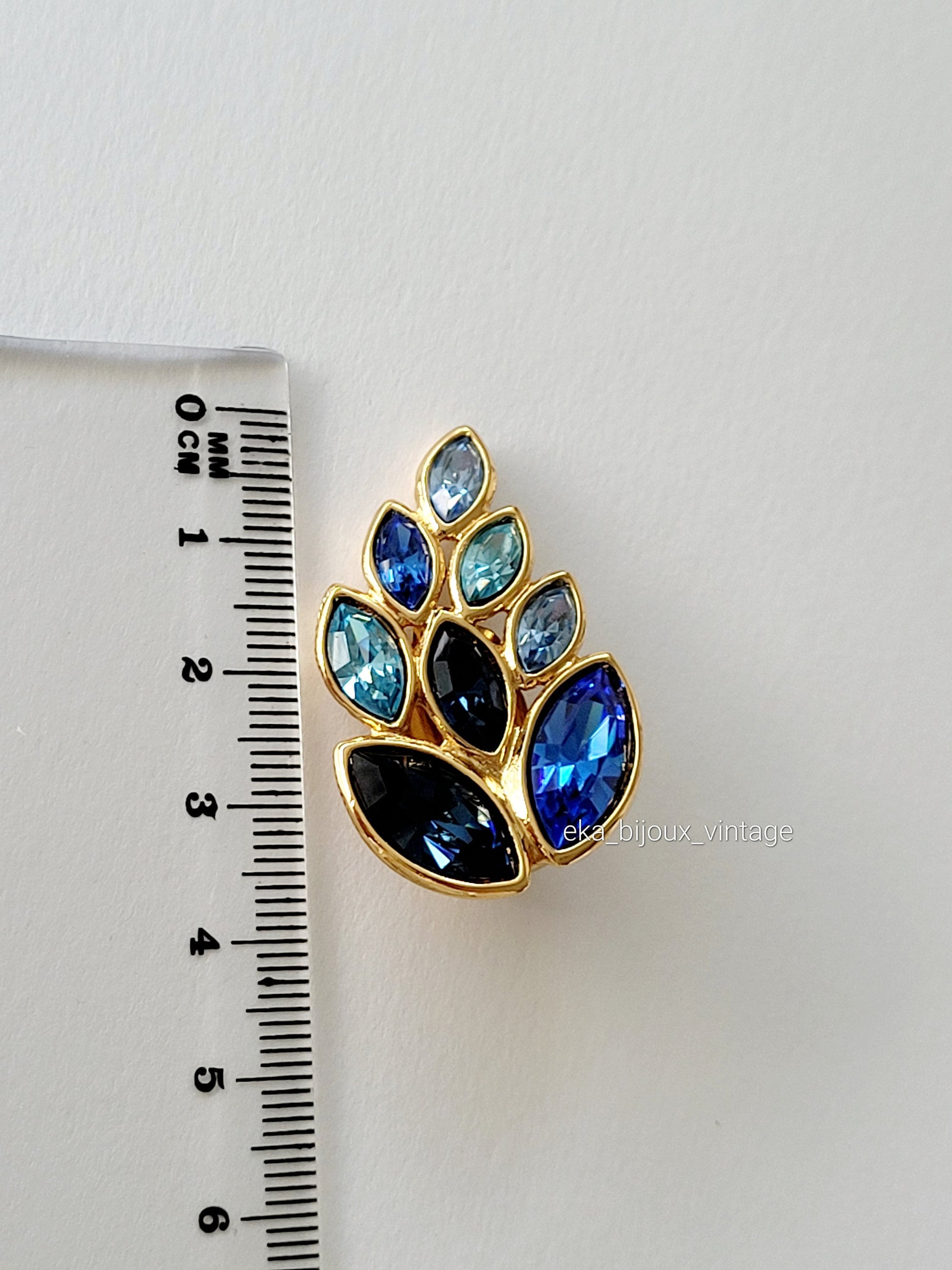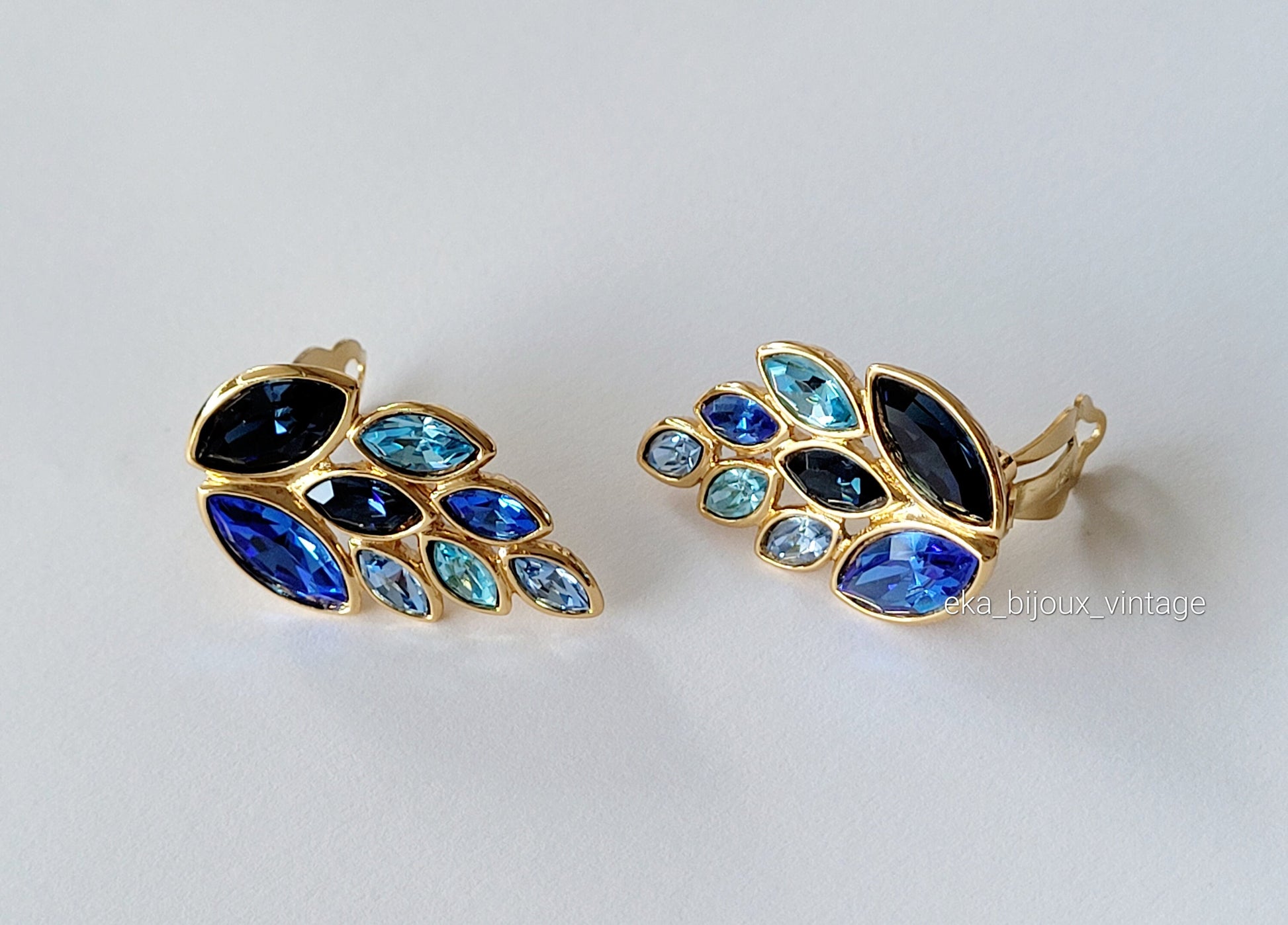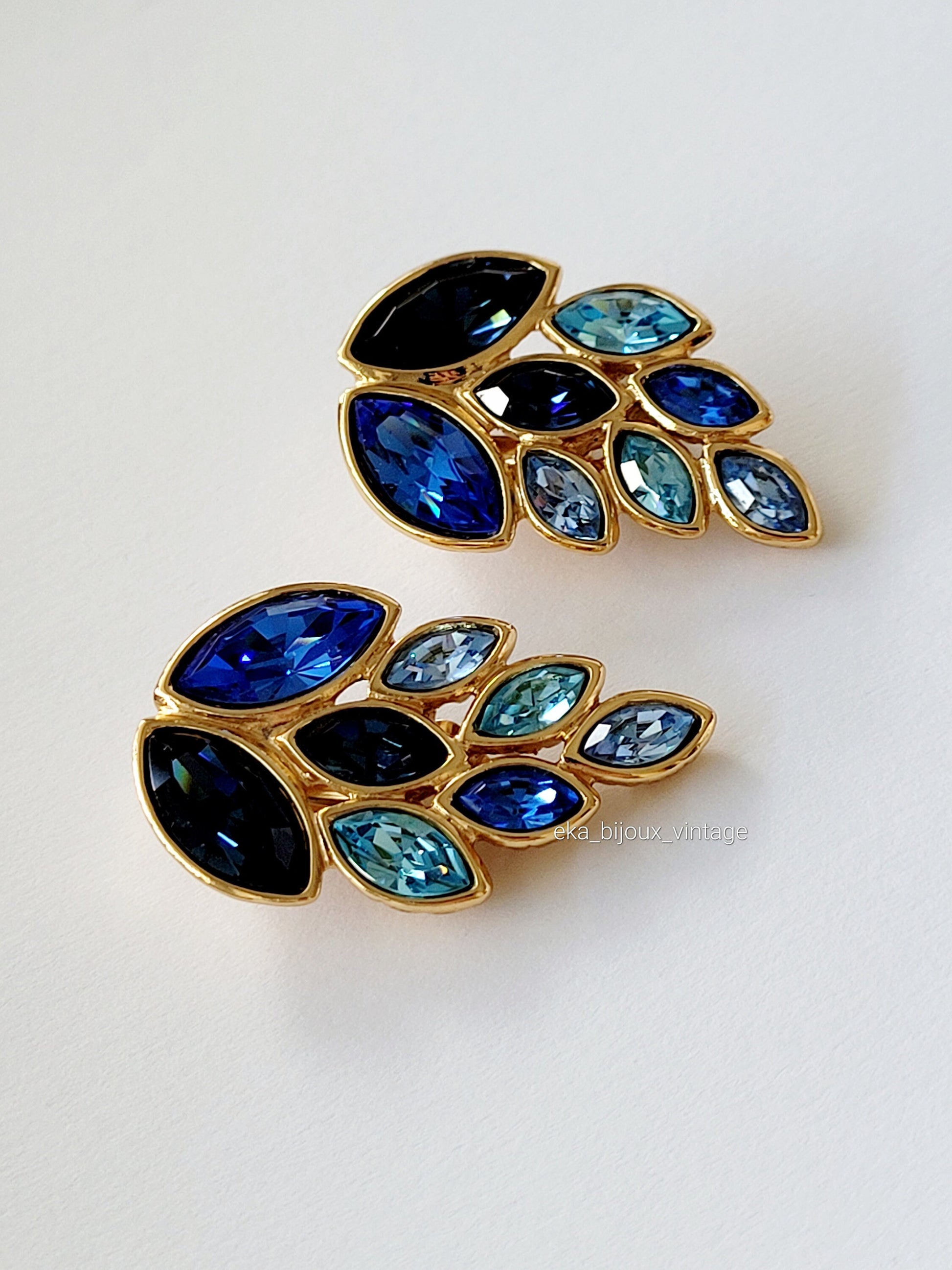 Authentiques boucles d'oreilles vintage Yves Saint Laurent en plaqué or, serties de cristaux de différentes nuances de bleu.