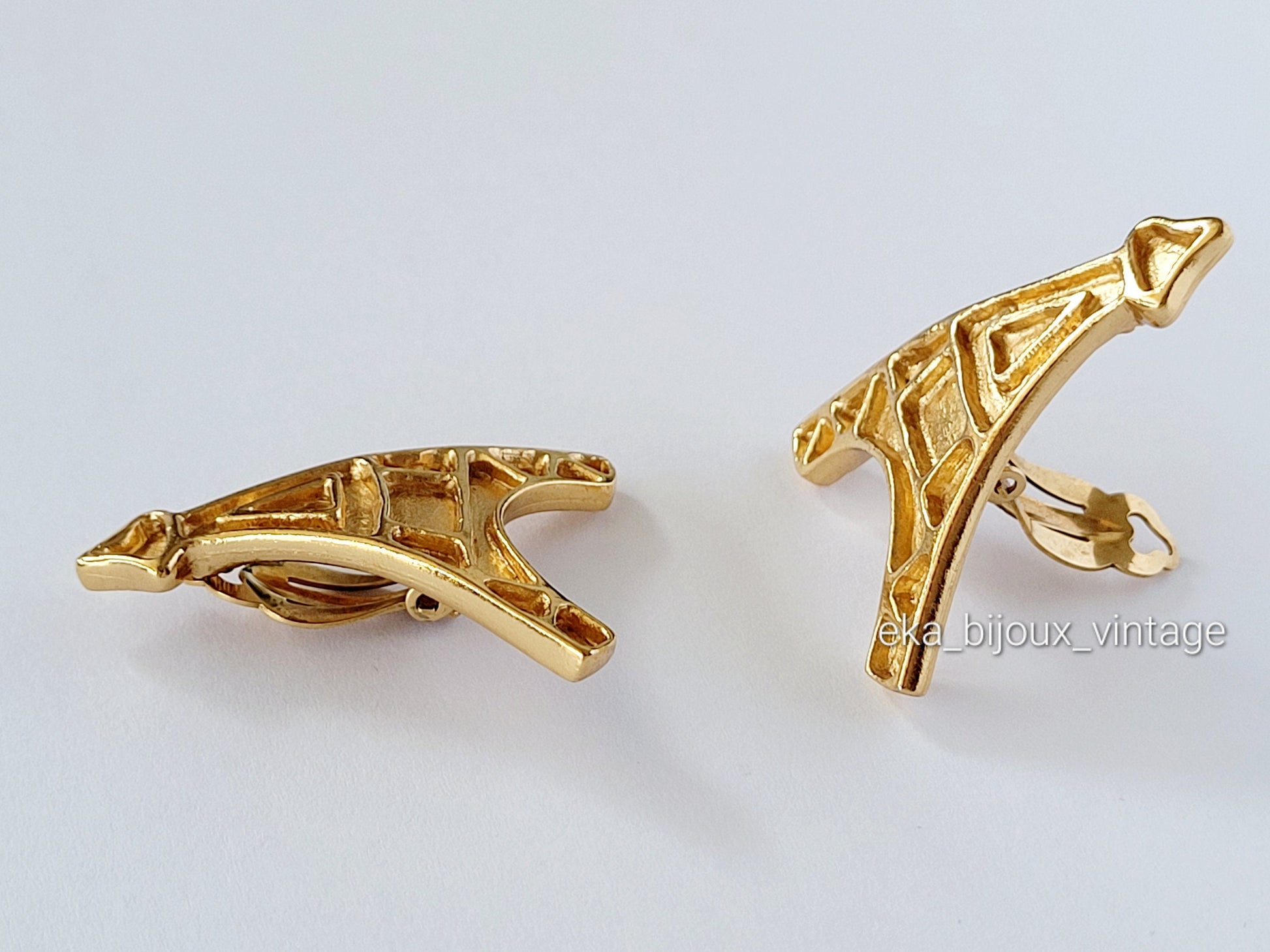 Très belles et authentiques boucles d'oreilles vintage Yves Saint Laurent, en plaqué or, en forme de Tour Eiffel.