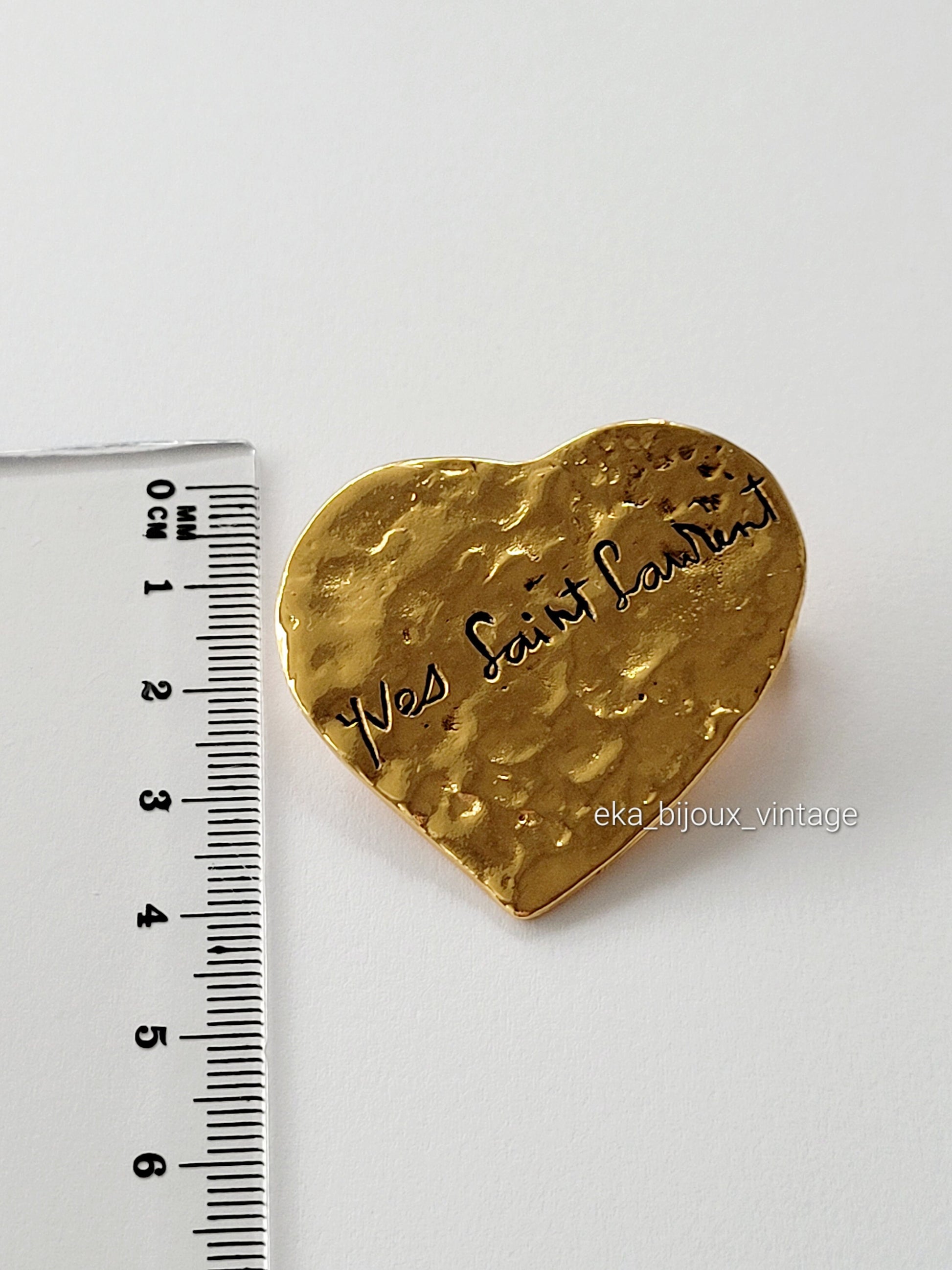 Authentique broche/pendentif Yves Saint Laurent vintage, en forme de cœur, en plaqué or martelé, avec gravure "Yves Saint Laurent".