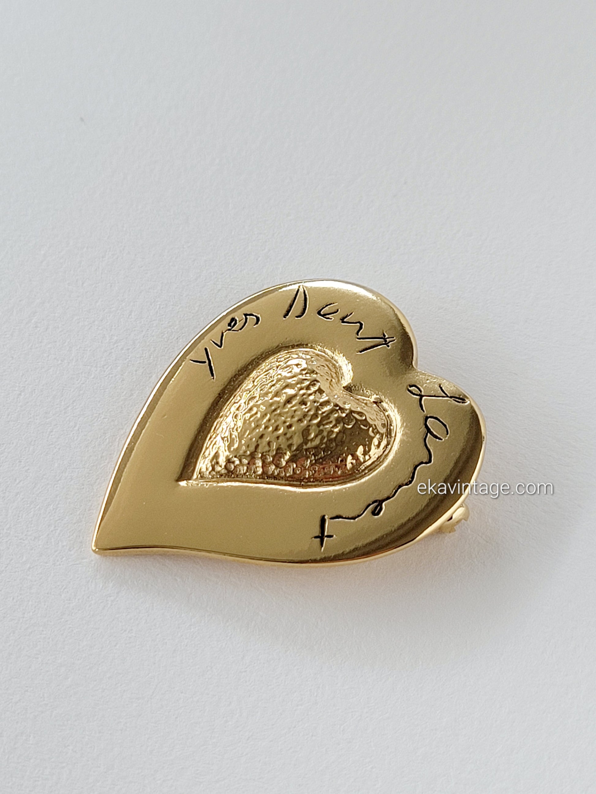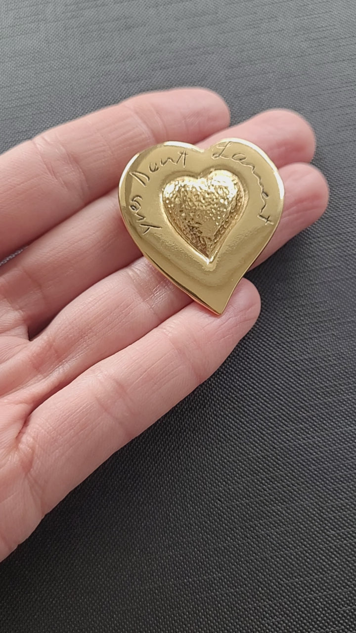 Authentique et magnifique broche en plaqué or Yves Saint Laurent en forme de cœur, avec gravure "Yves Saint Laurent".