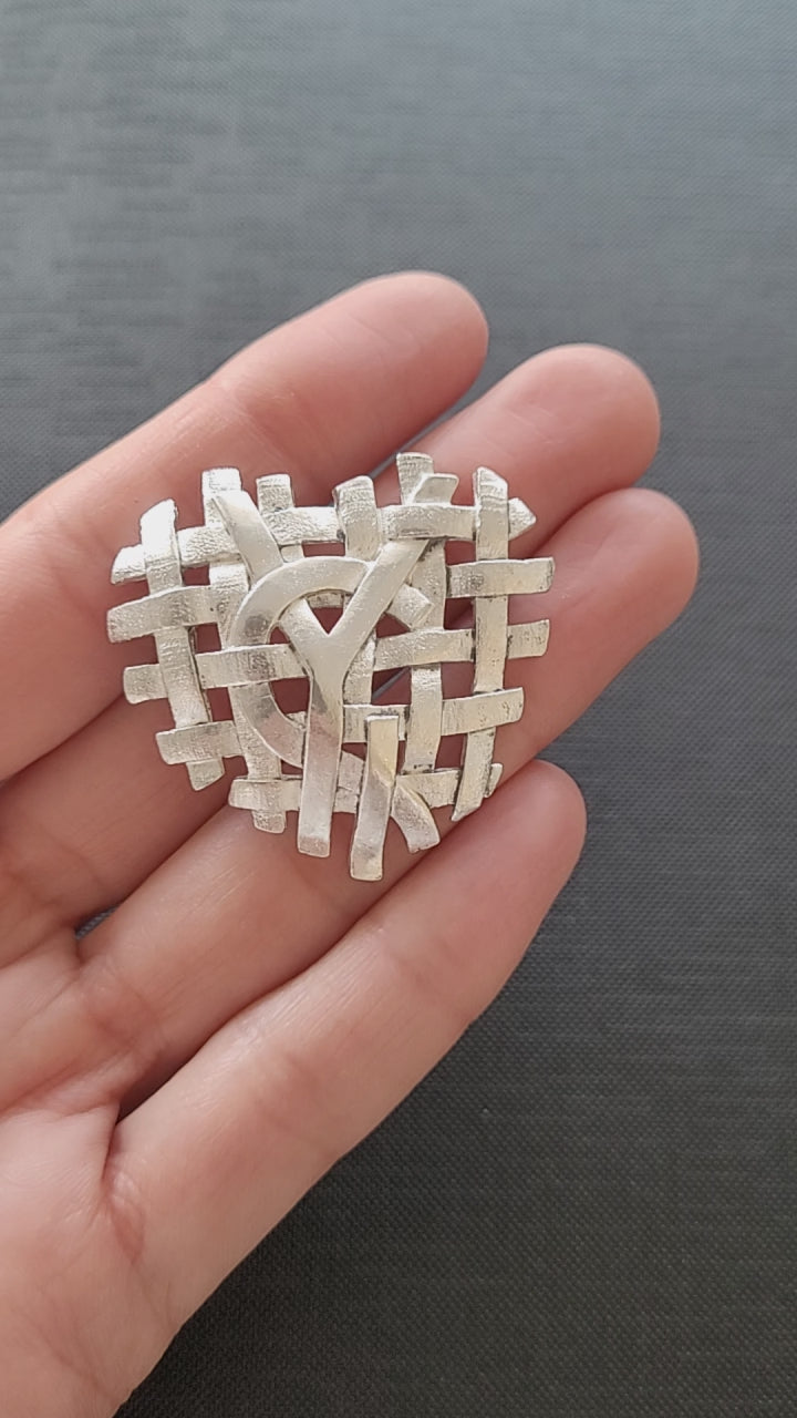 Authentique broche Yves Saint Laurent vintage, en forme de cœur, en plaqué argent.