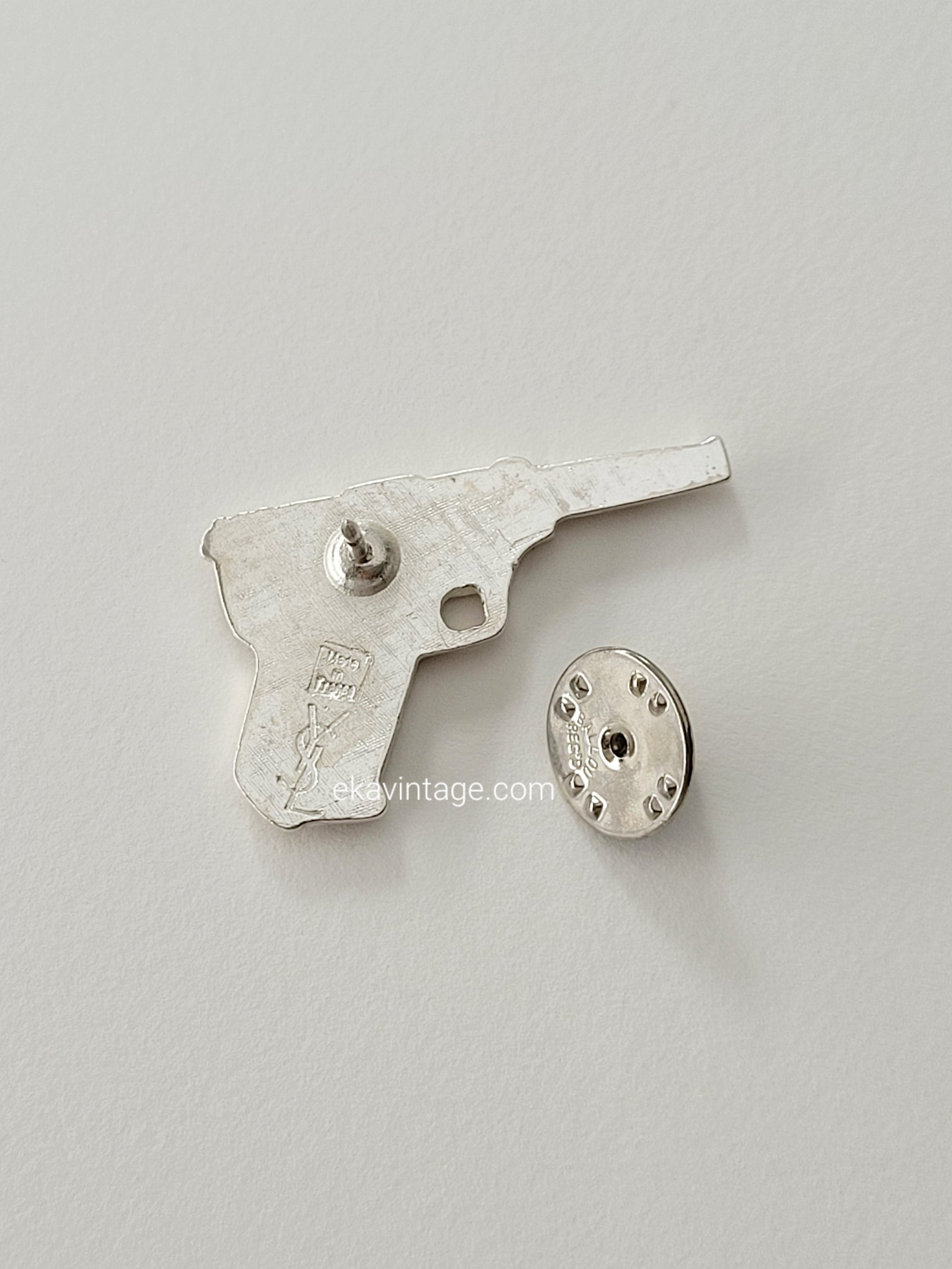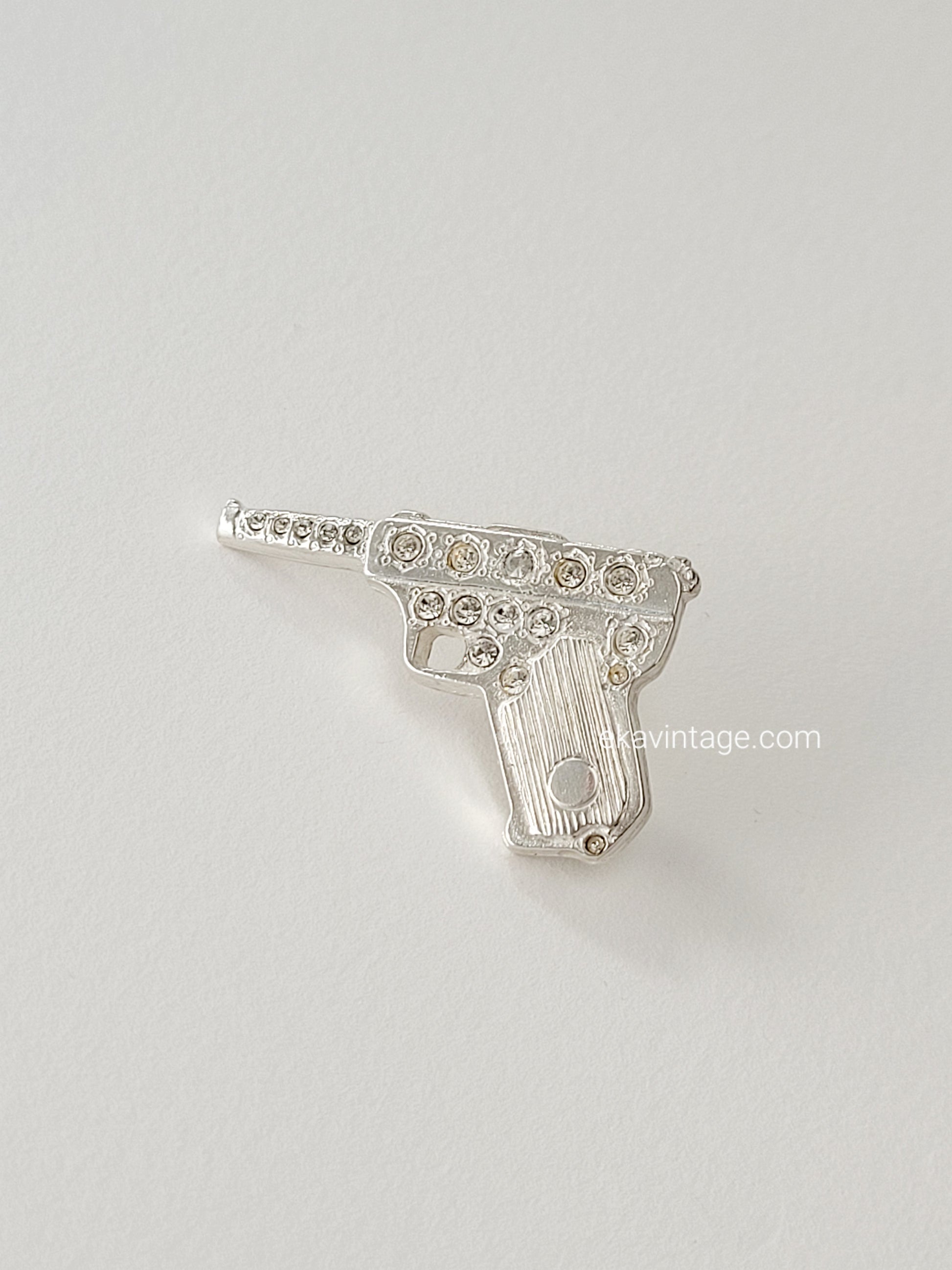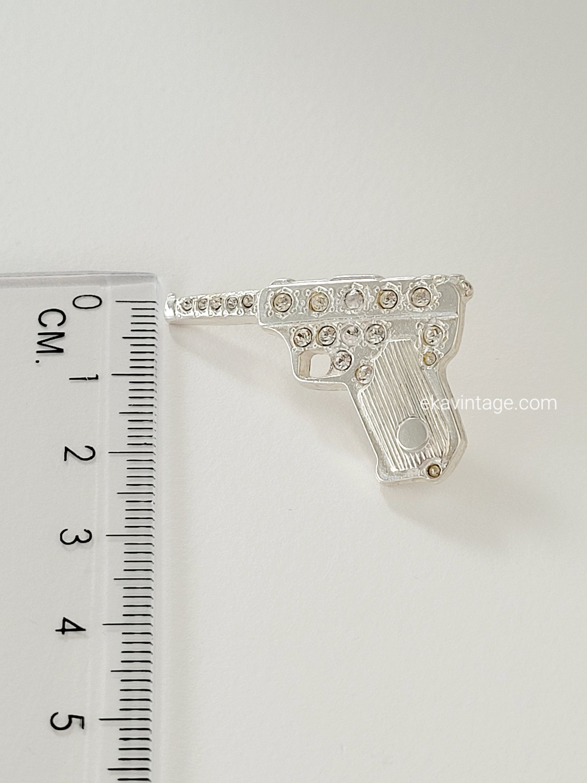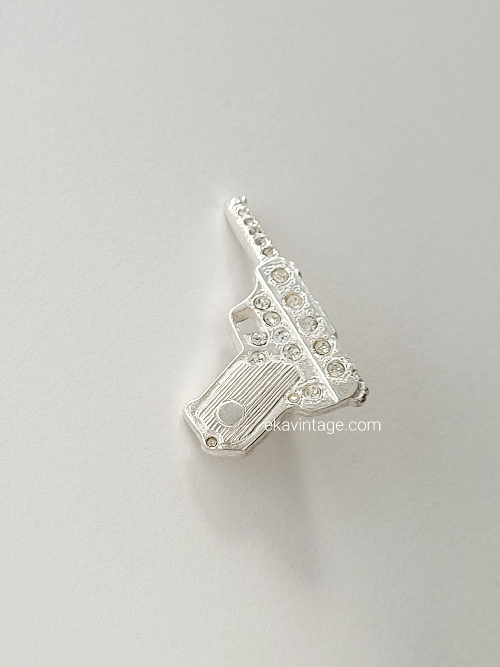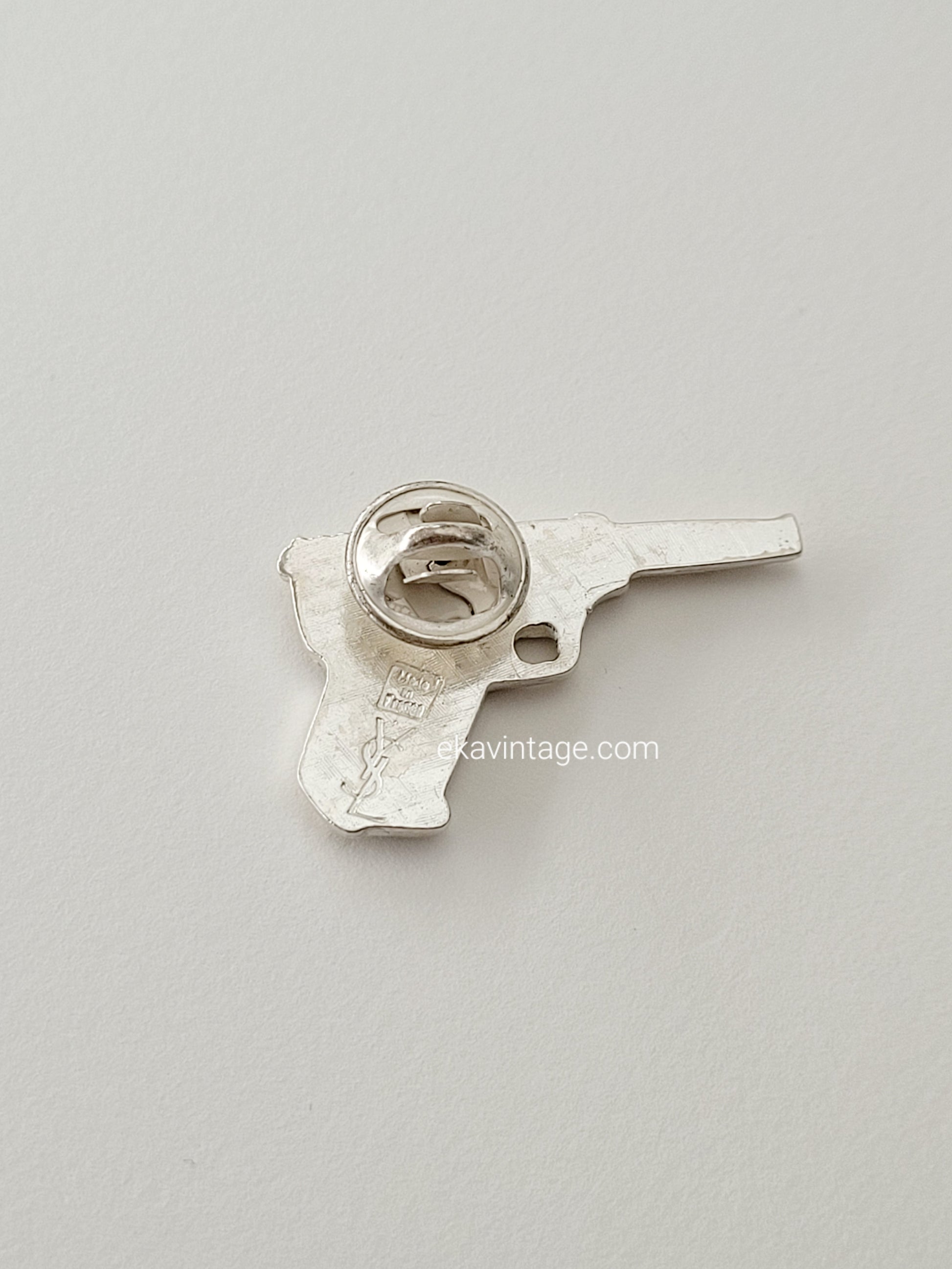 Superbe et authentique Pin's Yves Saint Laurent en forme de revolver, serti de strass, créé dans les années 1980.